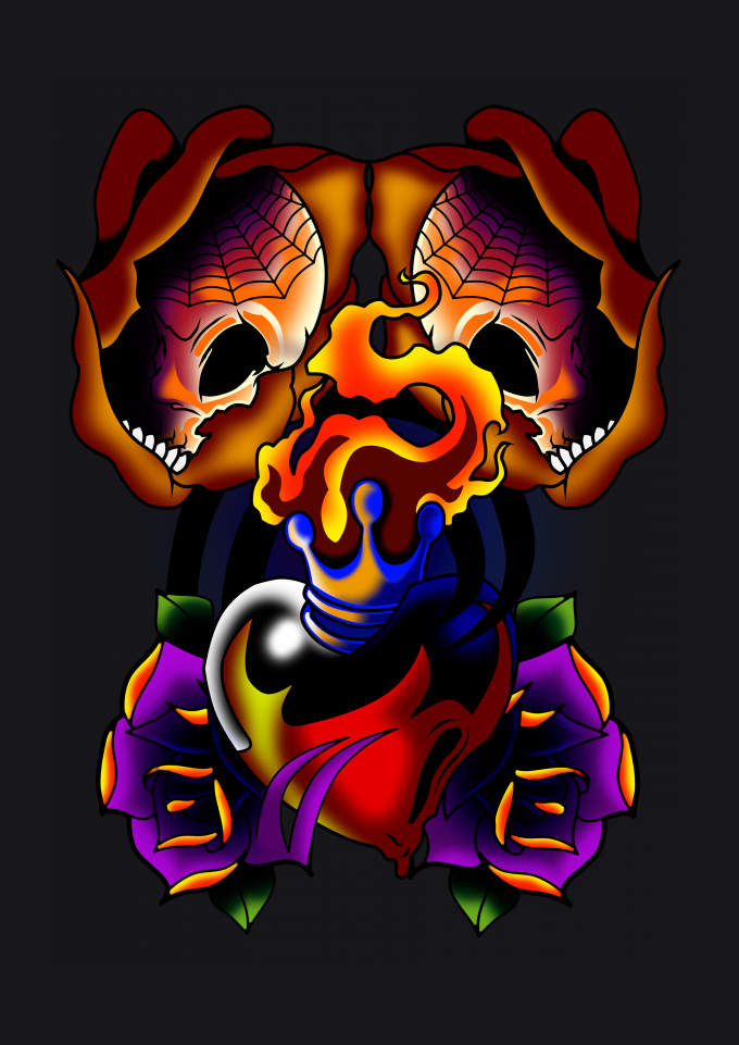 camiseta preta, caveira flor, coração, fogo, coroa, tatuagem, rock n roll, heavy metal, colorido