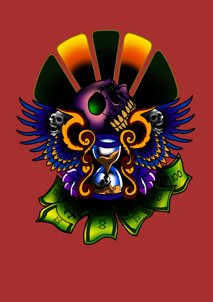camiseta preta, caveira, dinheiro, ampulheta, asas, tatuagem, flor, rock n roll, heavy metal, colorido