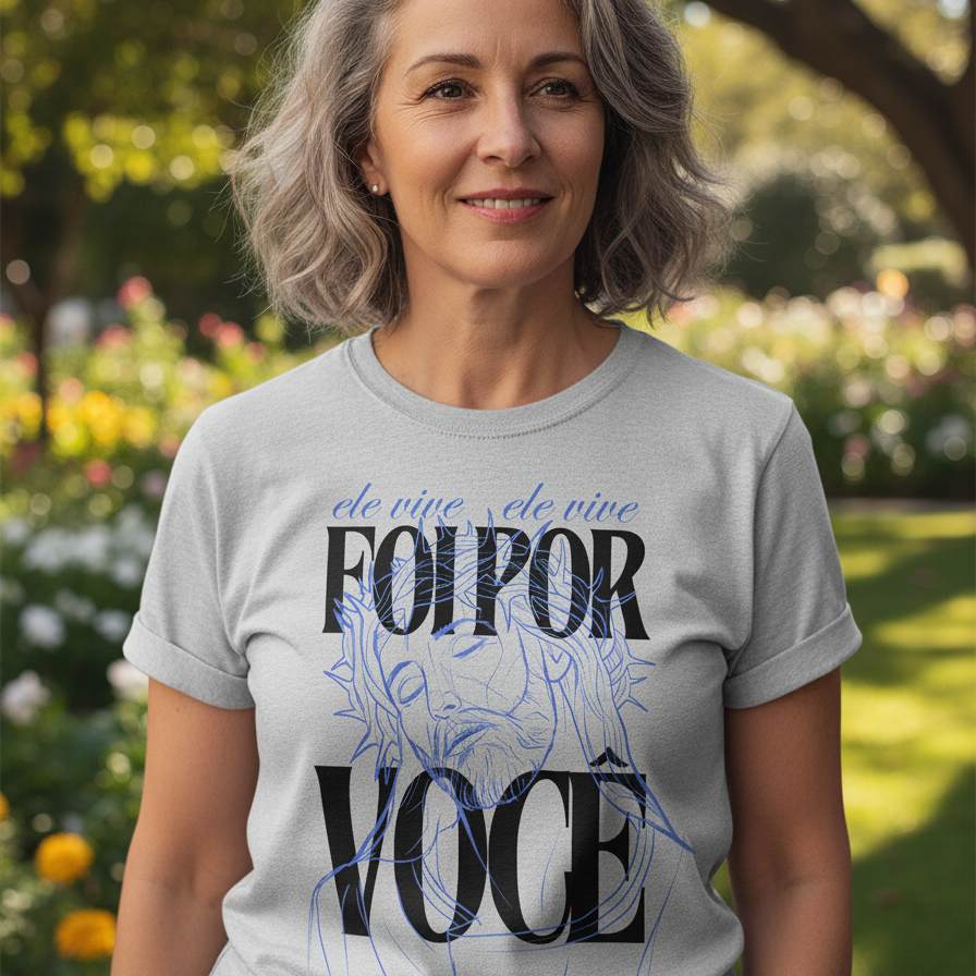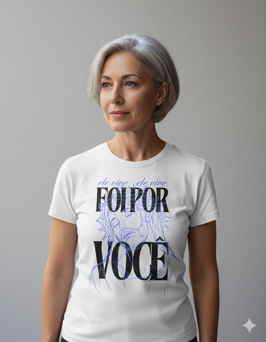 Leve a cruz de Cristo no peito e sinta o abraço de Jesus em cada detalhe. Adquira a sua camiseta "Foi Por Você - Amor na Cruz" e seja um farol de gratidão no mundo. Uma peça que conforta o coração e inspira a alma. Compre agora e vista o verdadeiro amor!
