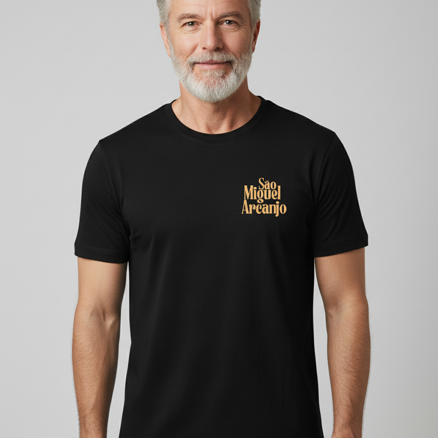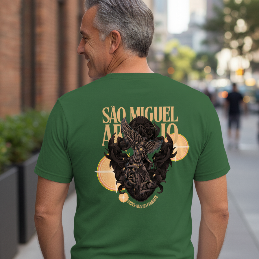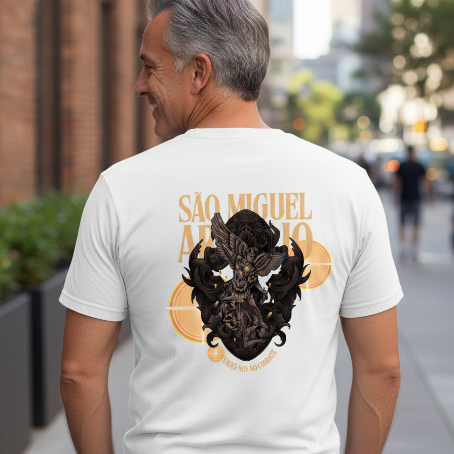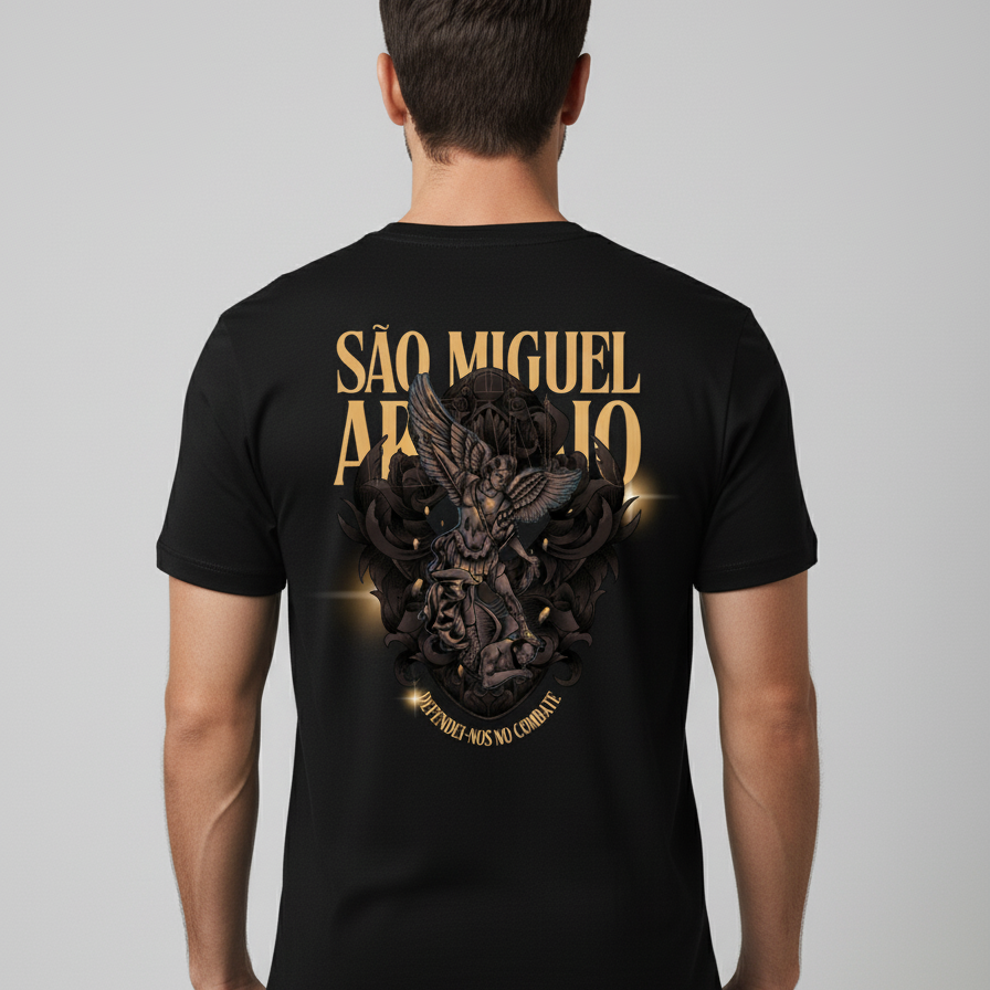Vista-se com a proteção divina do Arcanjo Miguel. A camiseta Escudo de Miguel é um lembrete visual e espiritual da sua fé no Príncipe da Milícia Celeste. Esta peça foi criada para você que busca refúgio, força e coragem nas batalhas diárias, sabendo que tem um poderoso intercessor ao seu lado. Mais que uma roupa, é um amuleto de fé.