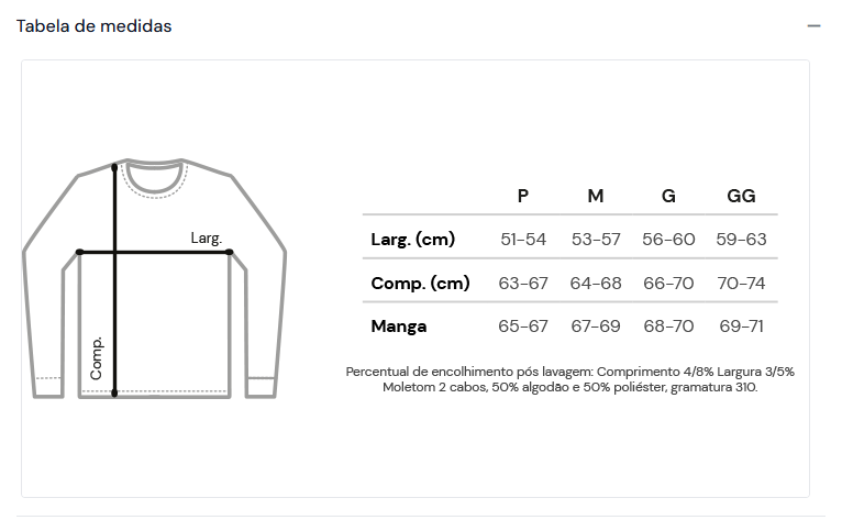 Composição: 50% algodão e 50% poliéster. Possui interior flanelado, punho e barra em retilínea.