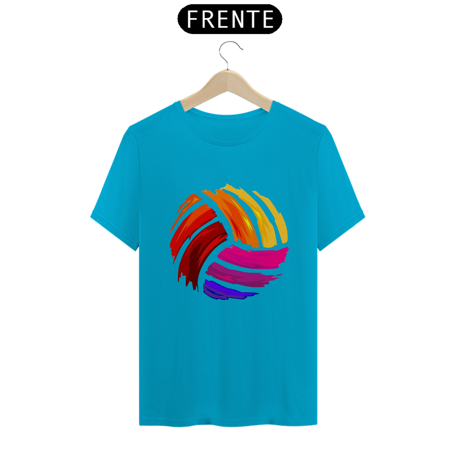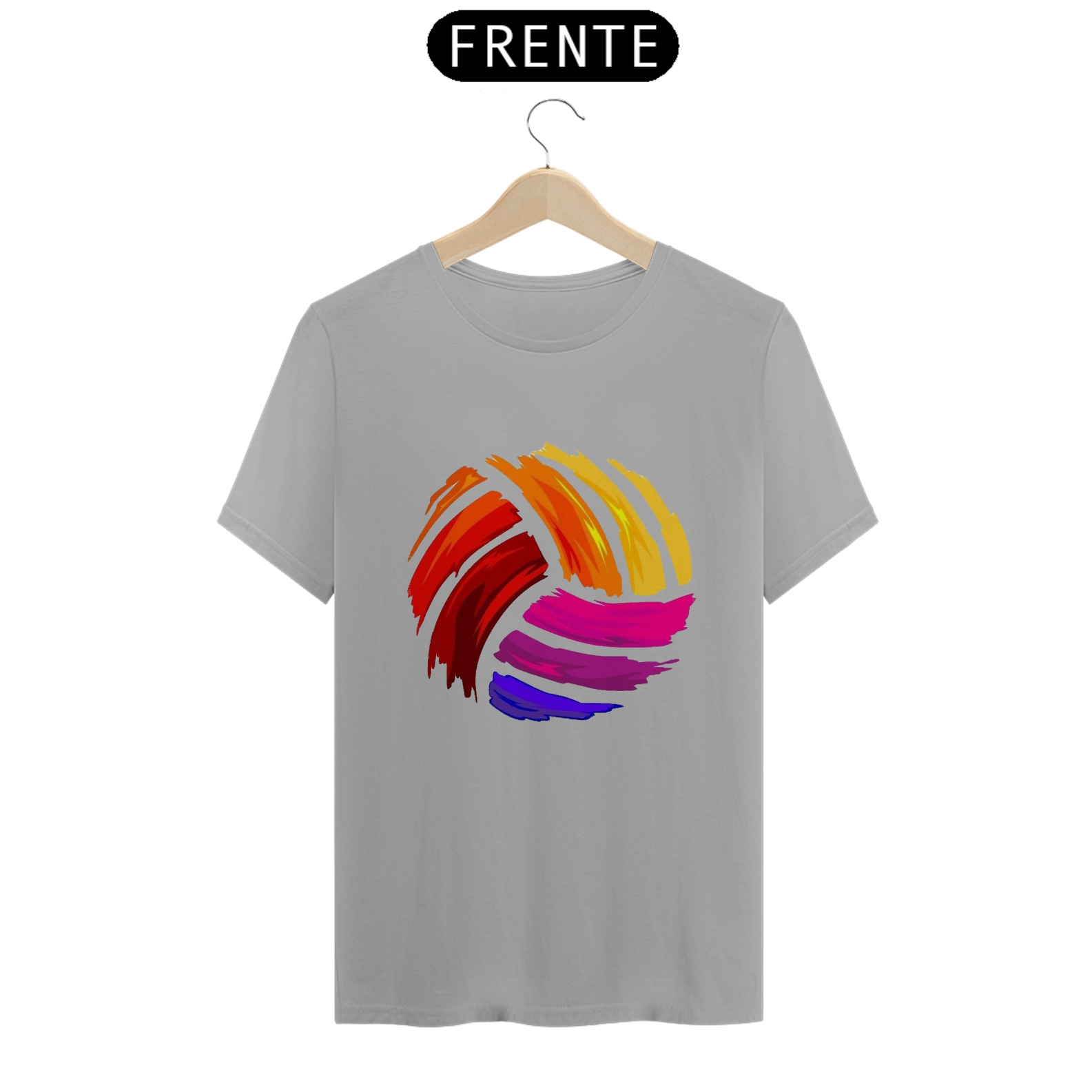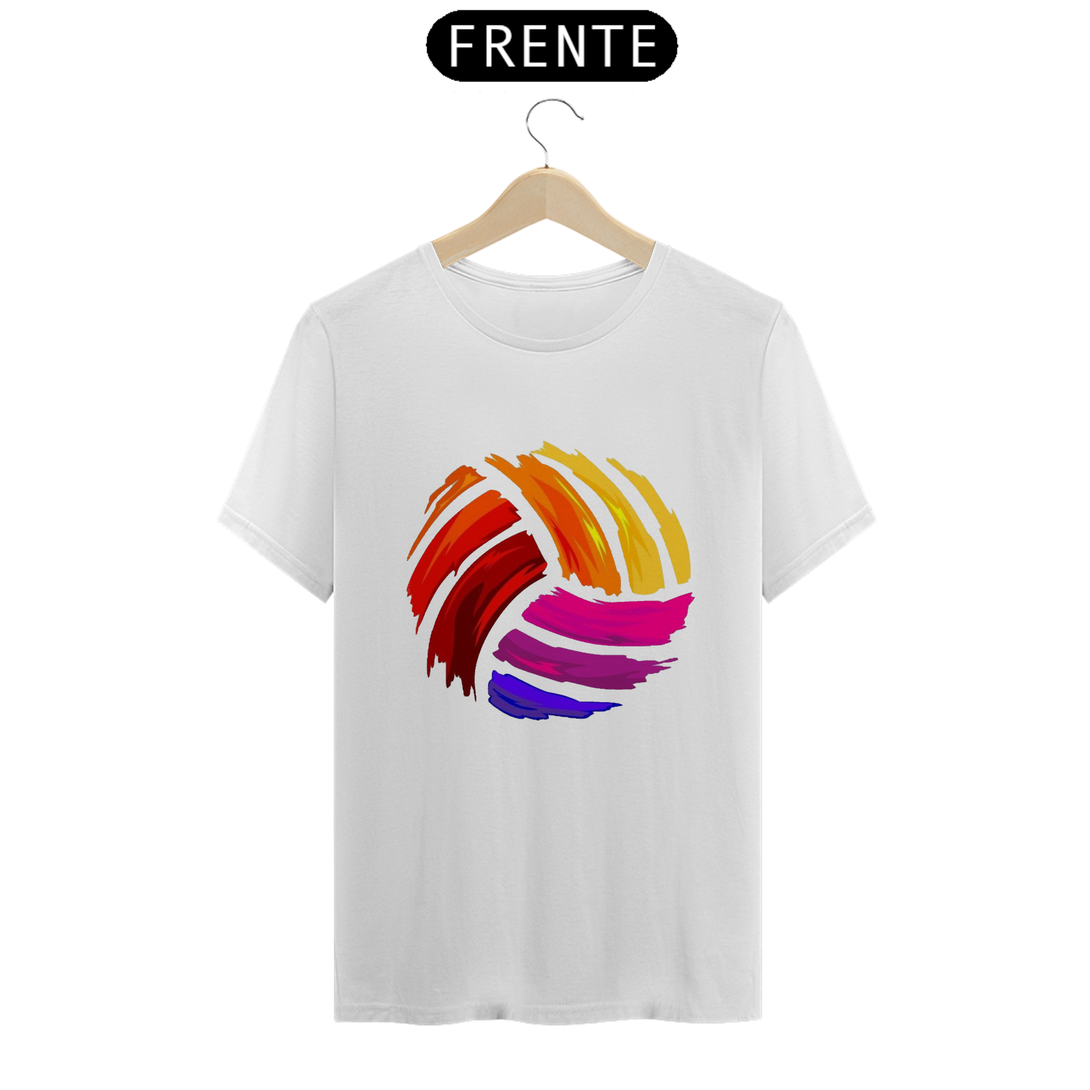 Uma camiseta, com uma estampa grande e colorida de uma bola de vôlei no centro. A estampa é vibrante e detalhada. É uma peça divertida e moderna para quem ama o vôlei e gosta de se destacar com estilo.