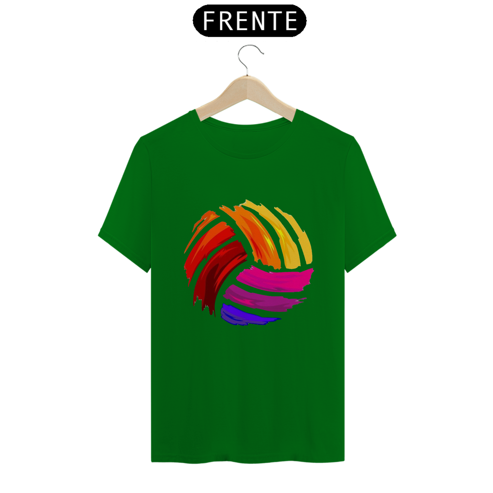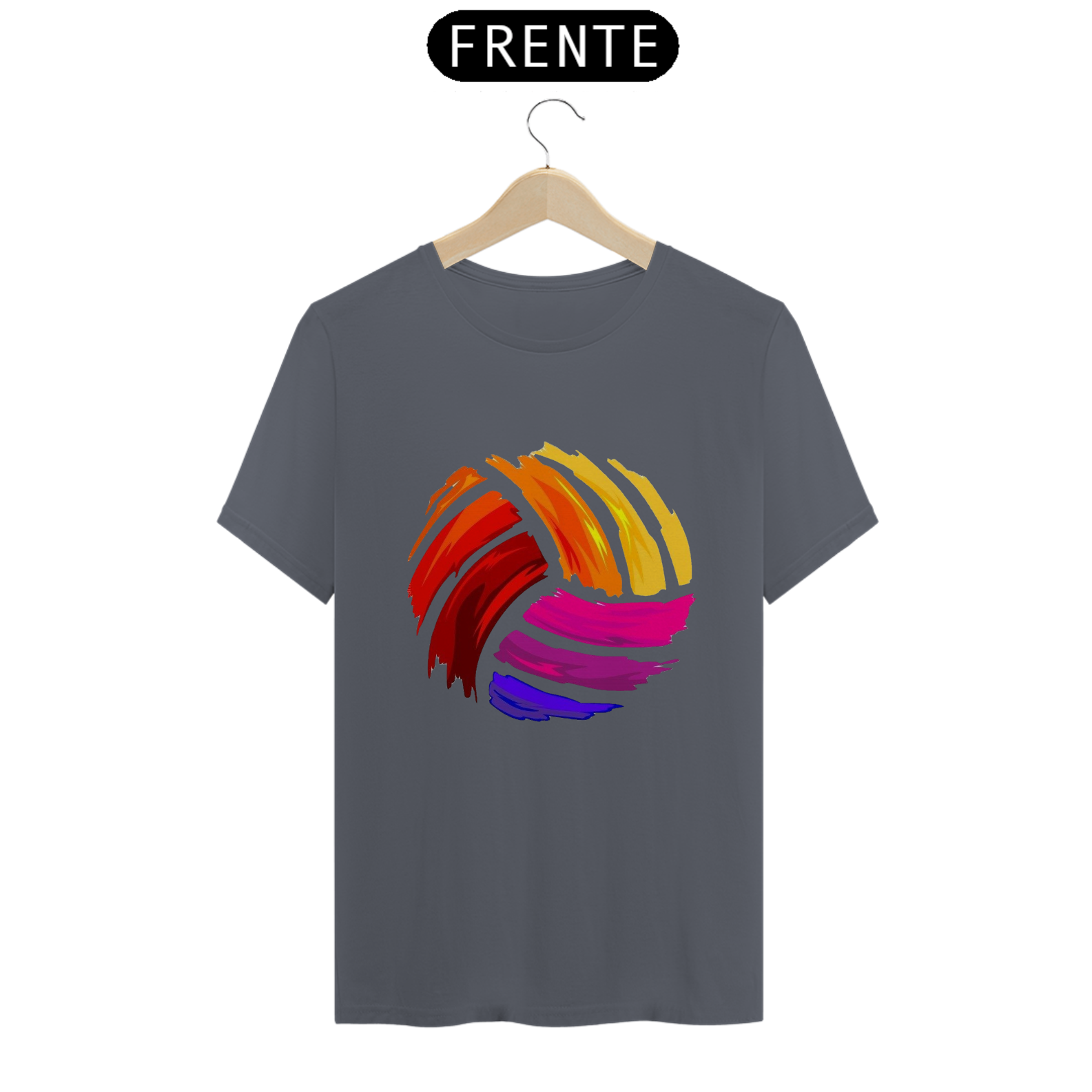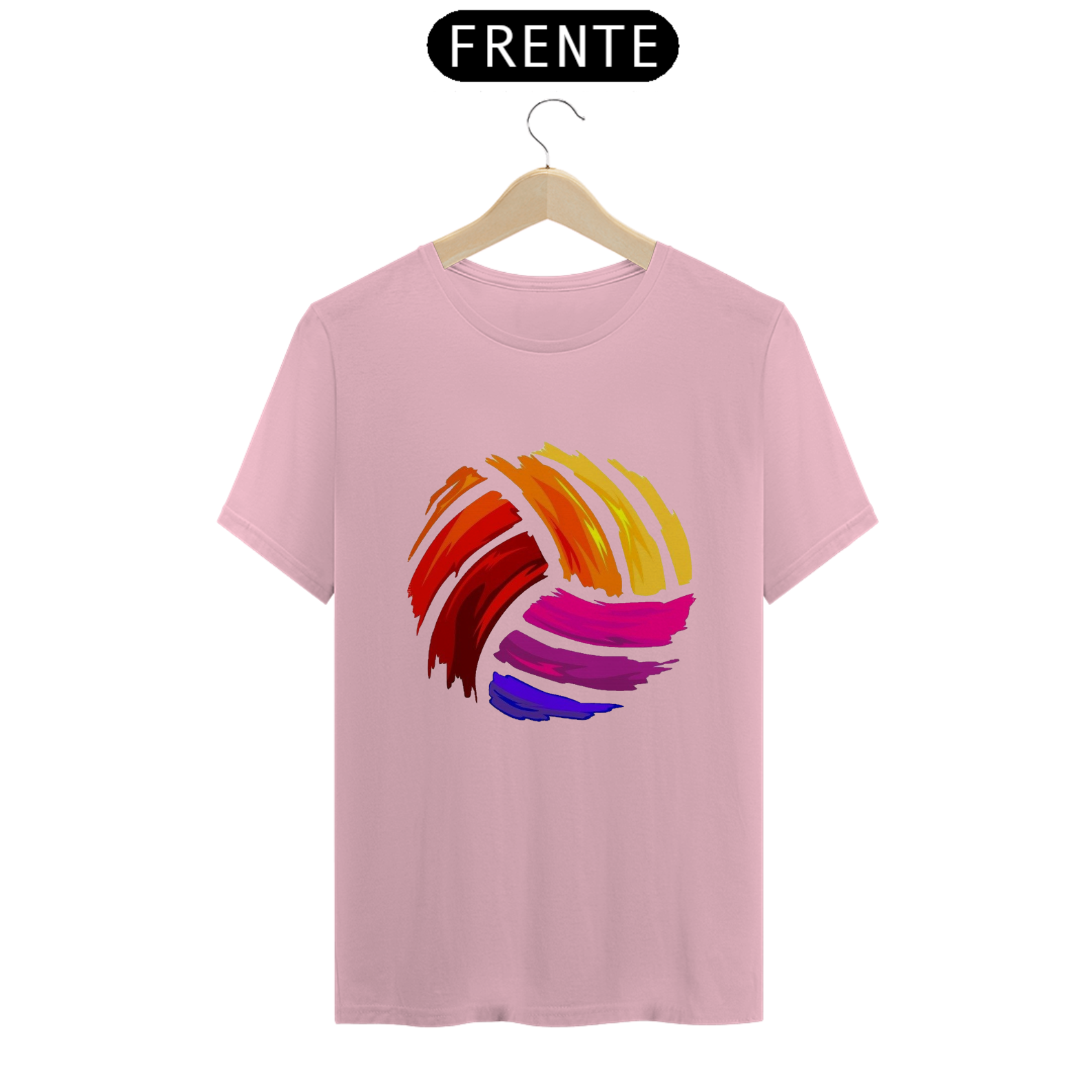 Uma camiseta, com uma estampa grande e colorida de uma bola de vôlei no centro. A estampa é vibrante e detalhada. É uma peça divertida e moderna para quem ama o vôlei e gosta de se destacar com estilo.