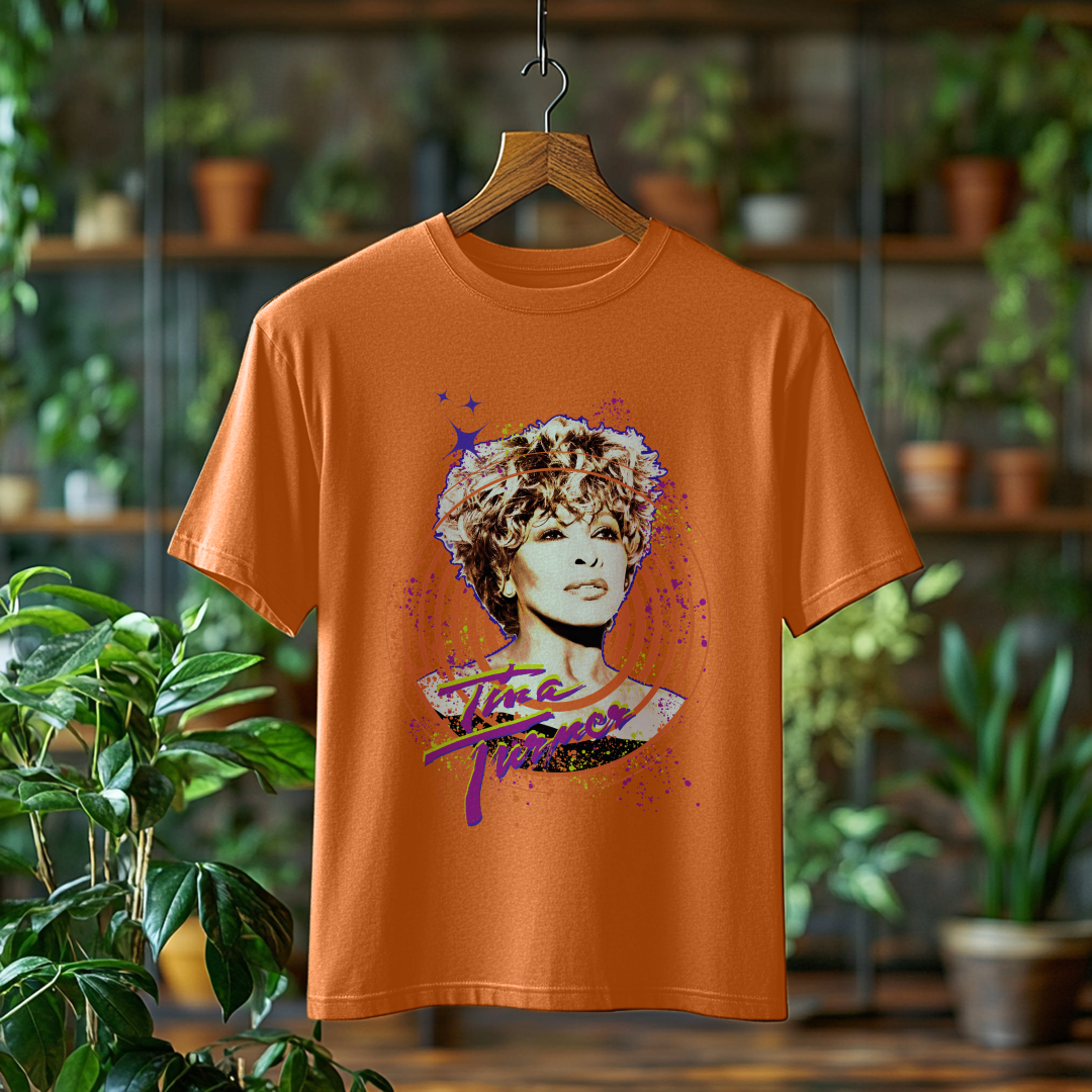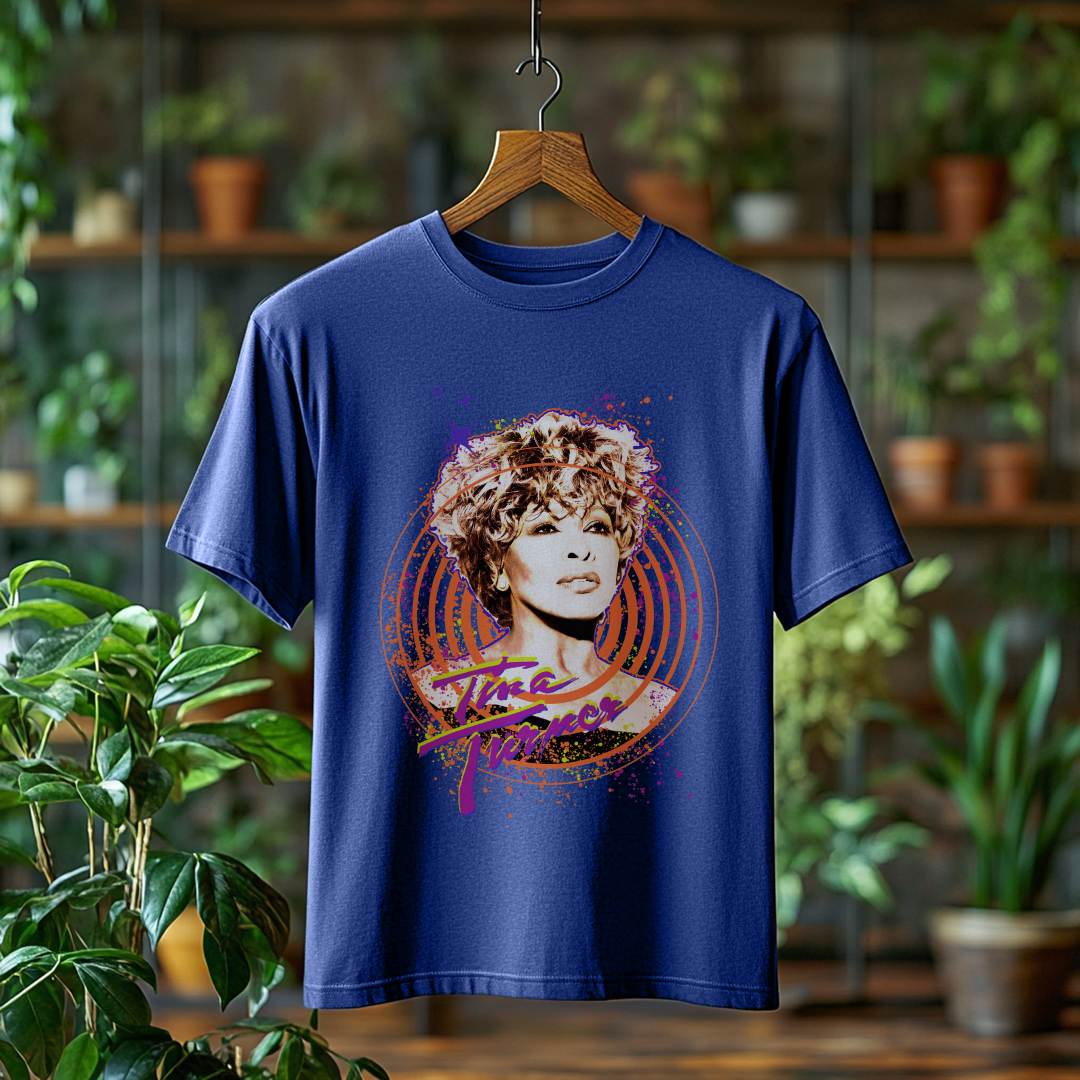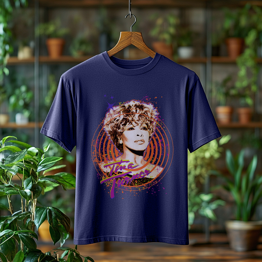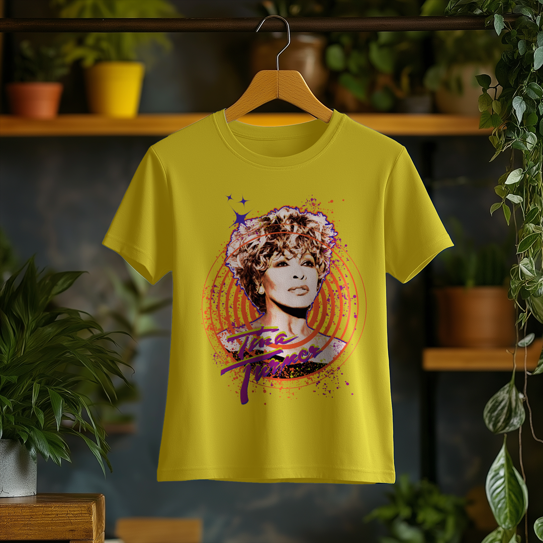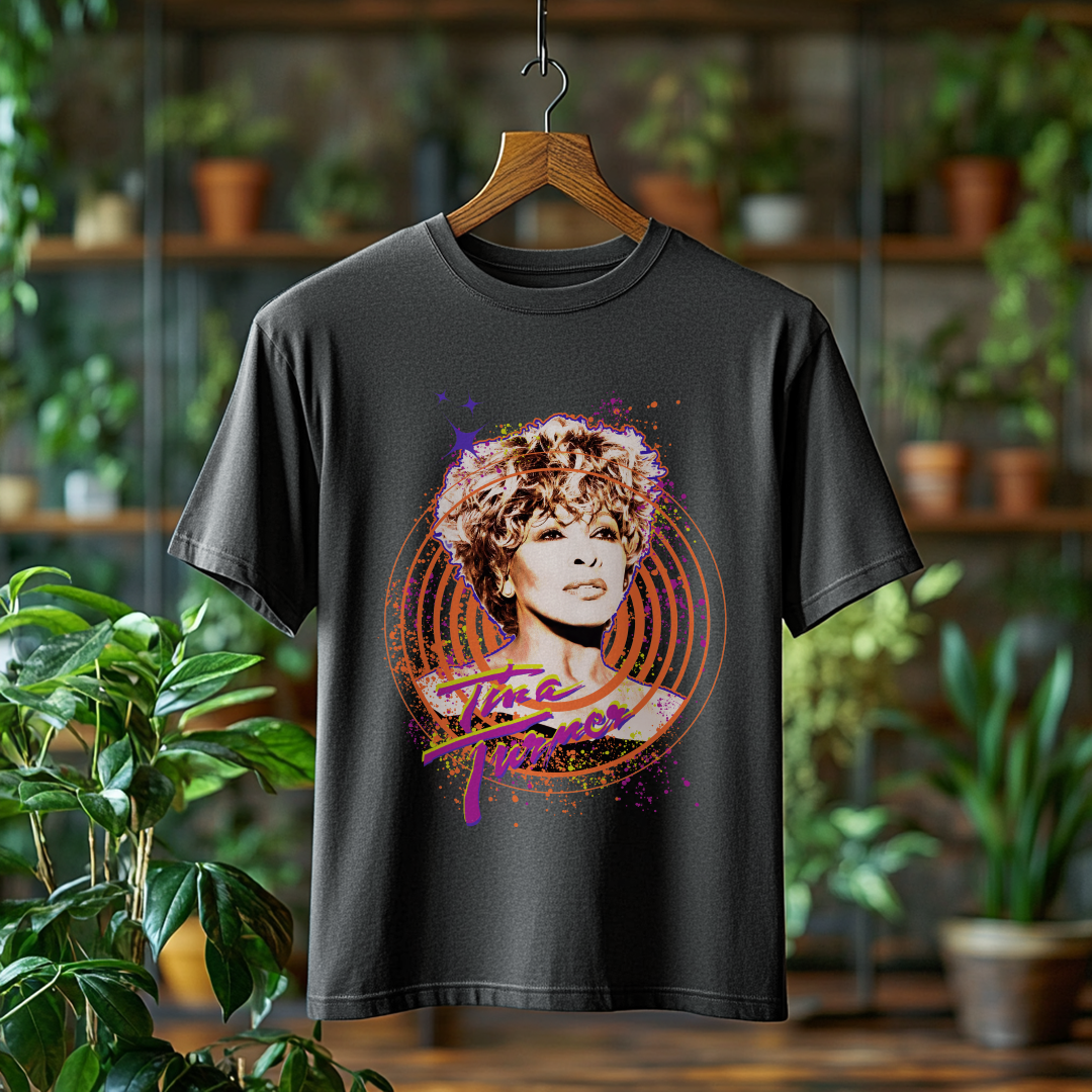 Celebre o legado inesquecível de Tina Turner com esta camiseta estonada exclusiva! Com um visual despojado e autêntico, essa peça é perfeita para quem quer expressar sua paixão pela música e pelo estilo marcante da Rainha do Rock.