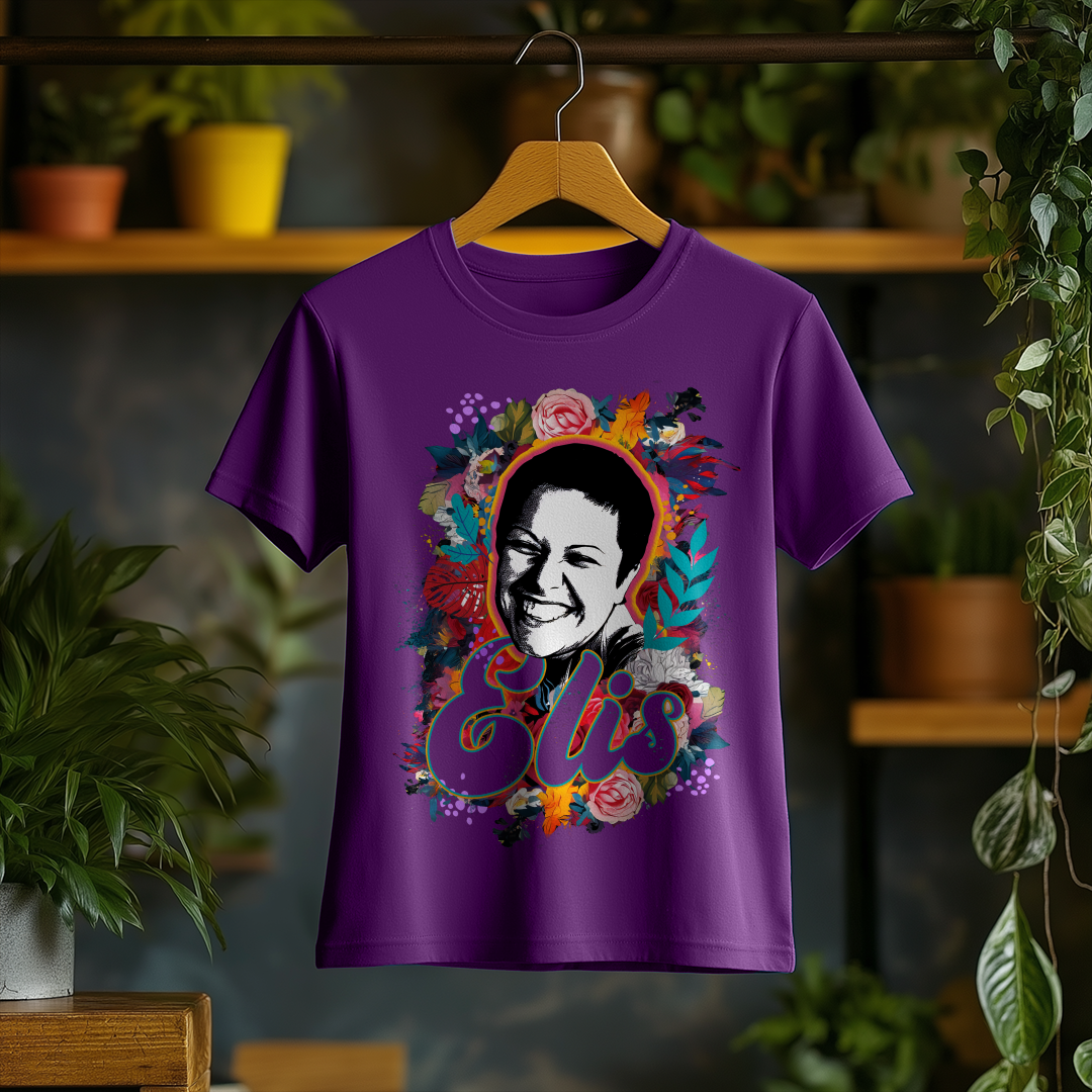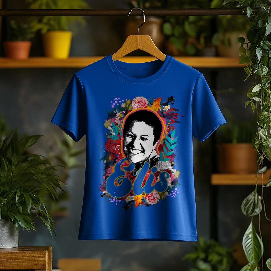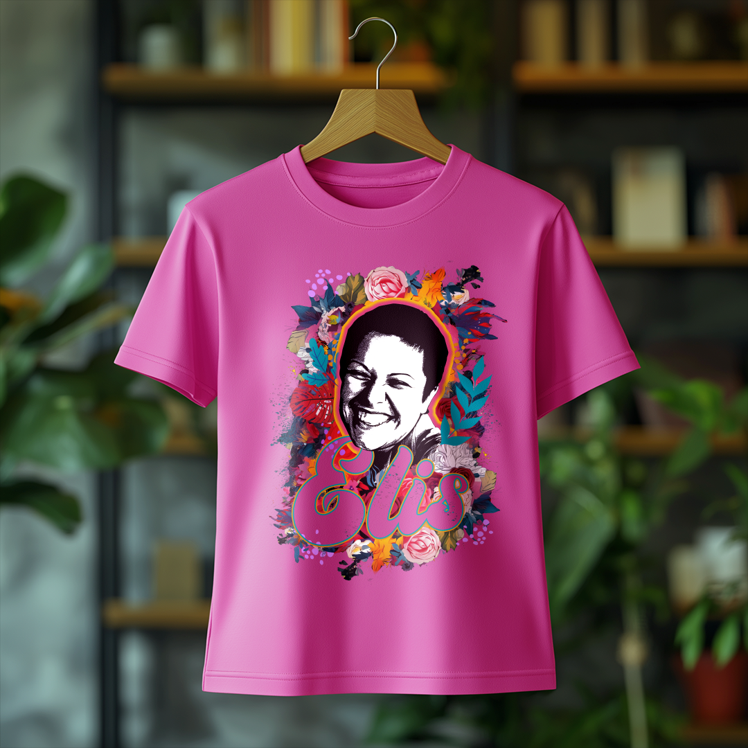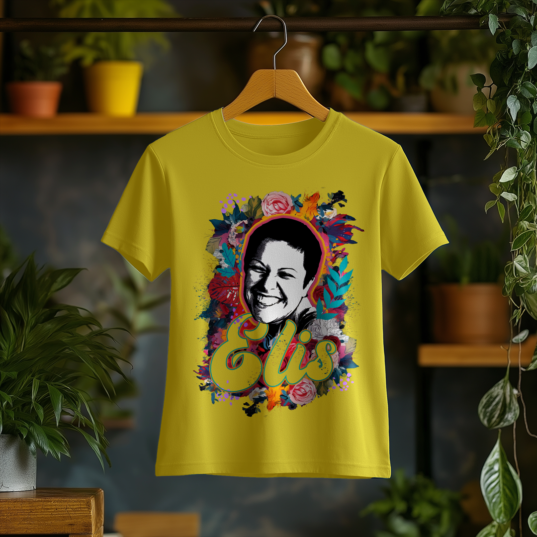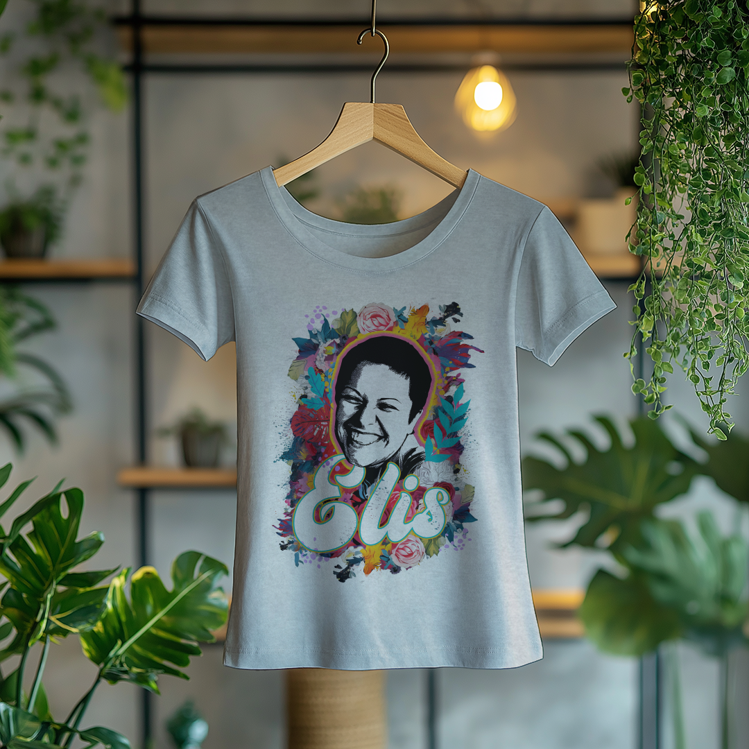 Celebre a genialidade de Elis Regina com a Camiseta Feminina O Sorriso de Elis! Com um design elegante e confortável, essa peça é ideal para fãs que querem carregar no peito a emoção e o talento inigualável da cantora.