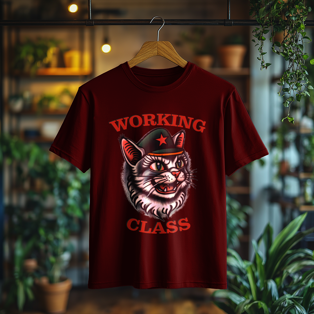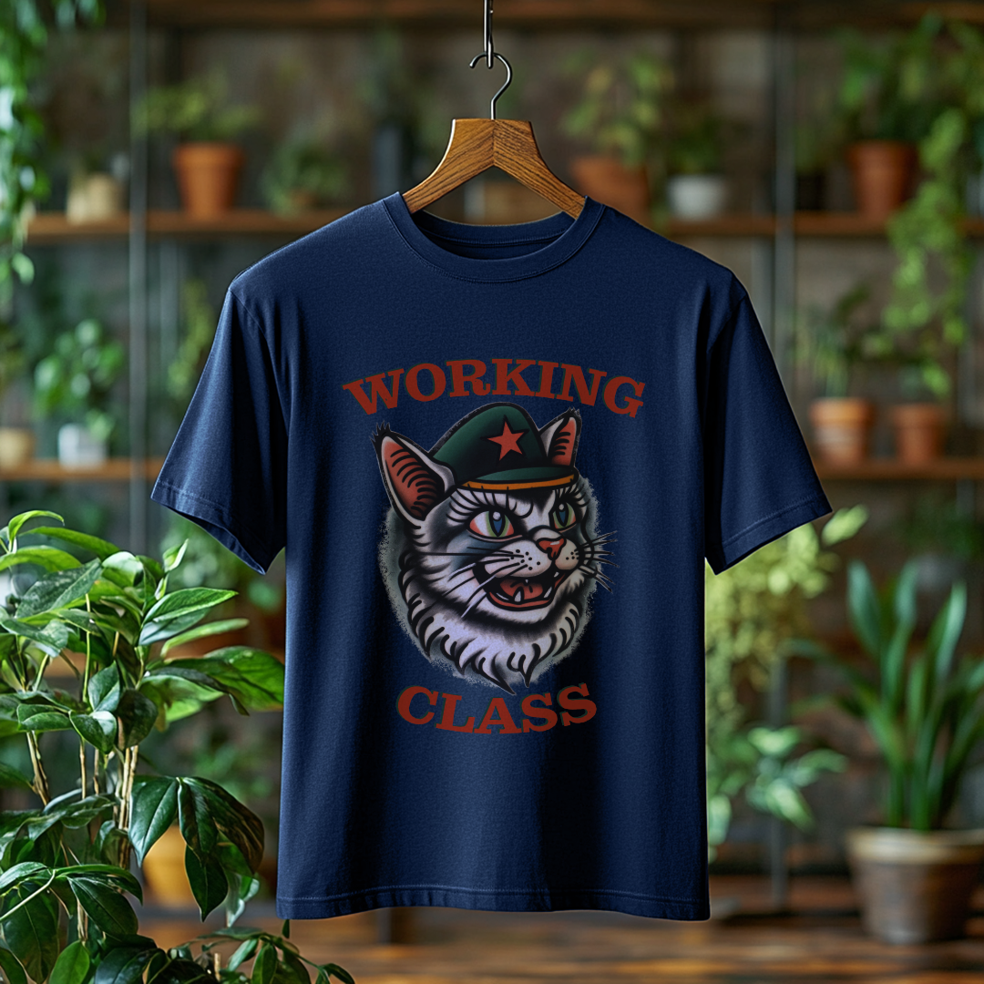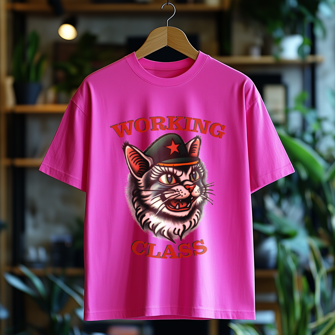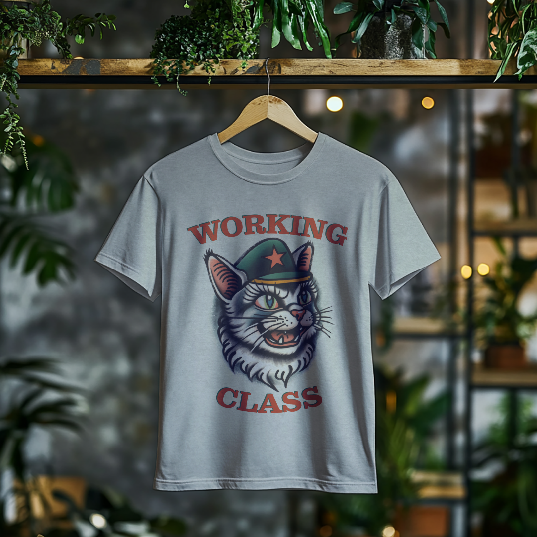 Camiseta WORKING CLASS é mais do que uma peça de vestuário; é uma verdadeira declaração de princípios! Com a estampa do gatinho com consciência de classe, essa camiseta combina estilo e mensagem, perfeita para quem deseja expressar suas ideias de forma autêntica e divertida.