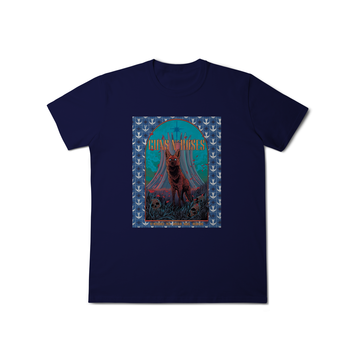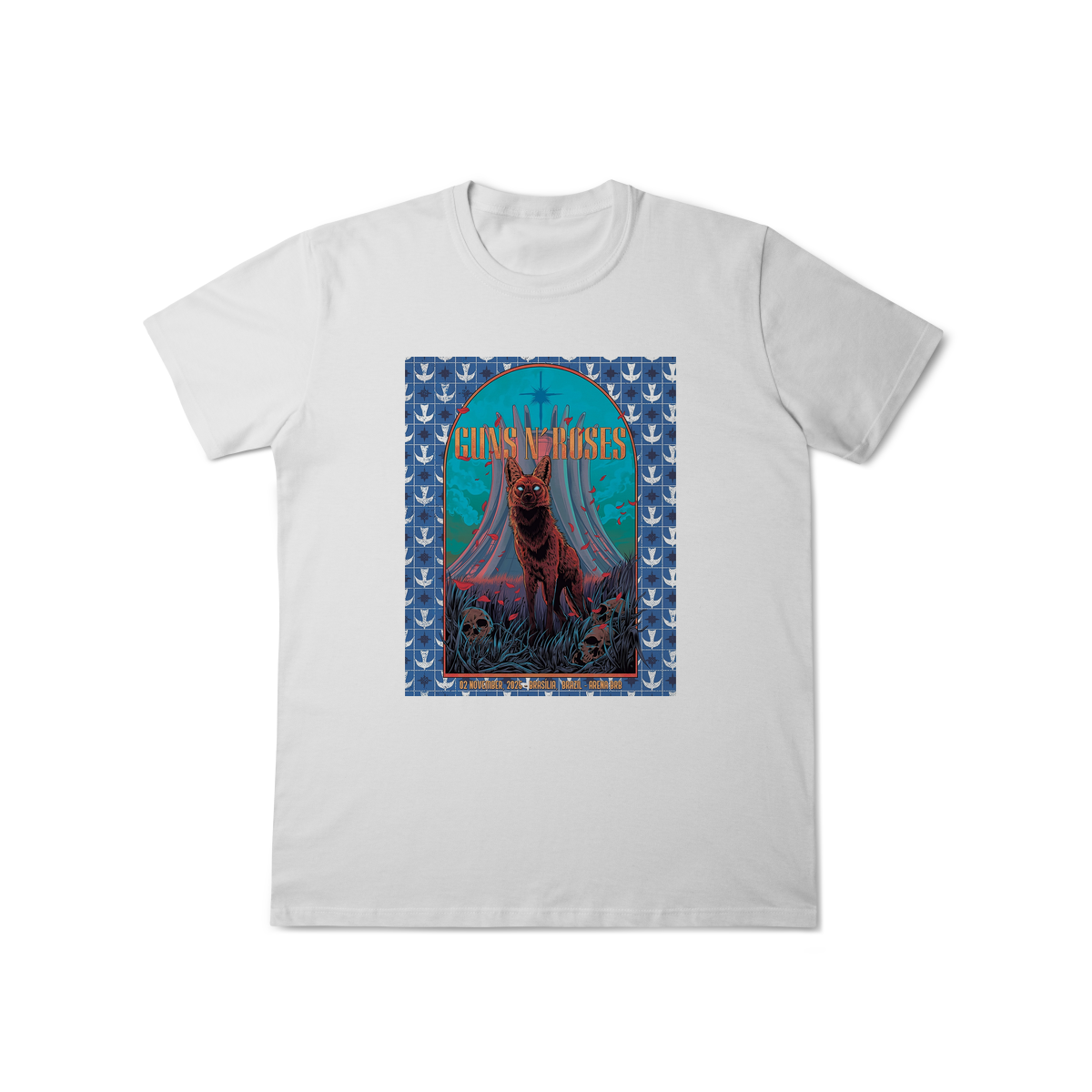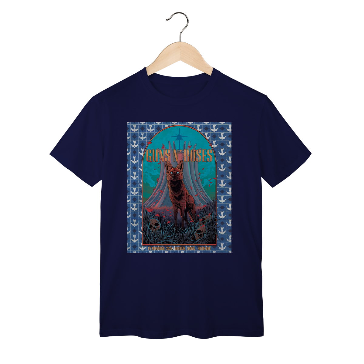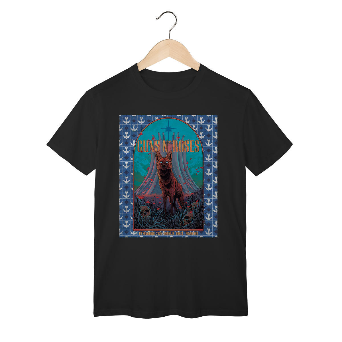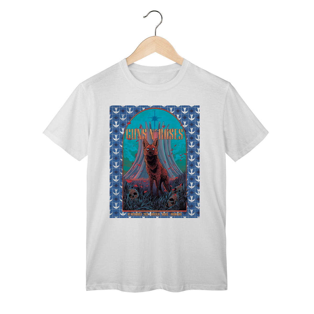 Camiseta inspirada no pôster do show do Guns N’ Roses em Brasília, 2025, parte da aguardada turnê “Because What You Want & What You Get Are Two Completely Different Things”. Mais do que uma peça de roupa, esta camiseta é um tributo a um dos momentos mais marcantes da história recente da banda e uma lembrança exclusiva para os verdadeiros fãs brasileiros.