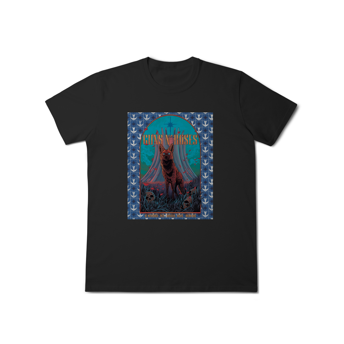 A estampa frontal reproduz com fidelidade o pôster original do show, com cores vibrantes e traços que remetem à energia crua e à atitude inconfundível do Guns N’ Roses. O design traz elementos icônicos — como o logotipo clássico com as rosas cruzadas, tipografia vintage e referências visuais à ilha de Santa Catarina, transformando a peça em um item colecionável.