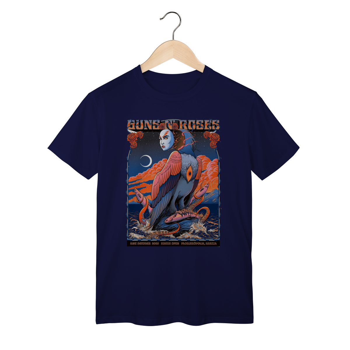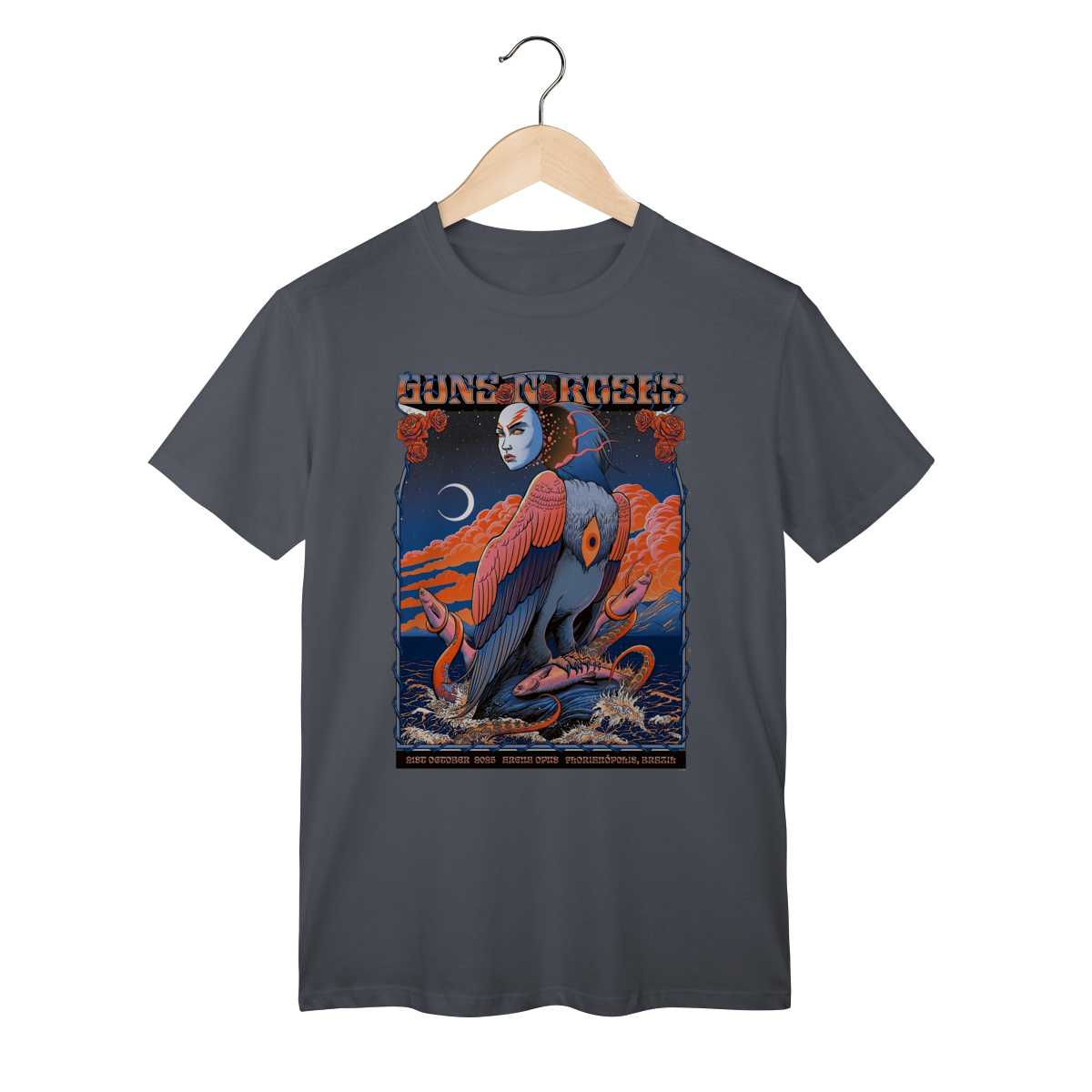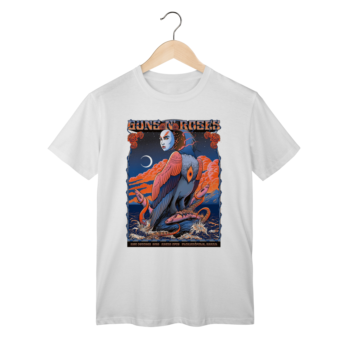 A estampa frontal reproduz com fidelidade o pôster original do show, com cores vibrantes e traços que remetem à energia crua e à atitude inconfundível do Guns N’ Roses. O design traz elementos icônicos — como o logotipo clássico com as rosas cruzadas, tipografia vintage e referências visuais à ilha de Santa Catarina, transformando a peça em um item colecionável.