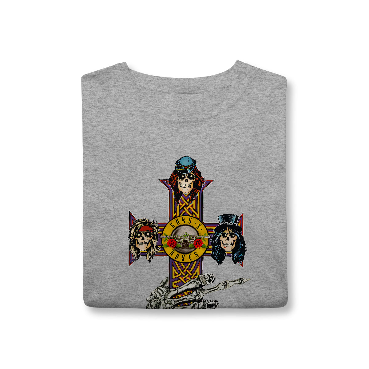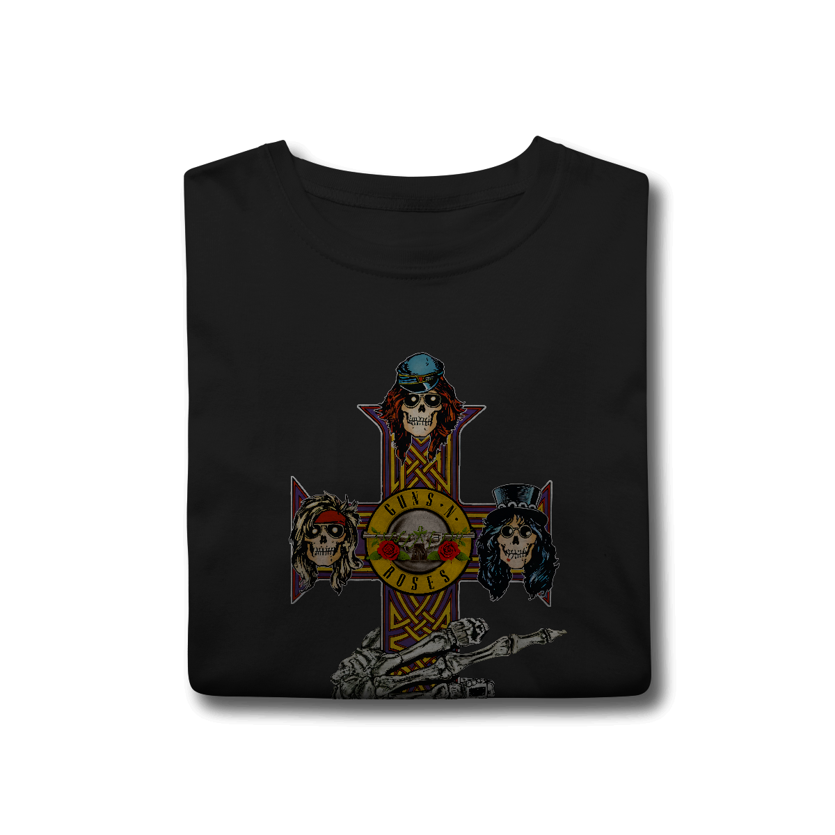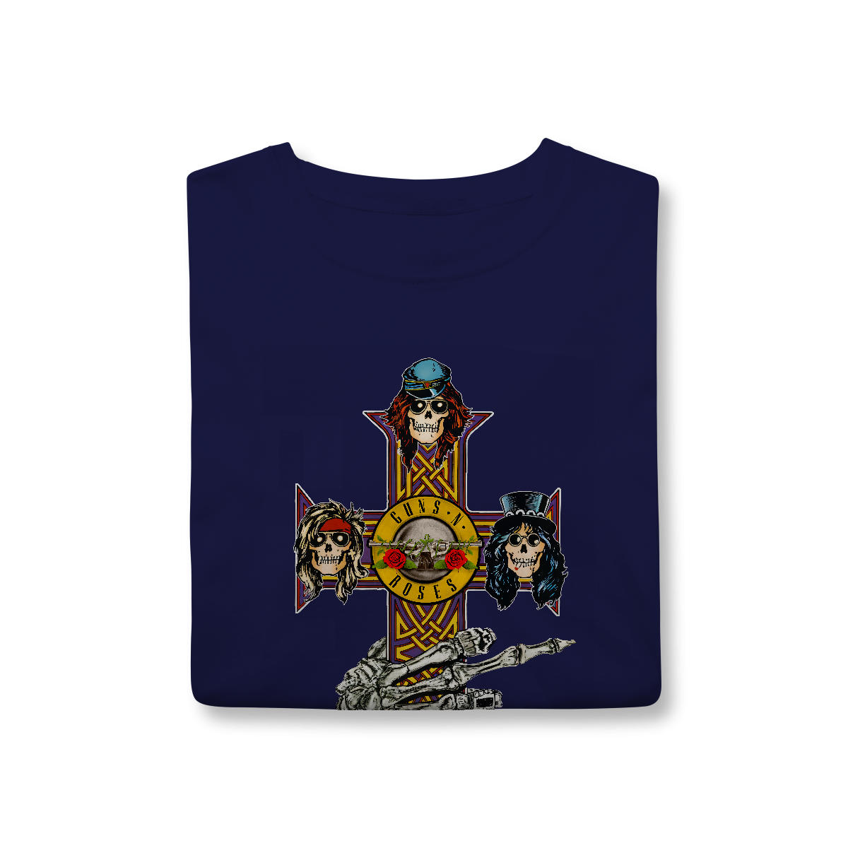 A icônica cruz do álbum Appetite for Destruction apresenta um design gótico em formato de cruz celta, com detalhes ornamentados nas extremidades. No centro e nas pontas da cruz, estão dispostas cinco caveiras estilizadas, representando os membros originais da banda. Cada caveira tem traços personalizados, como cabelos, chapéus ou bandanas, refletindo a aparência e personalidade de Axl Rose, Slash, Duff McKagan. O fundo é escuro, destacando a arte vibrante e sinistra da cruz, criando uma fusão entre o macabro e o rock 'n' roll. É uma imagem que se tornou símbolo do espírito rebelde e cru do Guns N' Roses nos anos 80.