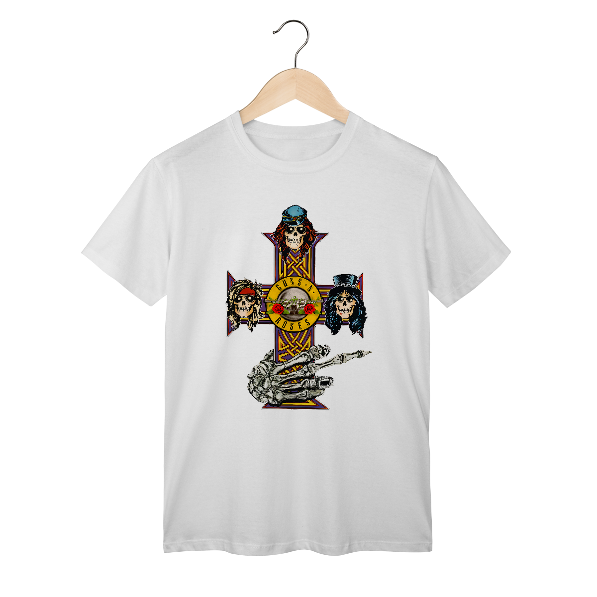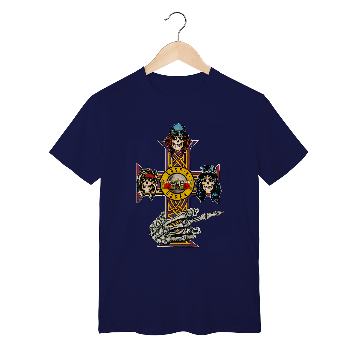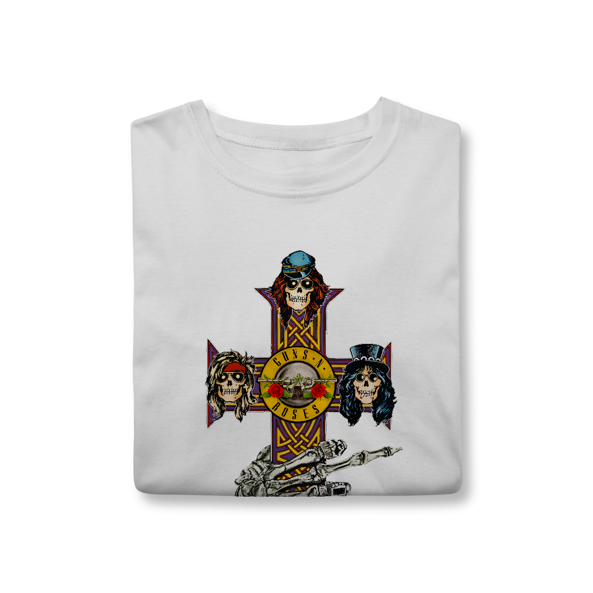 A icônica cruz do álbum Appetite for Destruction apresenta um design gótico em formato de cruz celta, com detalhes ornamentados nas extremidades. No centro e nas pontas da cruz, estão dispostas cinco caveiras estilizadas, representando os membros originais da banda. Cada caveira tem traços personalizados, como cabelos, chapéus ou bandanas, refletindo a aparência e personalidade de Axl Rose, Slash, Duff McKagan. O fundo é escuro, destacando a arte vibrante e sinistra da cruz, criando uma fusão entre o macabro e o rock 'n' roll. É uma imagem que se tornou símbolo do espírito rebelde e cru do Guns N' Roses nos anos 80.