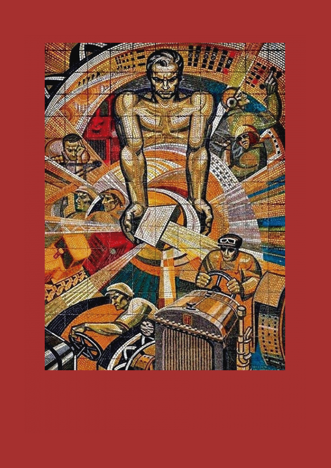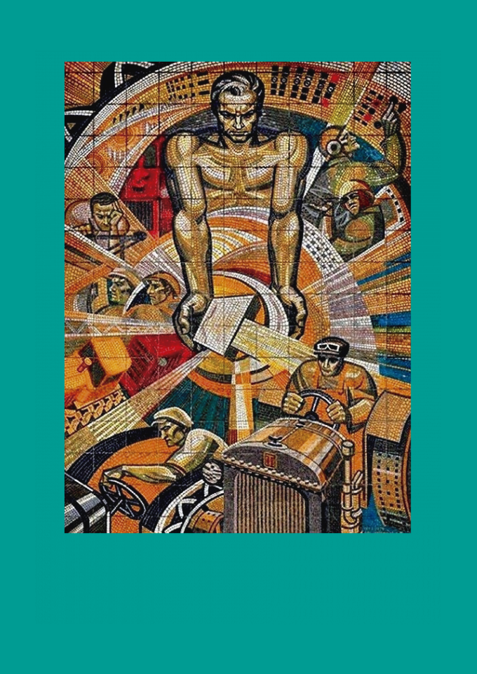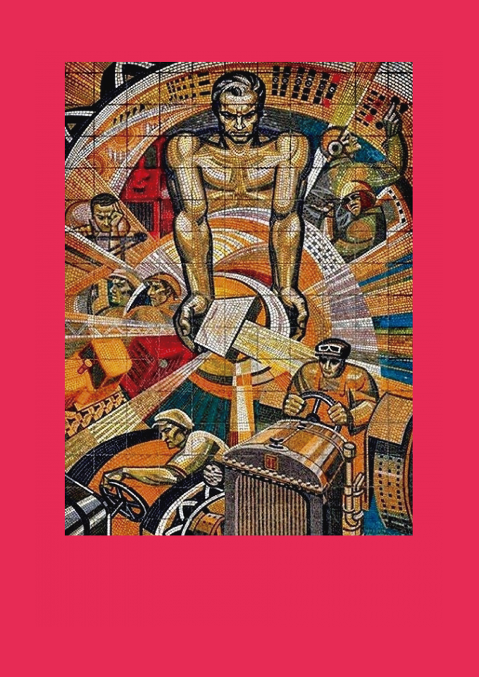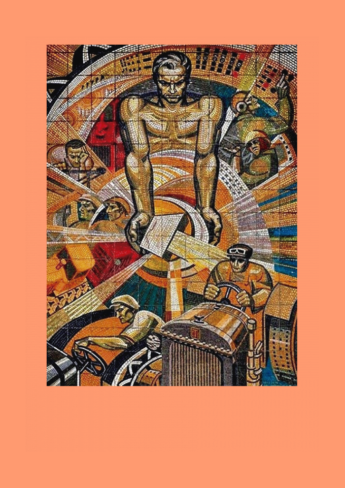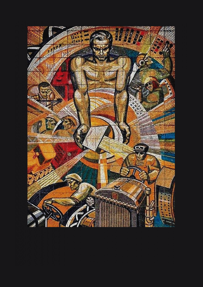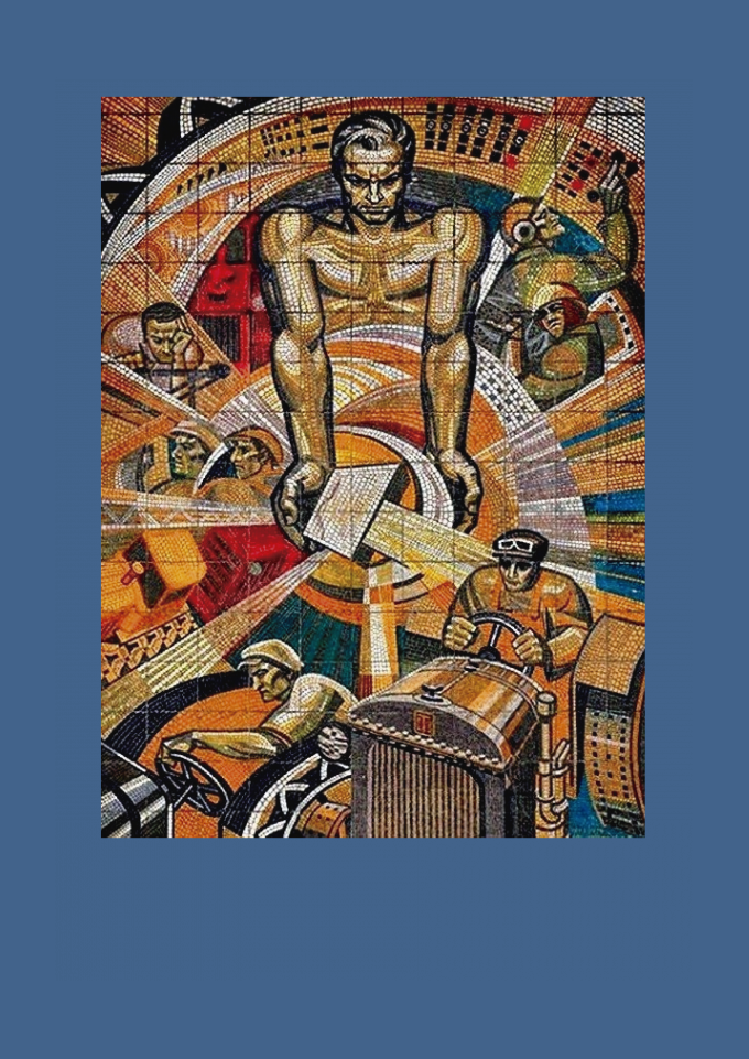 Mural em mosaico soviético, pertencente ao realismo socialista vertente artística em que o trabalhador é colocado como destaque no cenário.