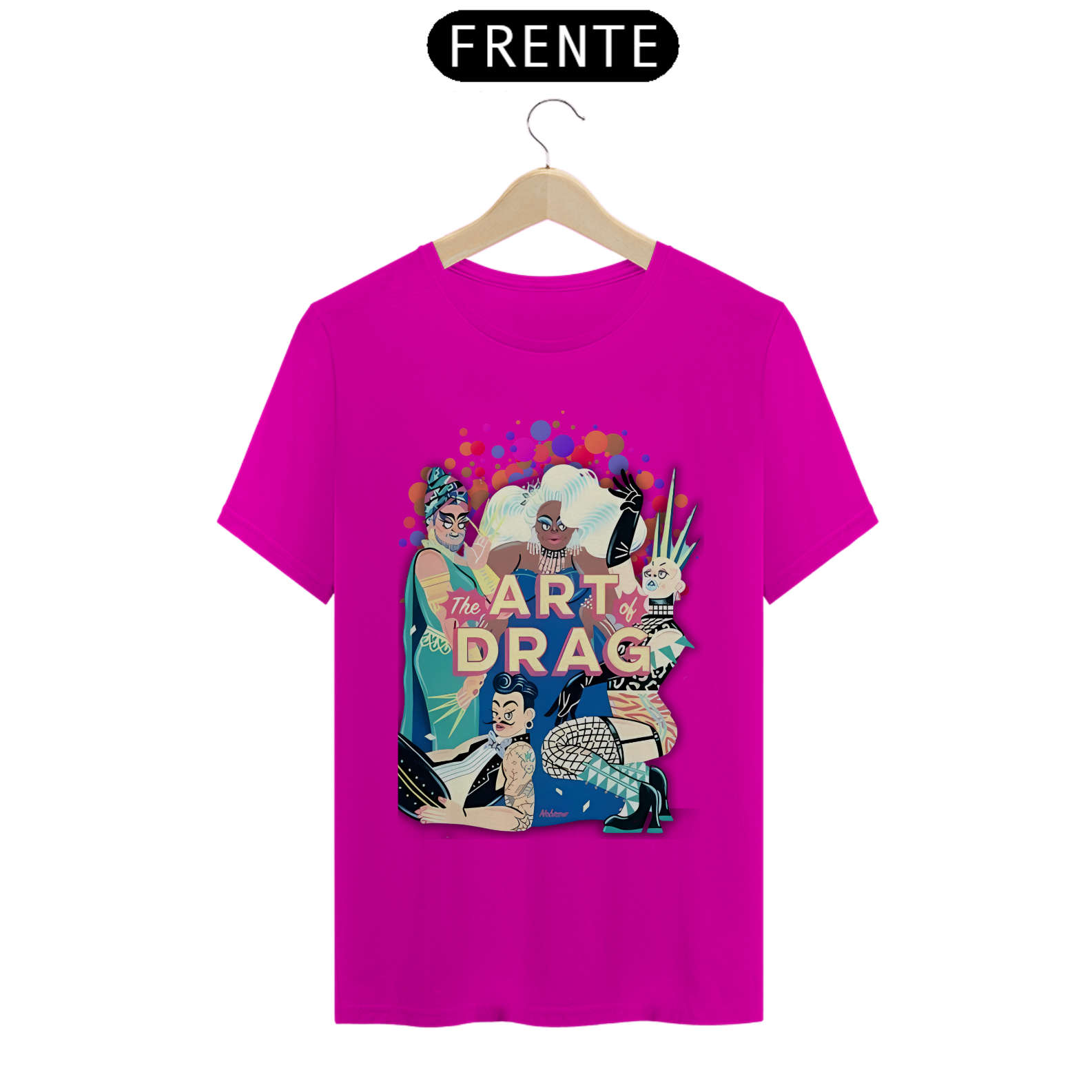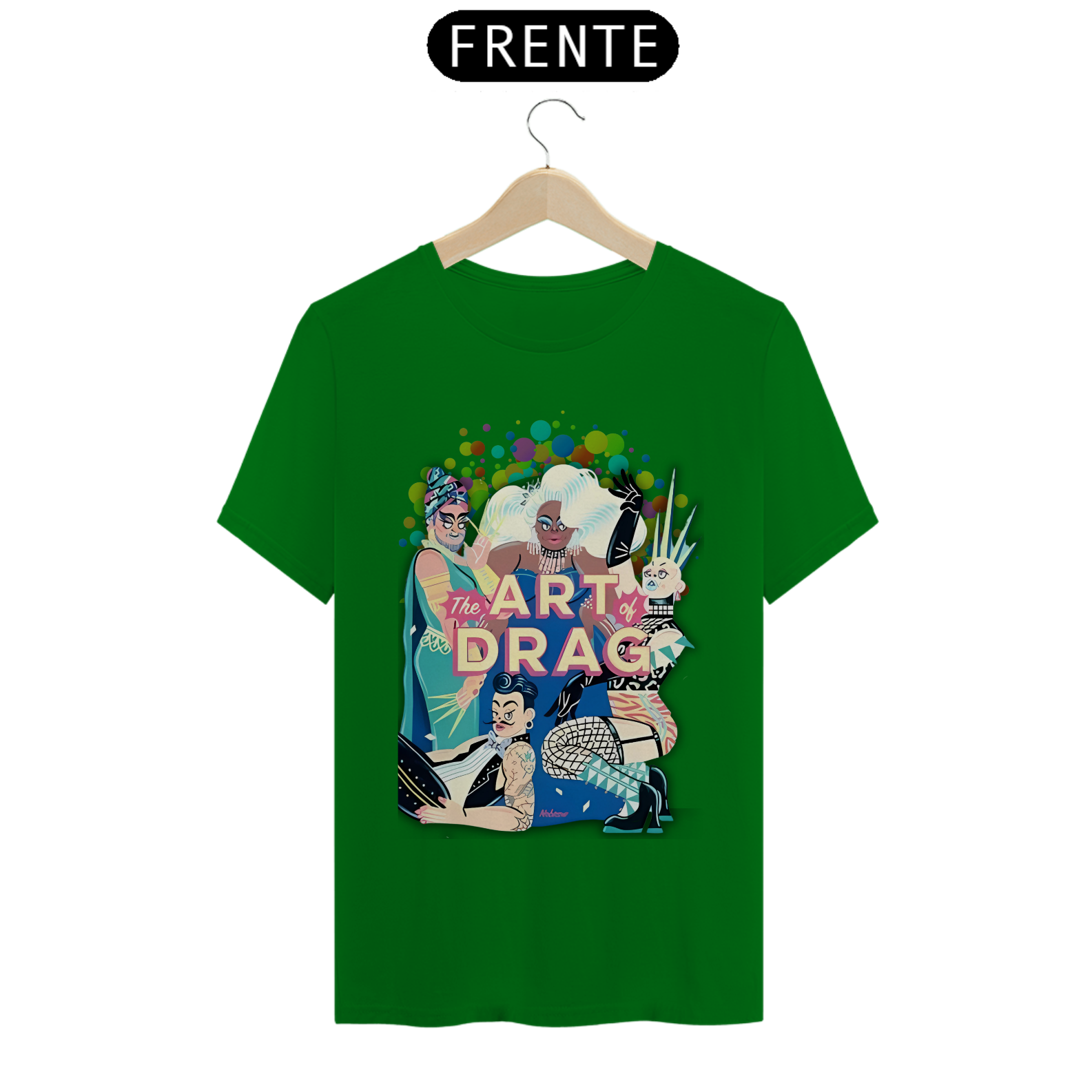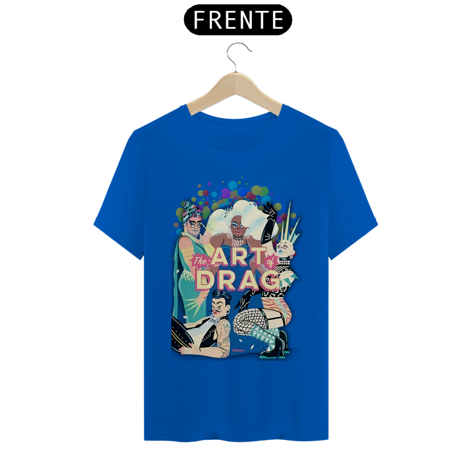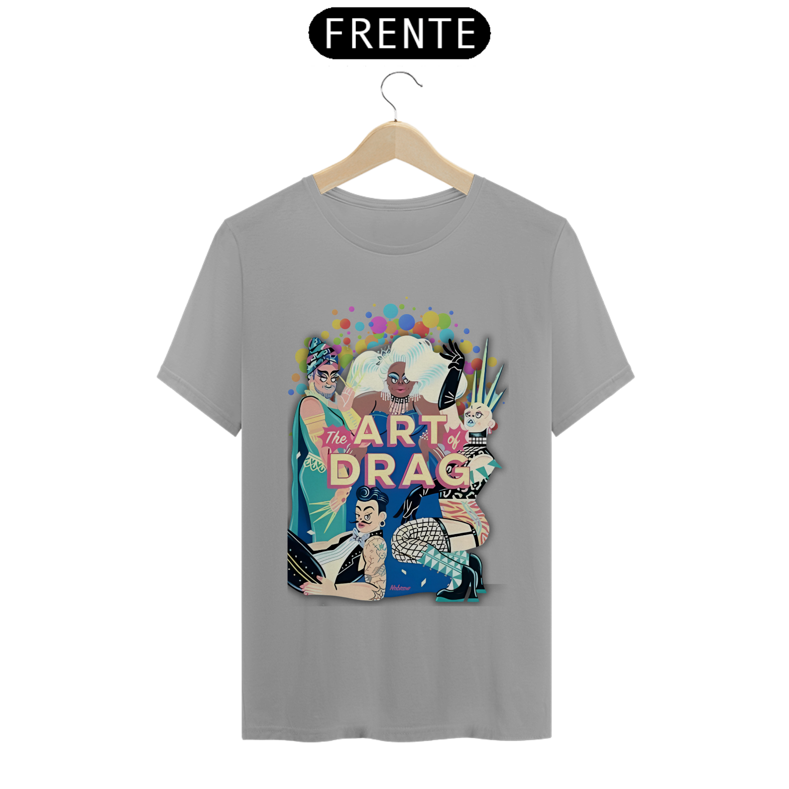 A estampa "Arte Drag" celebra a vibrante e expressiva cultura Drag dentro da comunidade LGBT. Com uma ilustração dinâmica e cheia de cores, esta estampa apresenta quatro Drag Queens, cada uma com seu estilo único e marcante, simbolizando a diversidade e a arte de se reinventar. As figuras estão cercadas por um fundo colorido de bolhas, realçando ainda mais a energia e o brilho do universo Drag. A frase "The Art of Drag" em destaque, em um tom rosado, reforça a importância e a beleza desta forma de expressão artística. A camiseta "Arte Drag" é perfeita para quem deseja expressar seu apoio e admiração pela cultura Drag, trazendo um toque de glamour e criatividade ao seu guarda-roupa, enquanto celebra a diversidade e a inclusão.
