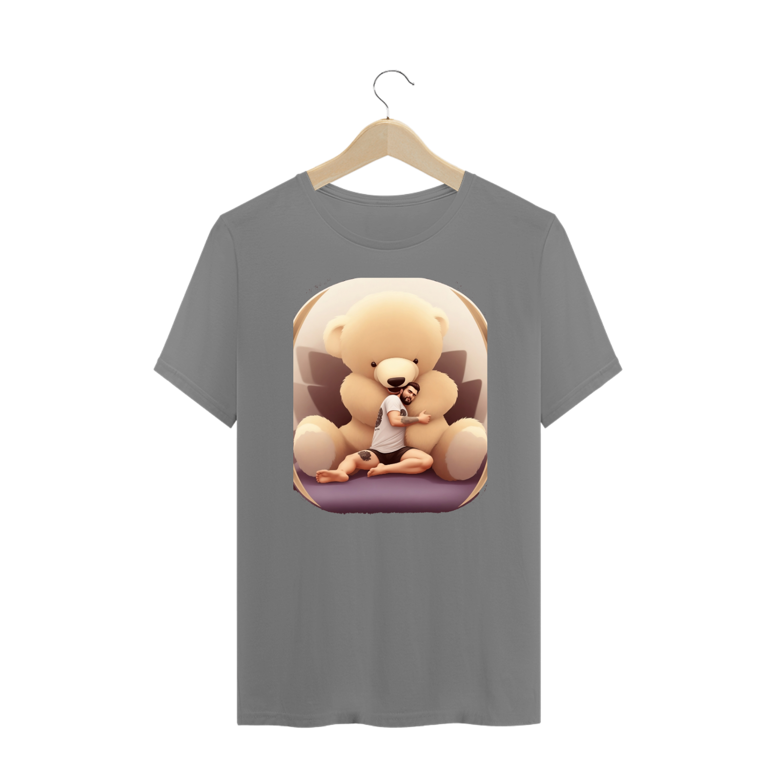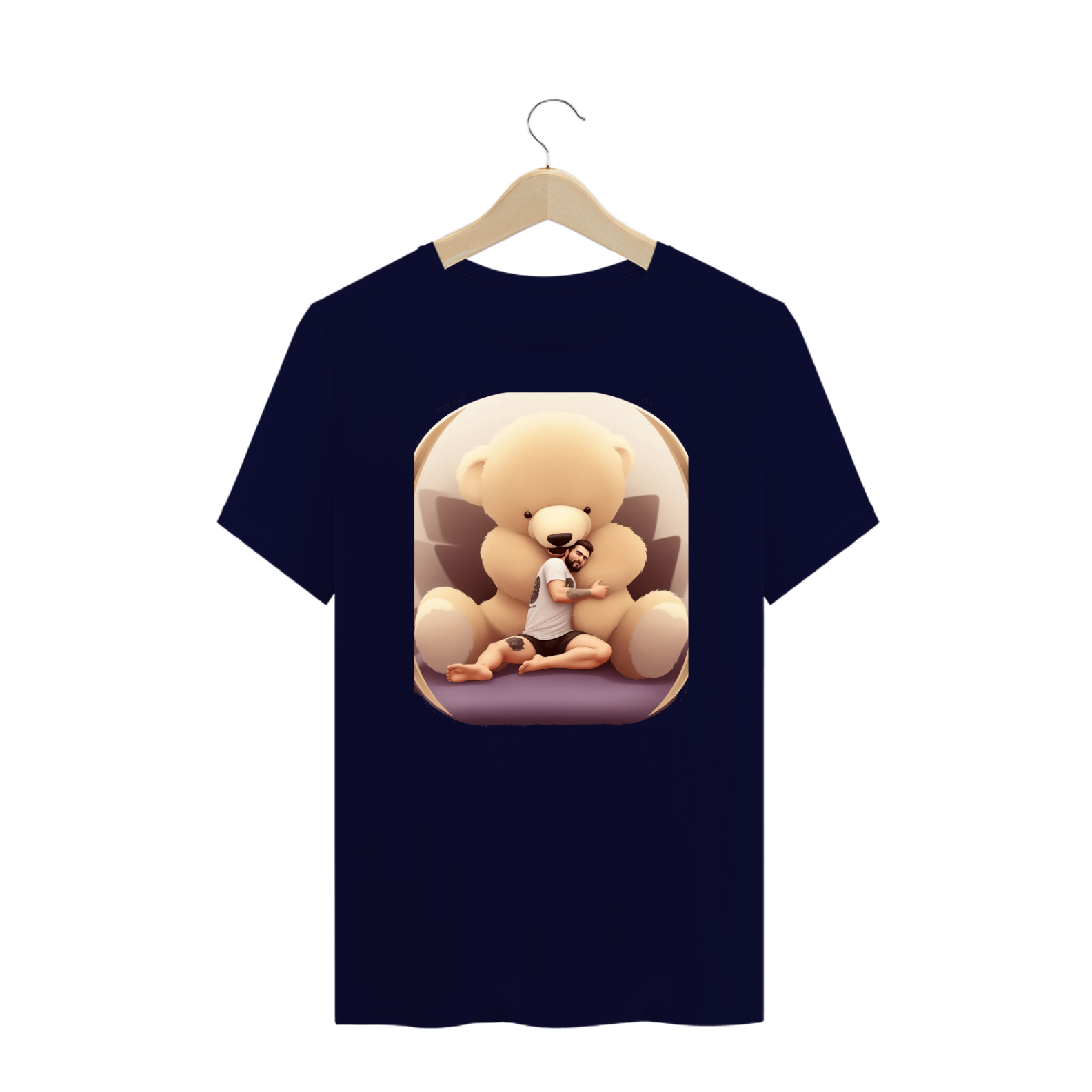 Apresentamos uma estampa de profunda emotividade e simbolismo, especialmente elaborada para a vibrante comunidade Gaybear. Neste design notável, um Homem barbado e tatuado está sentado em um sofá, sendo carinhosamente abraçado por um Teddy Bear gigante. Essa imagem é um tributo à força, à vulnerabilidade e à conexão emocional que unem a comunidade.