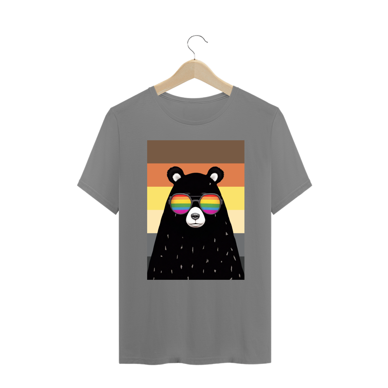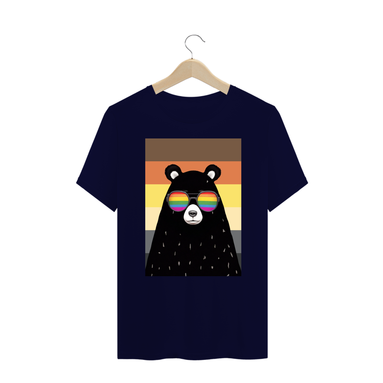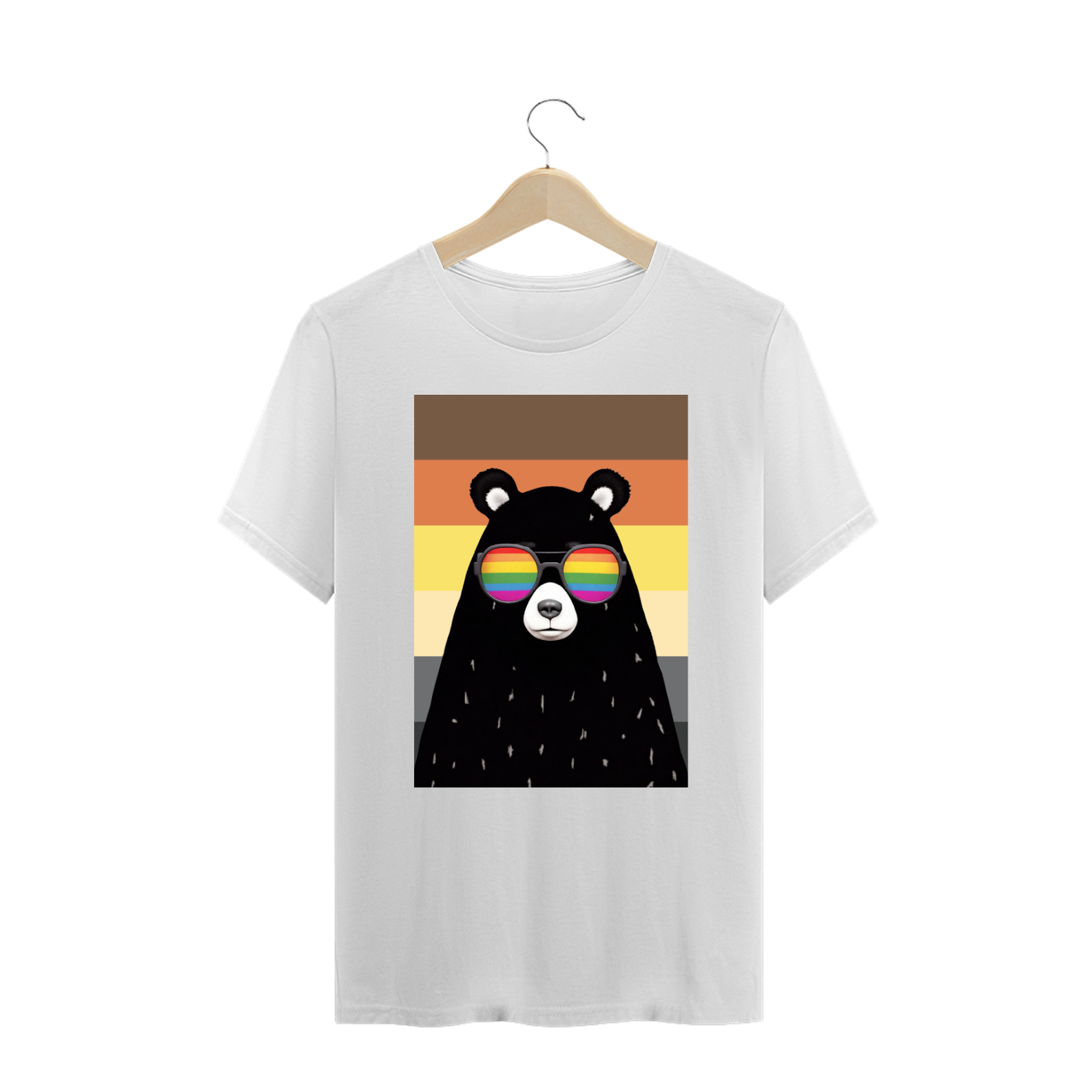 Esta estampa impactante apresenta o torso robusto de um urso negro, adornado com óculos de sol que refletem arco-íris, destacando a diversidade e a inclusão da comunidade Gaybear. Em frente à bandeira do orgulho, esta obra se torna um símbolo visual poderoso de autenticidade e orgulho individual. O urso, com seu olhar confiante e os reflexos coloridos, é uma celebração visual do amor próprio e da diversidade dentro desta vibrante comunidade.