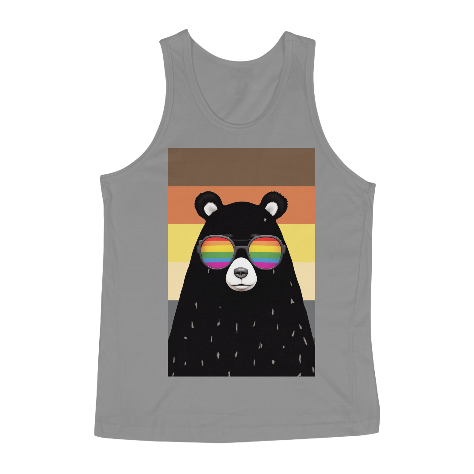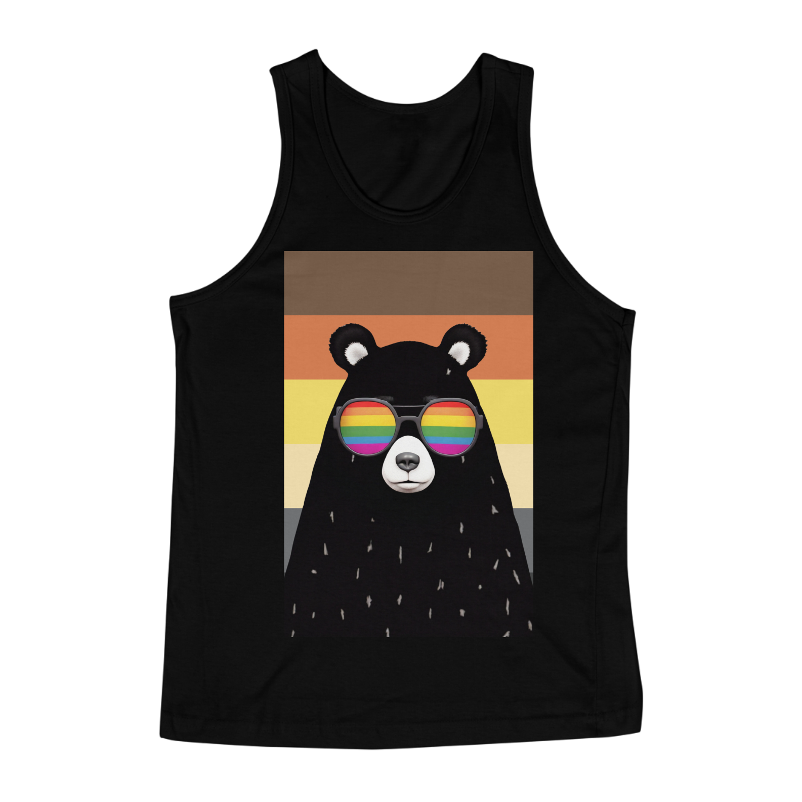 Esta estampa impactante apresenta o torso robusto de um urso negro, adornado com óculos de sol que refletem arco-íris, destacando a diversidade e a inclusão da comunidade Gaybear. Em frente à bandeira do orgulho, esta obra se torna um símbolo visual poderoso de autenticidade e orgulho individual. O urso, com seu olhar confiante e os reflexos coloridos, é uma celebração visual do amor próprio e da diversidade dentro desta vibrante comunidade.