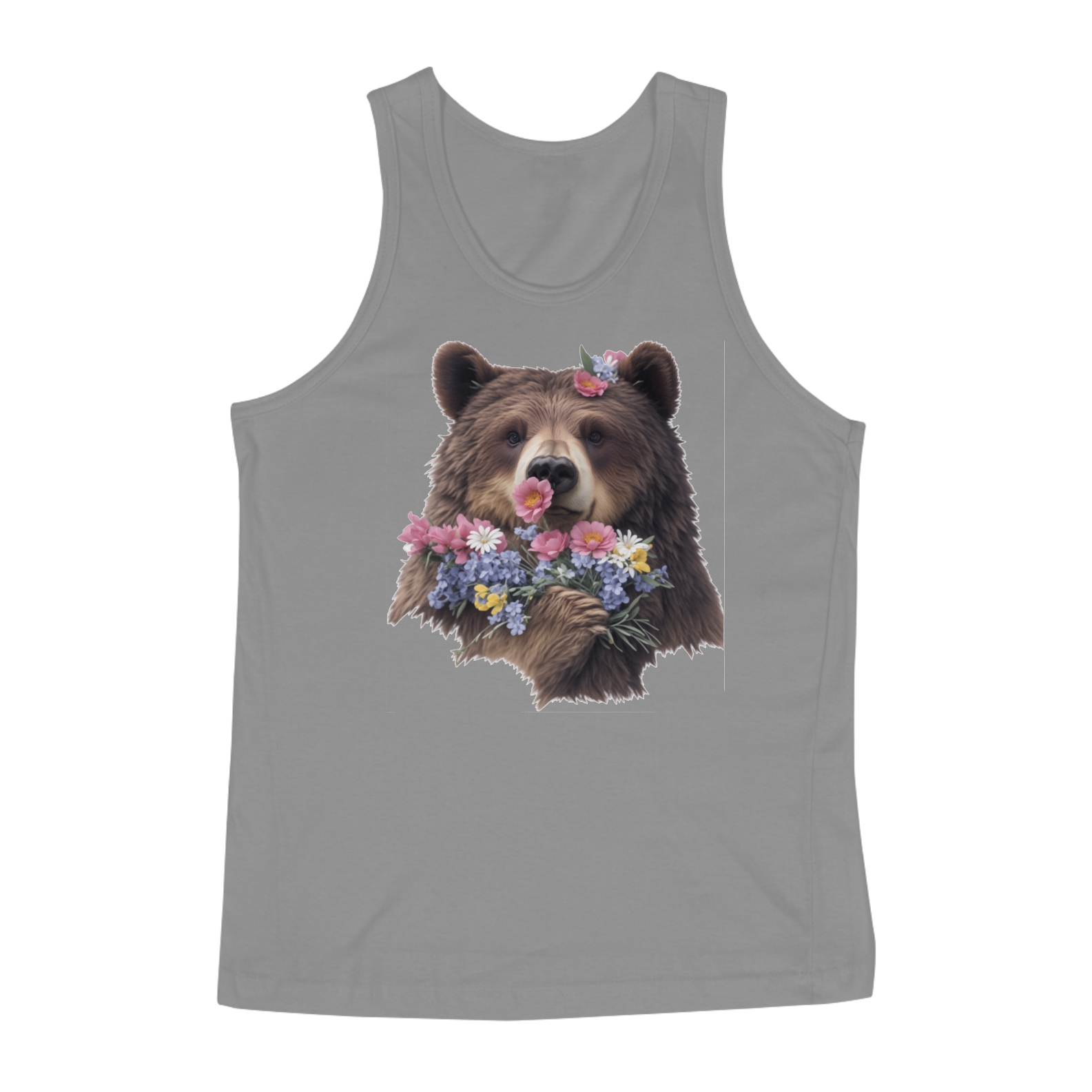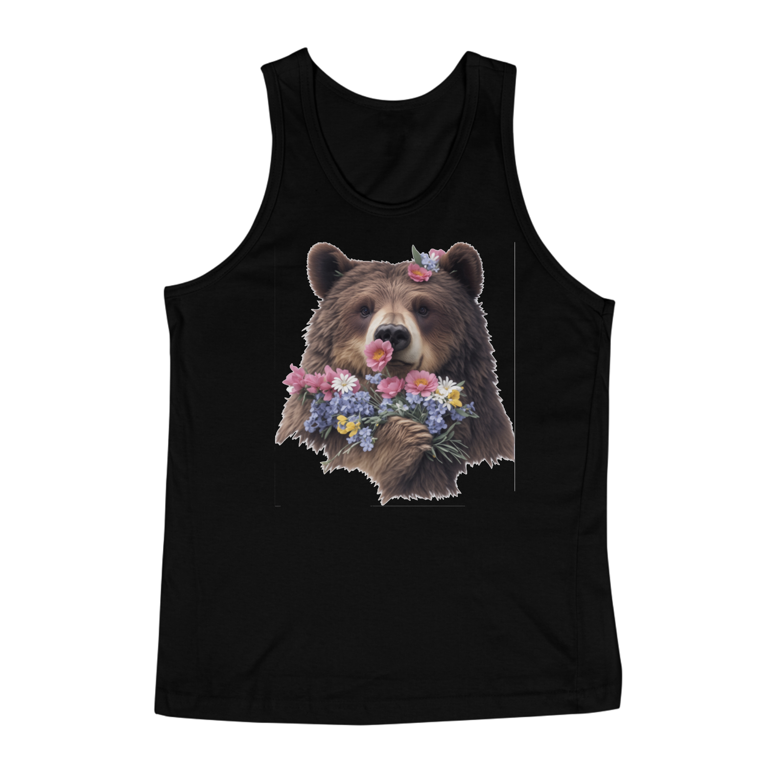 A paleta de cores suaves e naturais enriquece a estampa, evocando um sentimento de tranquilidade e harmonia. O contraste entre a pelagem marrom do urso e as cores vibrantes das flores cria um visual cativante que convida à contemplação.