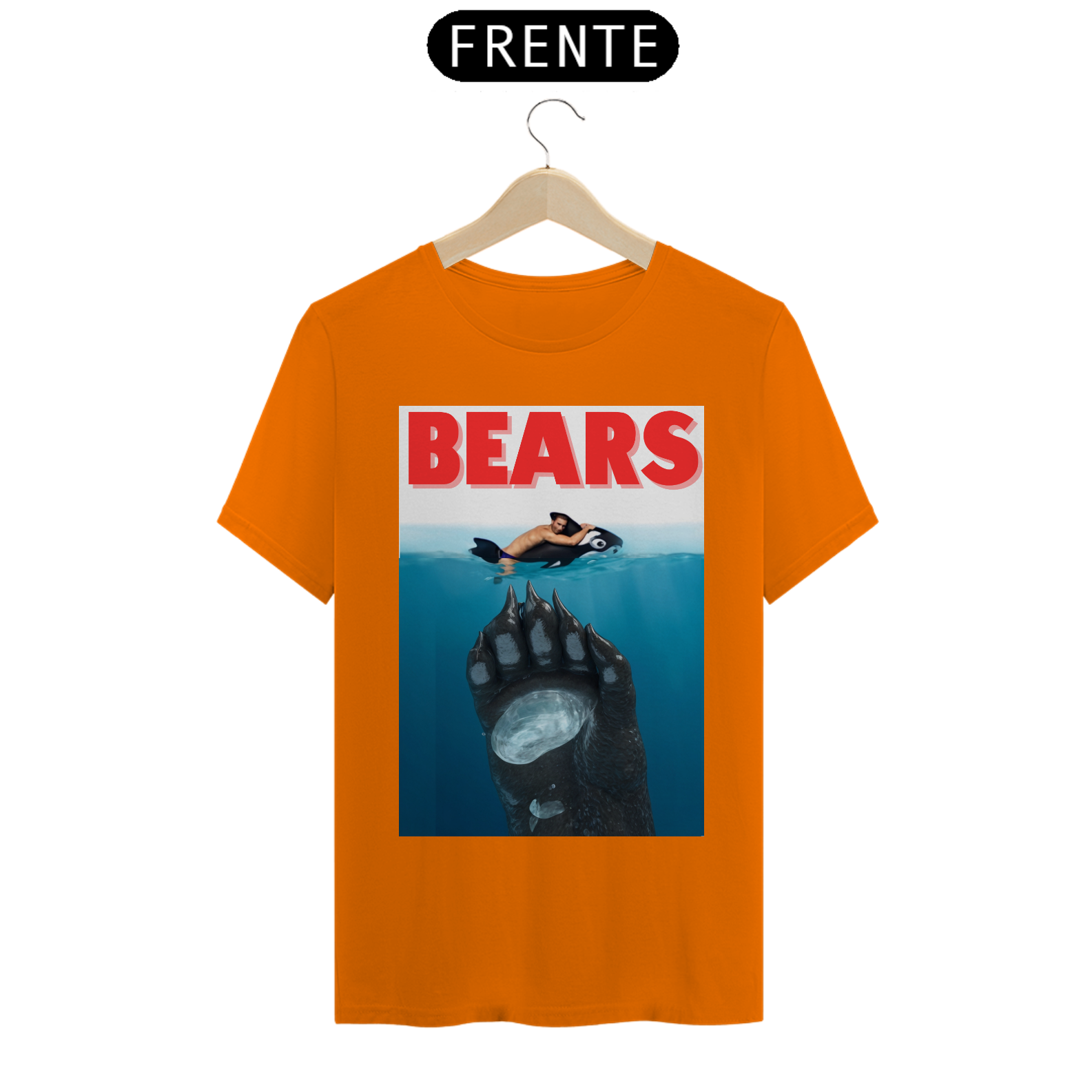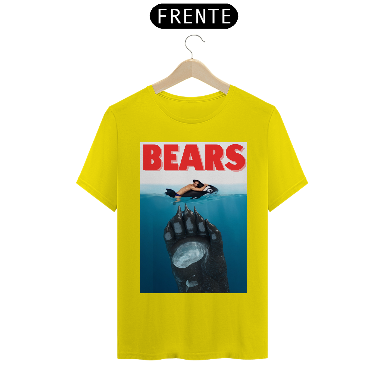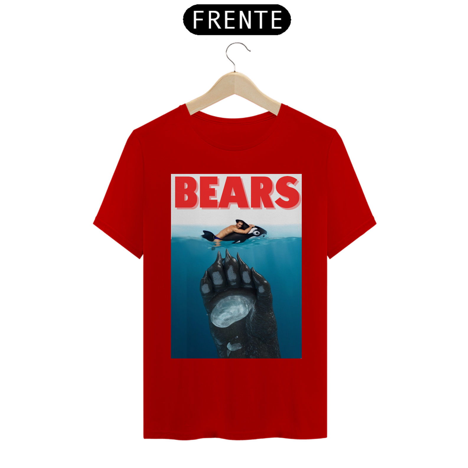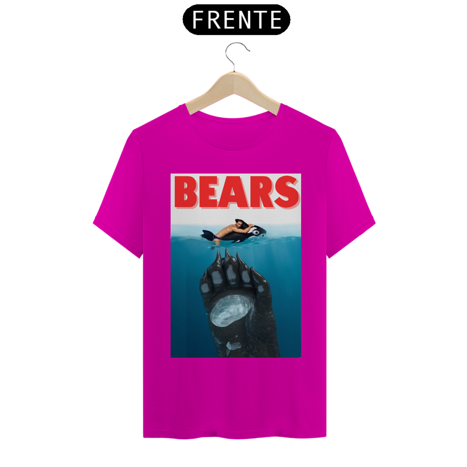 A estampa "Bears" é uma homenagem divertida ao clássico filme "Tubarão", mas com uma reviravolta que é totalmente Bear. Nesta paródia criativa, vemos um urso emergindo das profundezas, pronto para surpreender seu "alvo", que está relaxando inocentemente em uma boia. Com um toque de humor e uma clara referência à cultura pop, esta camiseta é perfeita para aqueles que querem mostrar sua identidade Bear de maneira descontraída e espirituosa. A "Bears" não só celebra a comunidade Bear, mas também adiciona um toque icônico e inesperado ao guarda-roupa de qualquer fã do gênero.