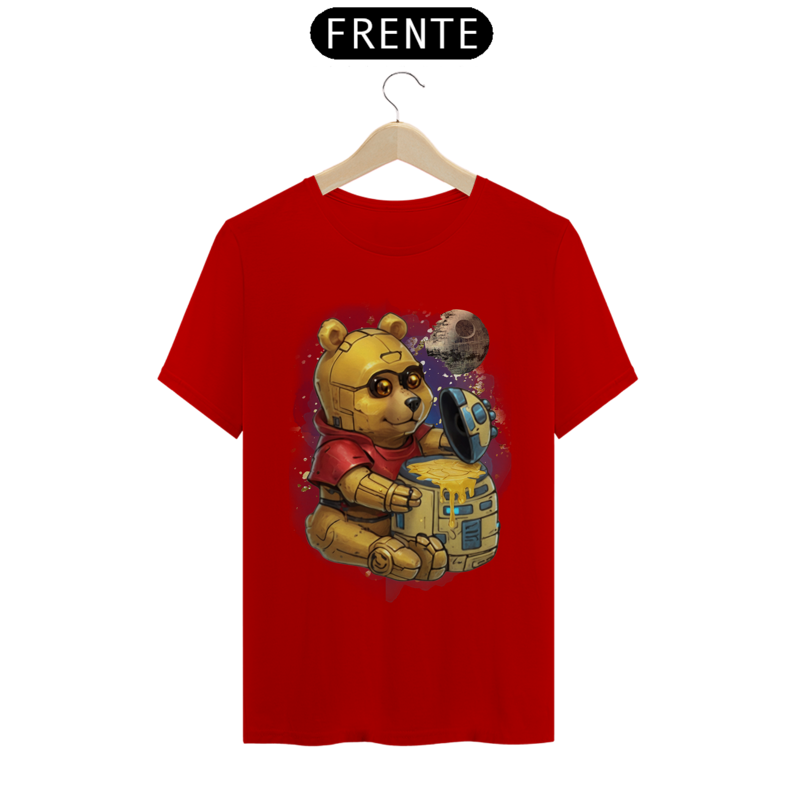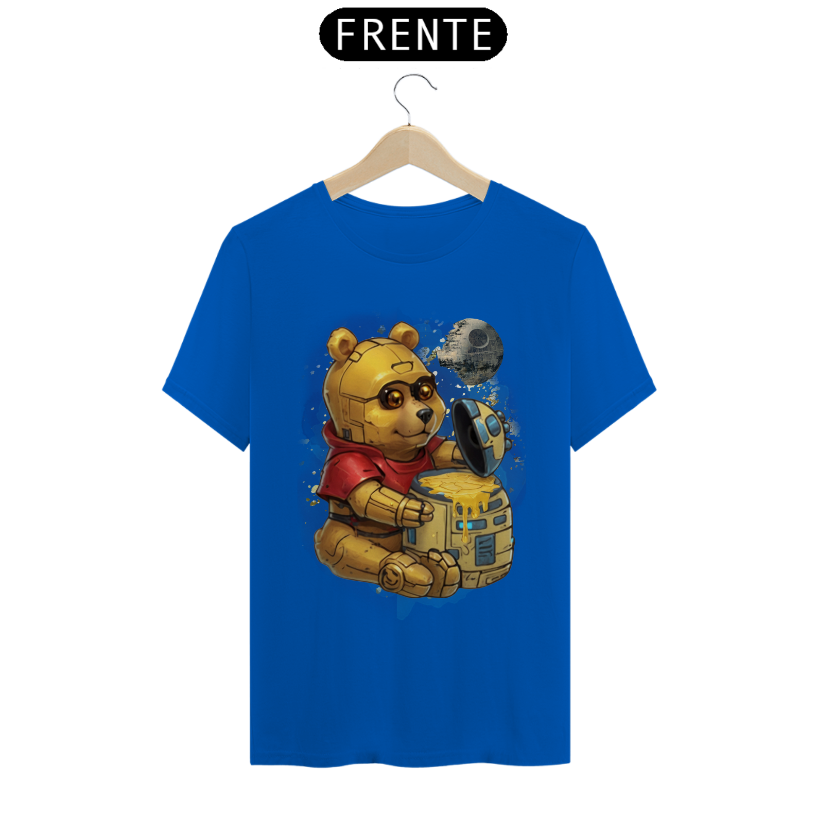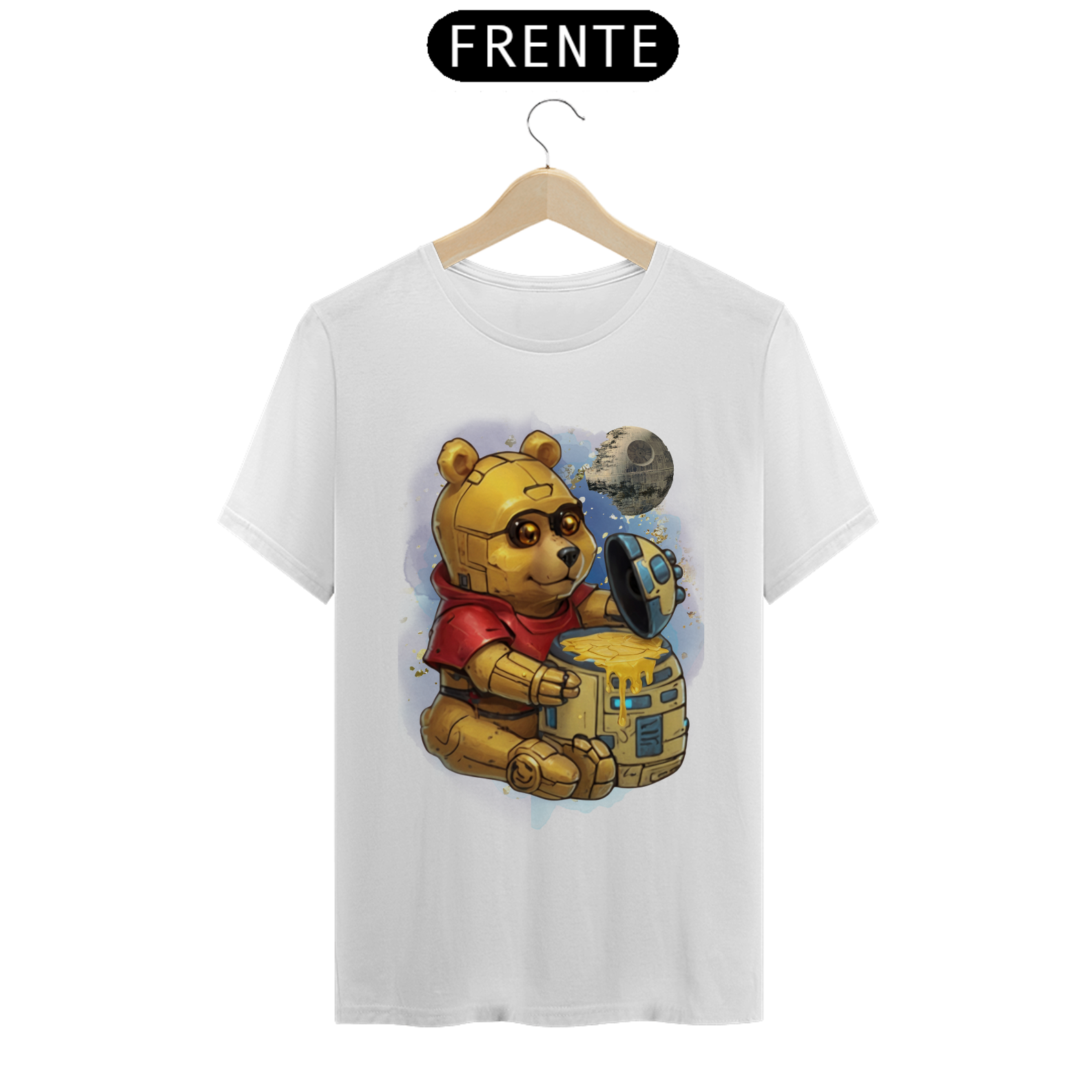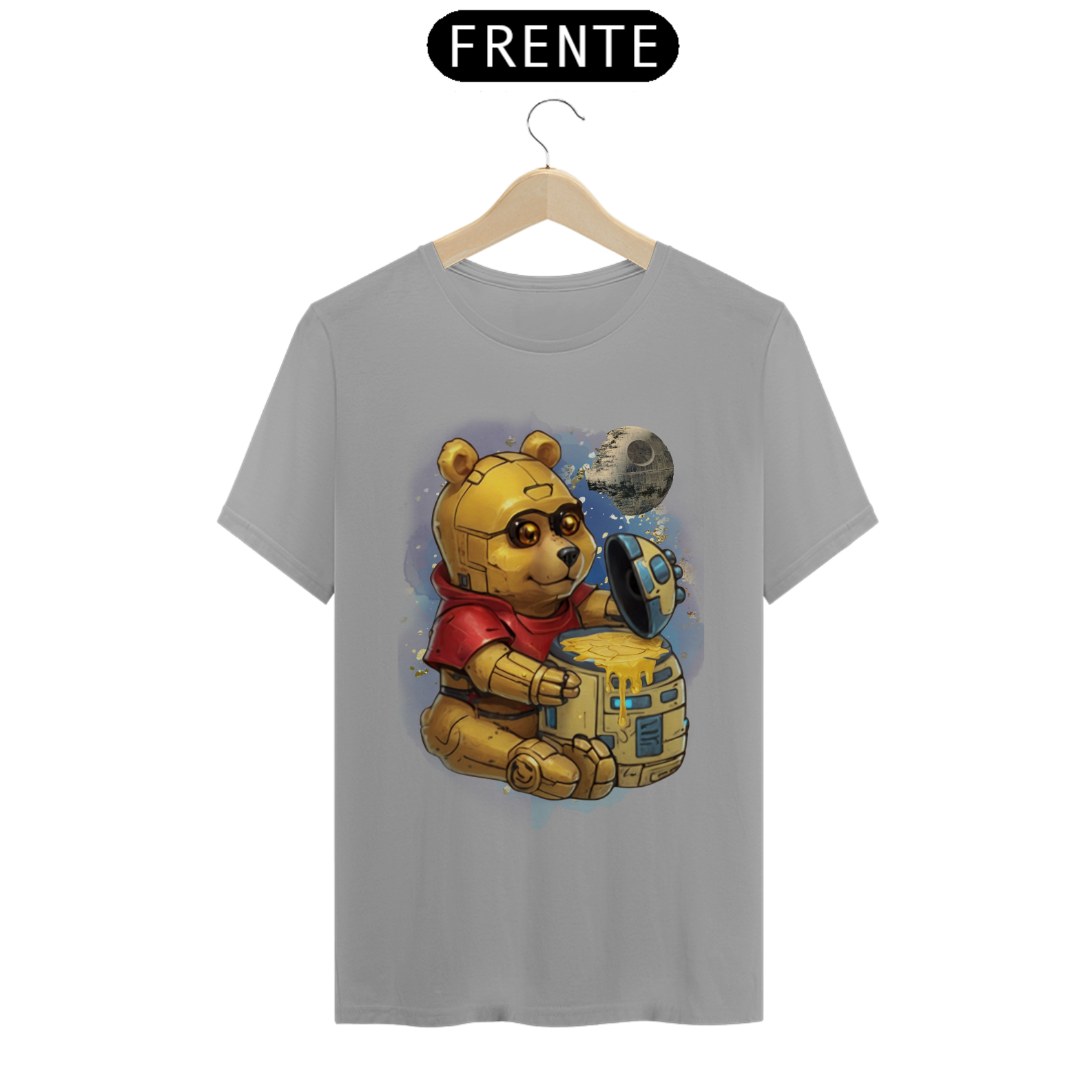 Esta camiseta oferece uma fusão épica entre ícones da cultura pop, apresentando um adorável ursinho, reminiscente do clássico personagem Pooh, transformado em um robô semelhante ao C3PO de Star Wars. Ele é retratado sentado diante de um pote de mel com o formato do robô R2D2, com uma lua ao fundo, moldada à semelhança da Estrela da Morte. Esta estampa criativa e única é uma celebração da criatividade e da diversidade na comunidade Gay Bear, perfeita para aqueles que desejam destacar seu amor pela cultura geek enquanto expressam seu orgulho LGBTQ+.