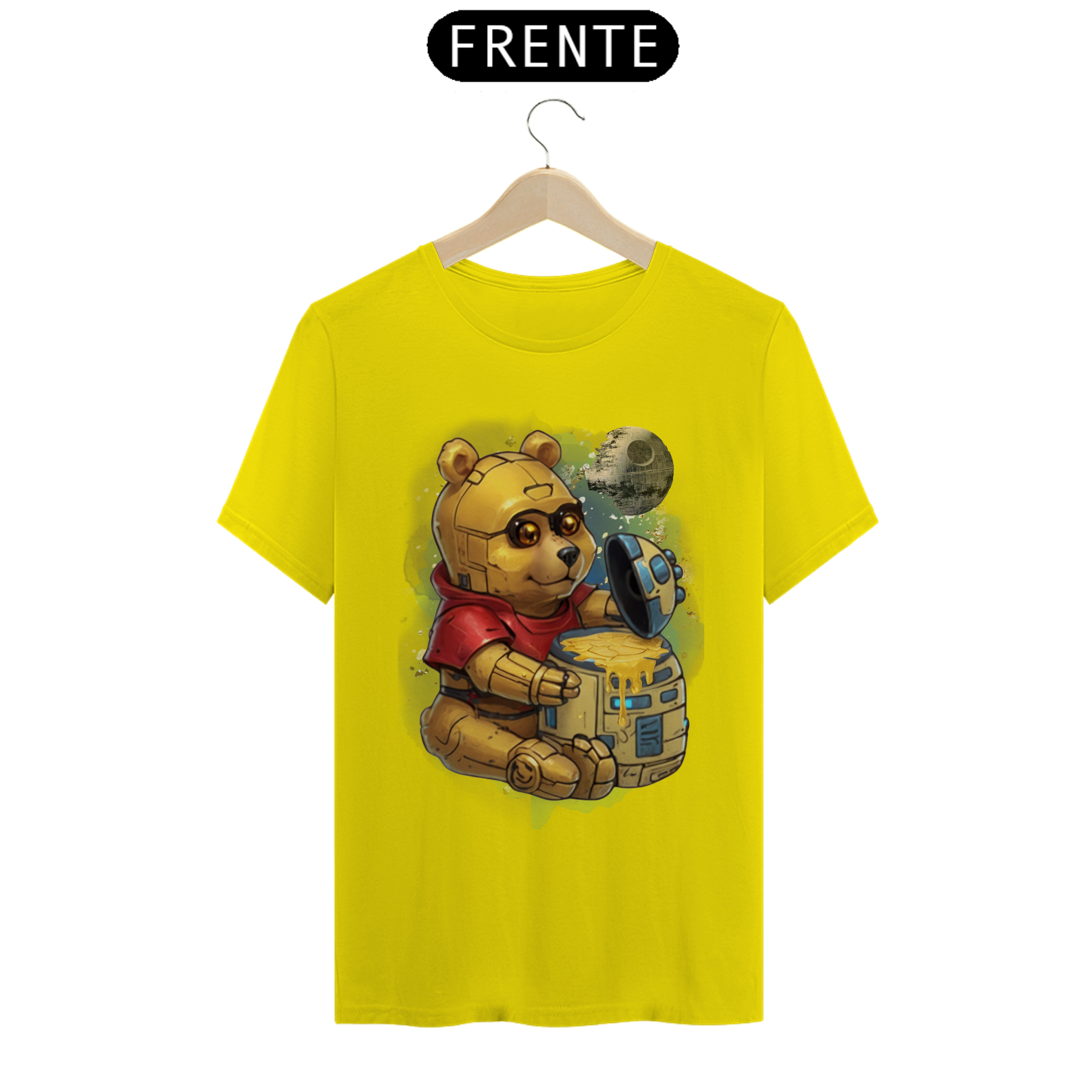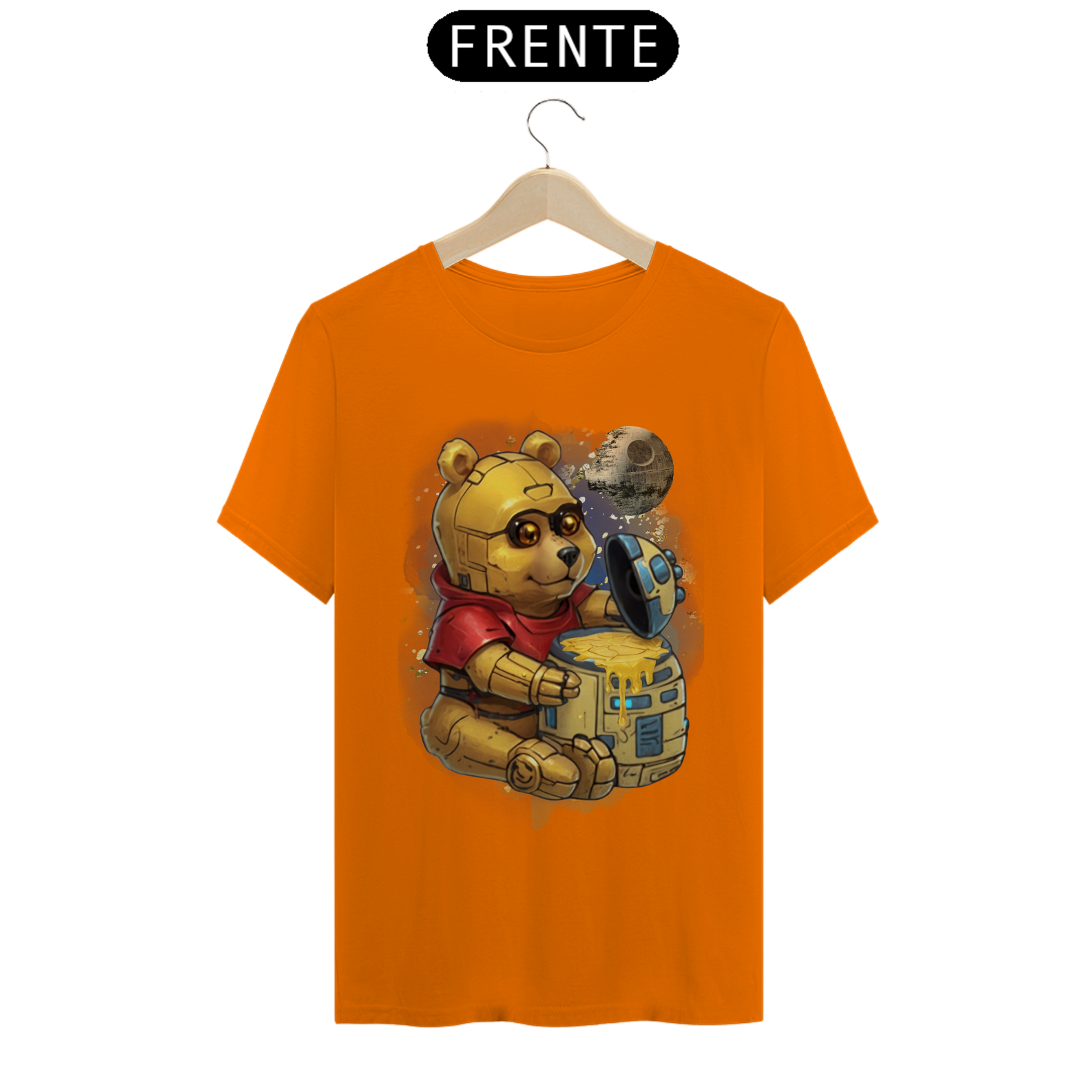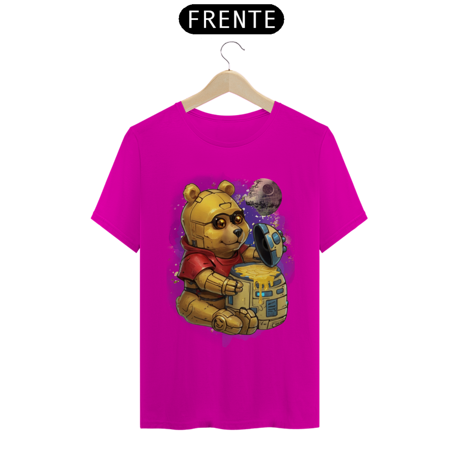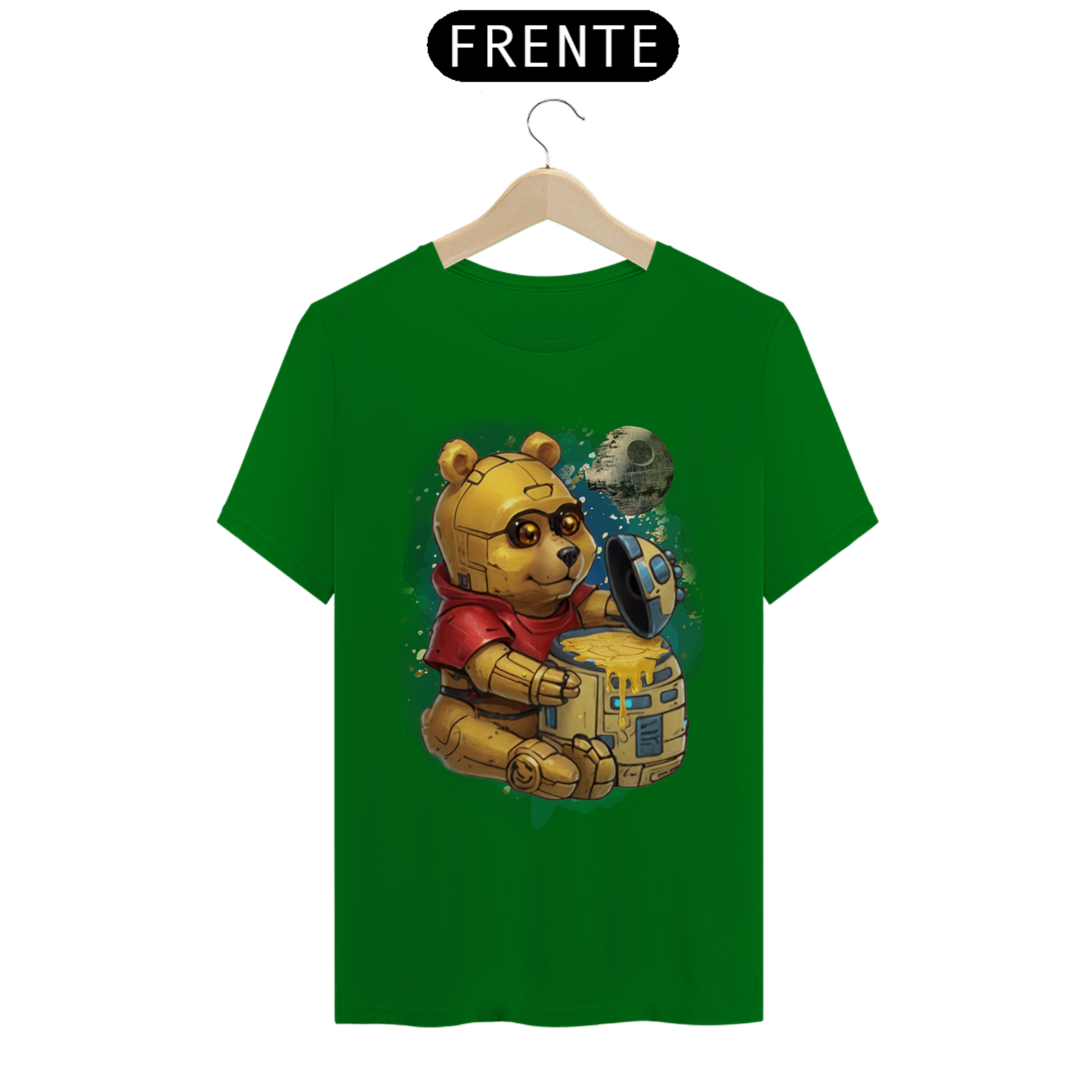 Esta camiseta oferece uma fusão épica entre ícones da cultura pop, apresentando um adorável ursinho, reminiscente do clássico personagem Pooh, transformado em um robô semelhante ao C3PO de Star Wars. Ele é retratado sentado diante de um pote de mel com o formato do robô R2D2, com uma lua ao fundo, moldada à semelhança da Estrela da Morte. Esta estampa criativa e única é uma celebração da criatividade e da diversidade na comunidade Gay Bear, perfeita para aqueles que desejam destacar seu amor pela cultura geek enquanto expressam seu orgulho LGBTQ+.