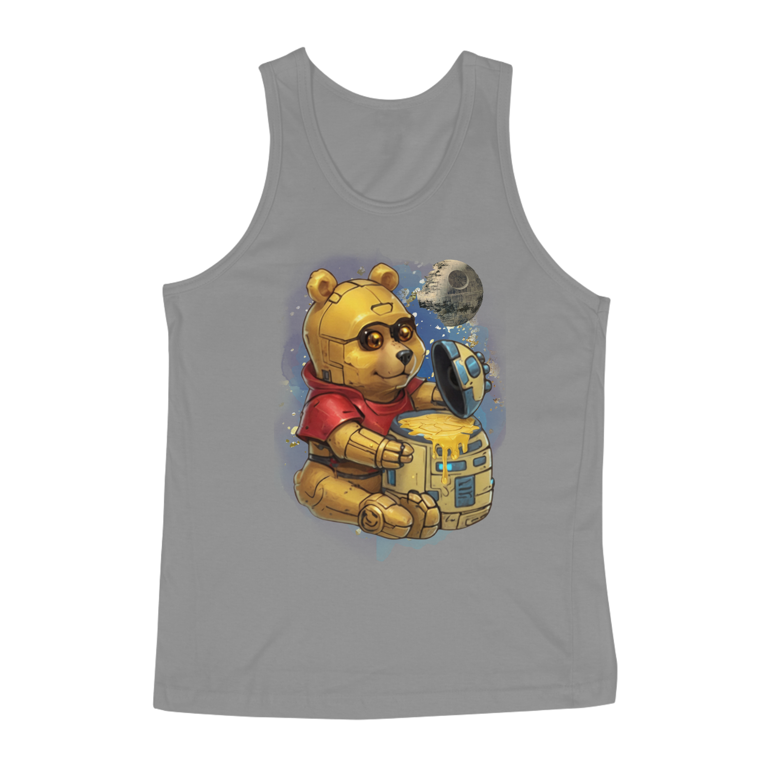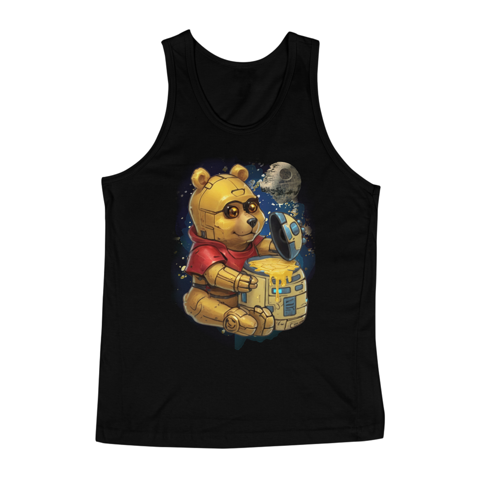 Esta camiseta oferece uma fusão épica entre ícones da cultura pop, apresentando um adorável ursinho, reminiscente do clássico personagem Pooh, transformado em um robô semelhante ao C3PO de Star Wars. Ele é retratado sentado diante de um pote de mel com o formato do robô R2D2, com uma lua ao fundo, moldada à semelhança da Estrela da Morte. Esta estampa criativa e única é uma celebração da criatividade e da diversidade na comunidade Gay Bear, perfeita para aqueles que desejam destacar seu amor pela cultura geek enquanto expressam seu orgulho LGBTQ+.