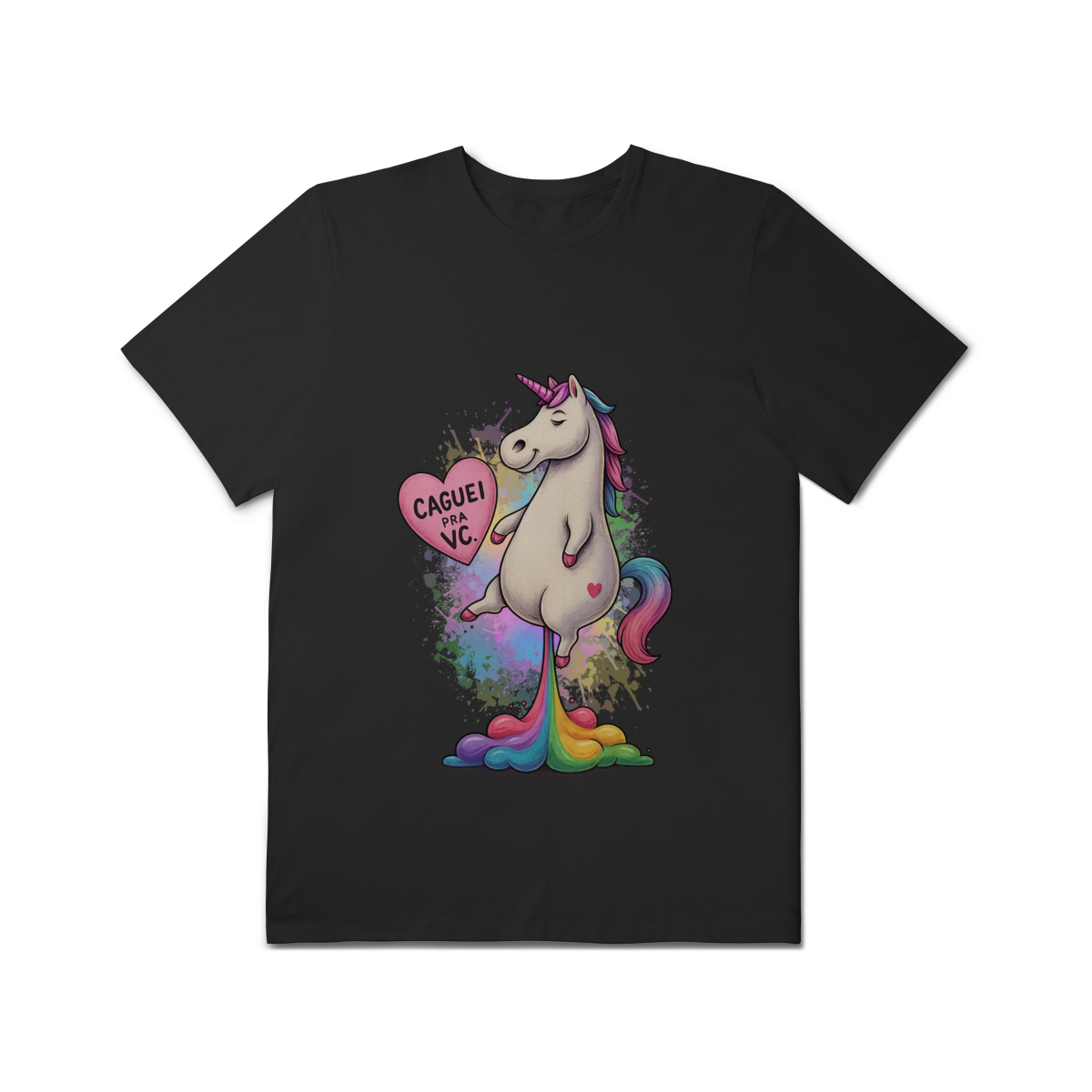 A estampa “Caguei pra Você” traz um unicórnio fabuloso e cheio de atitude, soltando um arco-íris enquanto segura um coração com a frase “Caguei pra você”. É uma mistura perfeita de humor ácido, estética queer e cores vibrantes — ideal para quem tem personalidade forte, sarcasmo afiado e orgulho de ser quem é.