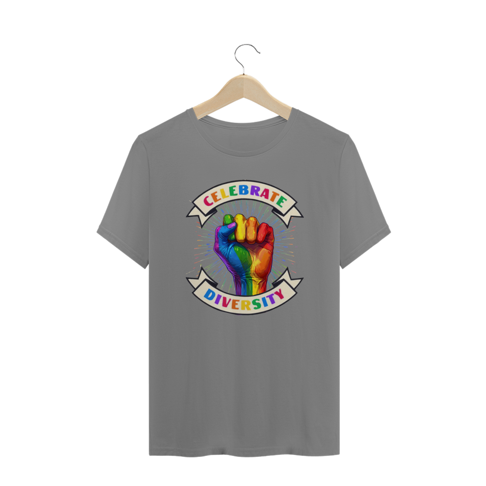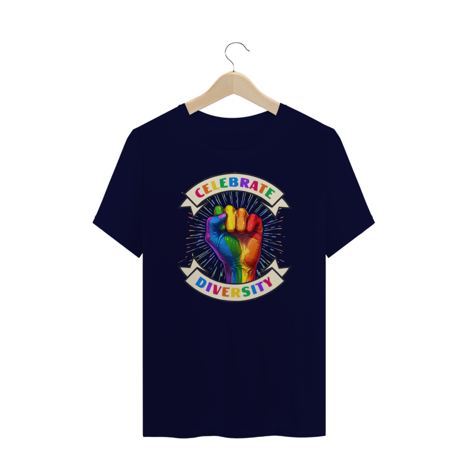 Esta estampa vibrante e poderosa apresenta uma mão erguida, pintada nas cores do arco-íris, simbolizando a diversidade e o orgulho LGBTQ+. Envolta por um banner que proclama "Celebrate Diversity", esta imagem transmite uma mensagem de inclusão, força e unidade. Os raios de cores emanando da mão destacam ainda mais a celebração das diferenças e a união dentro da comunidade.Perfeita para a comunidade Gay Bear, esta camiseta é uma declaração de apoio à diversidade e ao amor em todas as suas formas.