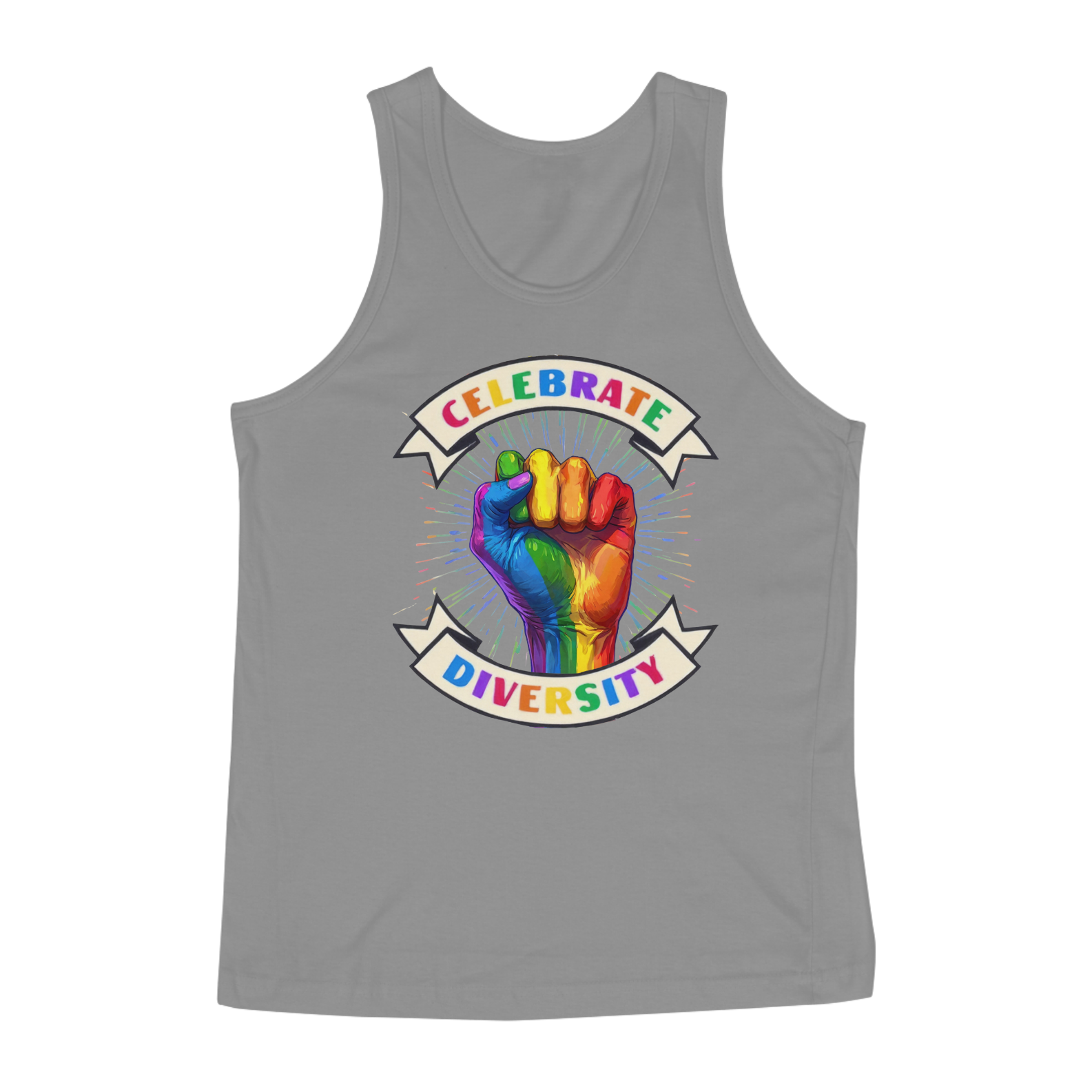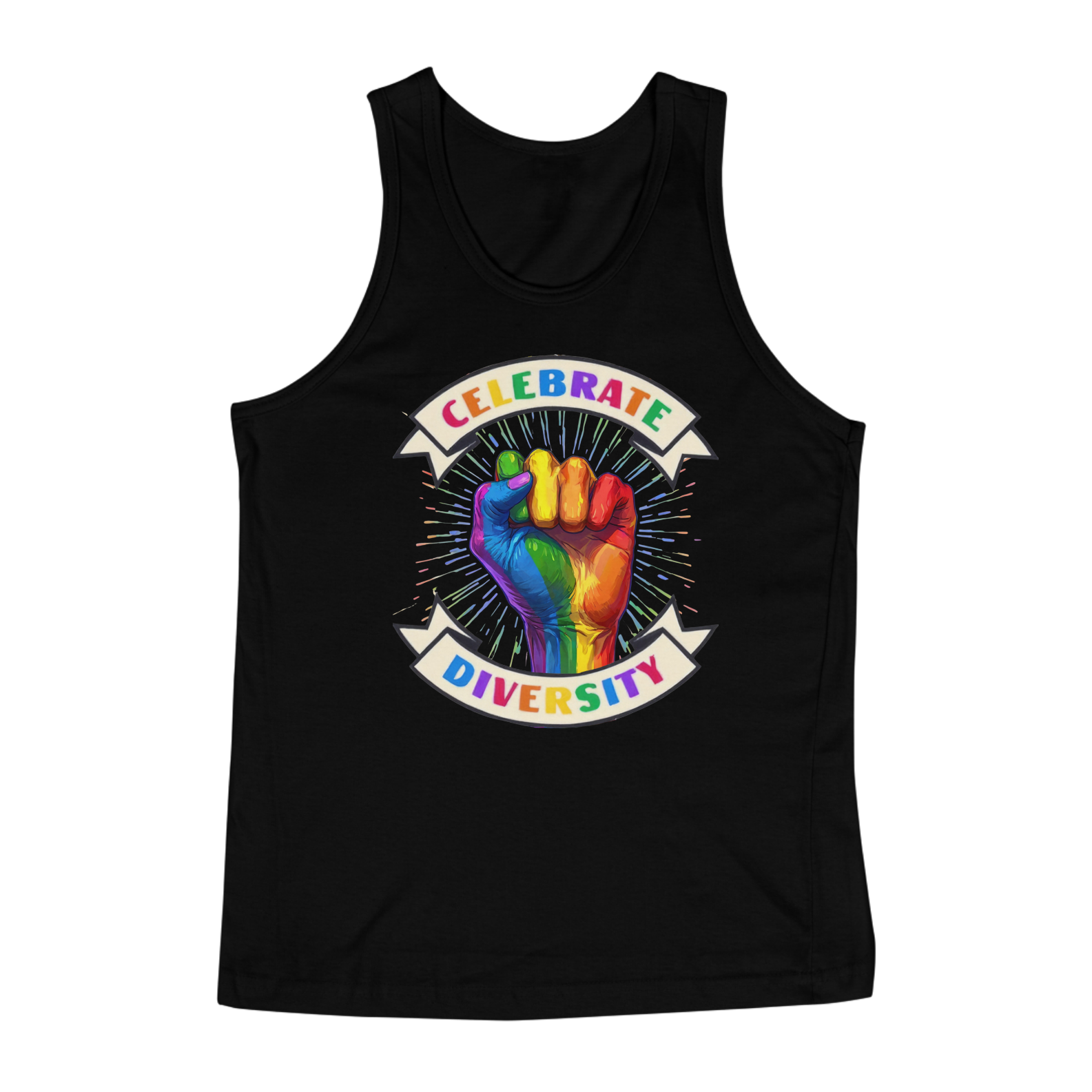 Esta estampa vibrante e poderosa apresenta uma mão erguida, pintada nas cores do arco-íris, simbolizando a diversidade e o orgulho LGBTQ+. Envolta por um banner que proclama "Celebrate Diversity", esta imagem transmite uma mensagem de inclusão, força e unidade. Os raios de cores emanando da mão destacam ainda mais a celebração das diferenças e a união dentro da comunidade.Perfeita para a comunidade Gay Bear, esta camiseta é uma declaração de apoio à diversidade e ao amor em todas as suas formas.