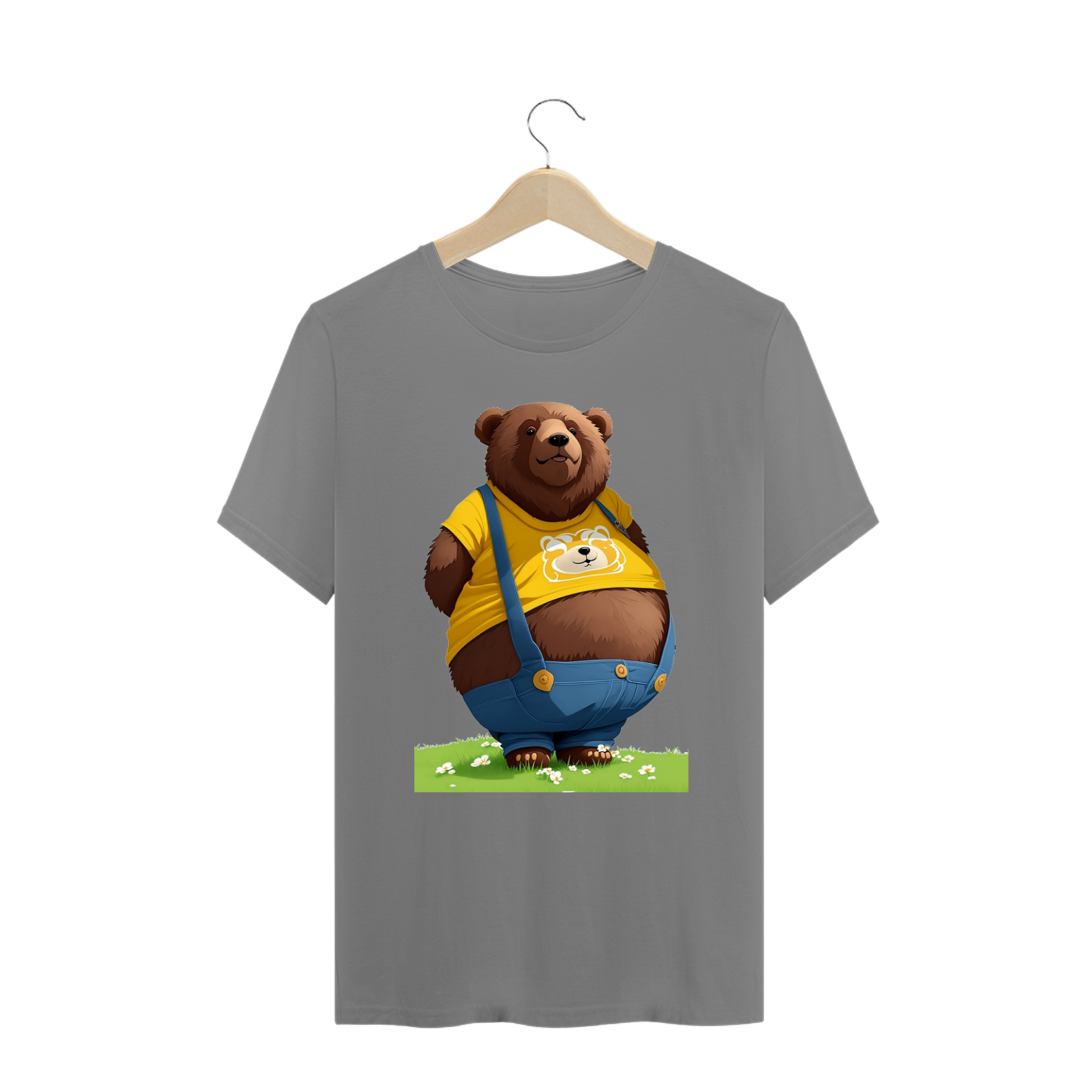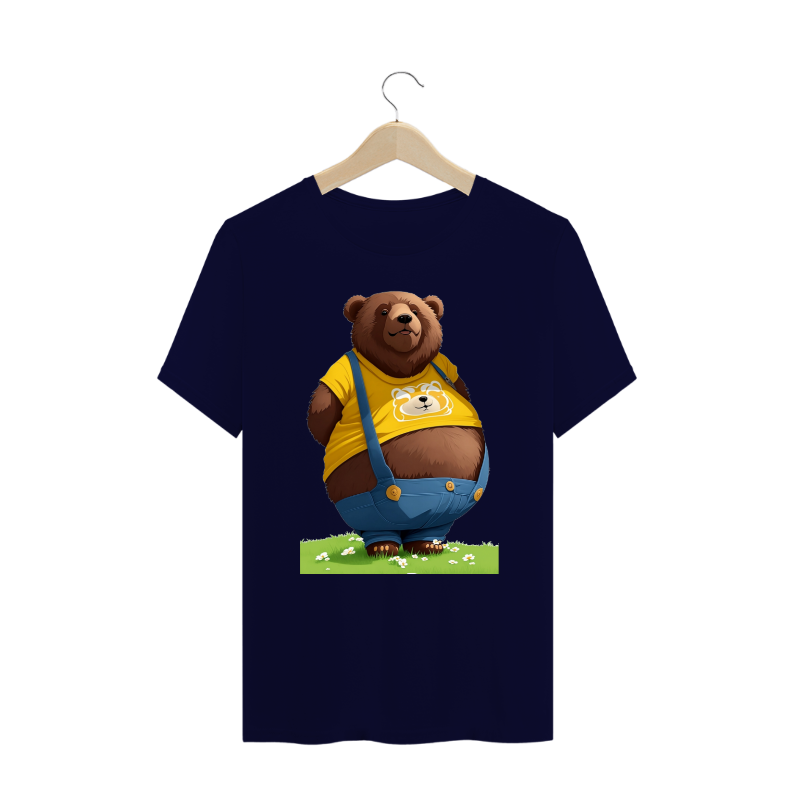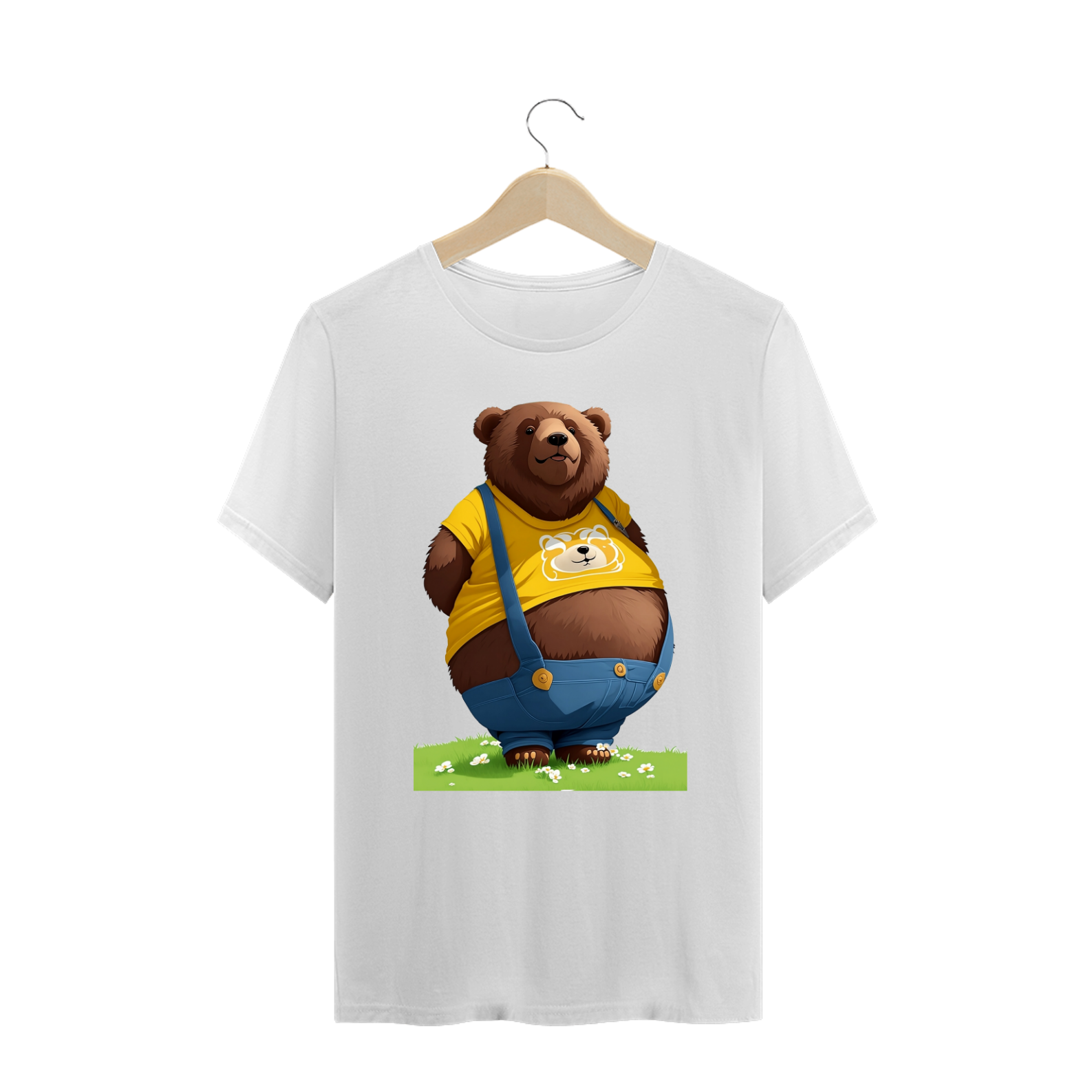 Apresentamos uma estampa que é um tributo à diversidade de corpos, à autoaceitação e ao orgulho de ser quem você é, especialmente criada para a vibrante comunidade Gaybear. Neste design, um urso simpático, com um físico cheio de curvas, veste uma camiseta amarela, bermuda e suspensórios jeans, mostrando com orgulho uma parte da barriga. Essa imagem é uma celebração da beleza de todos os tipos de corpos e da importância de se sentir confortável e confiante em sua própria pele.