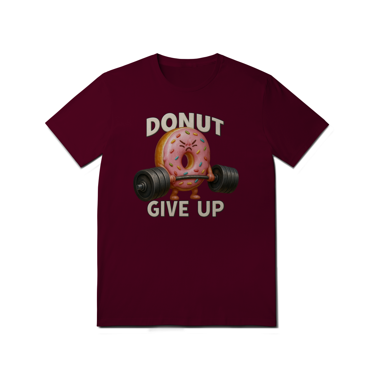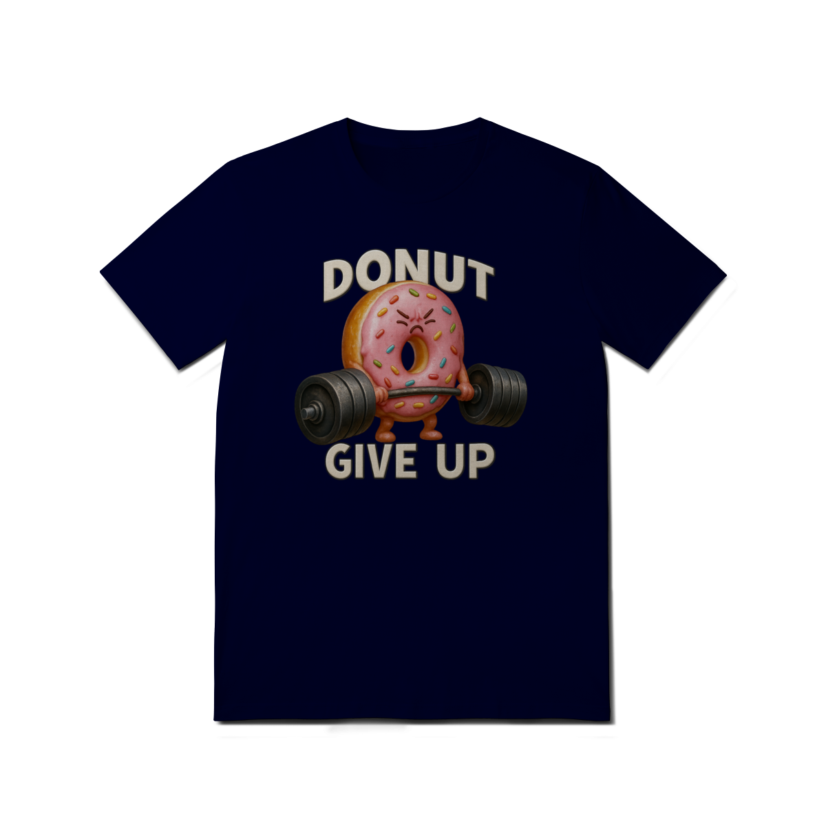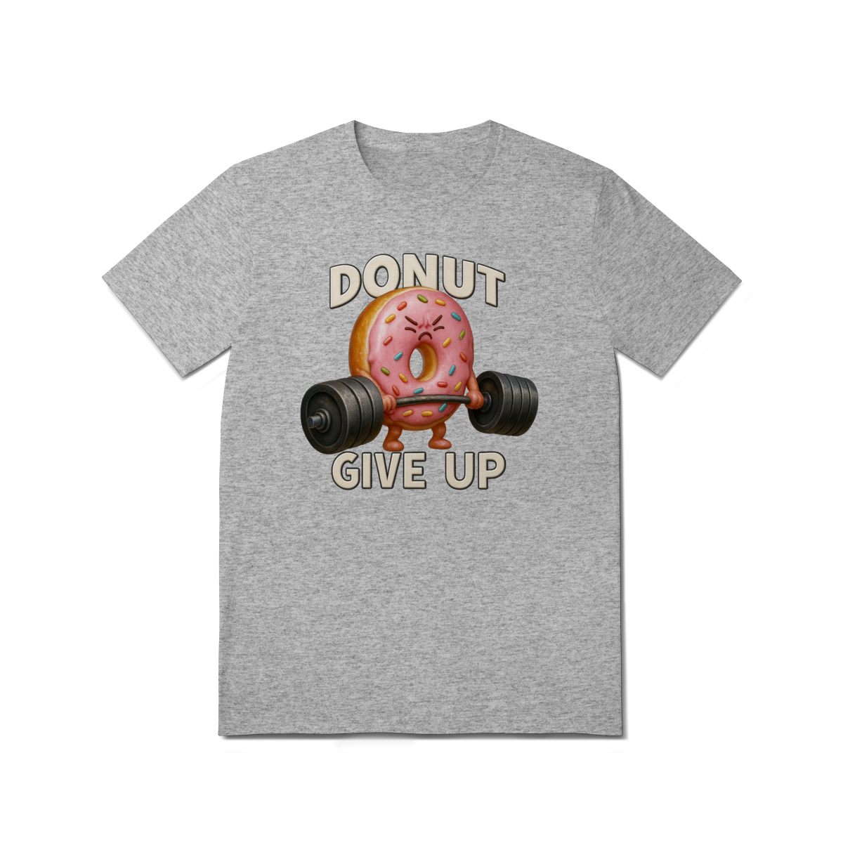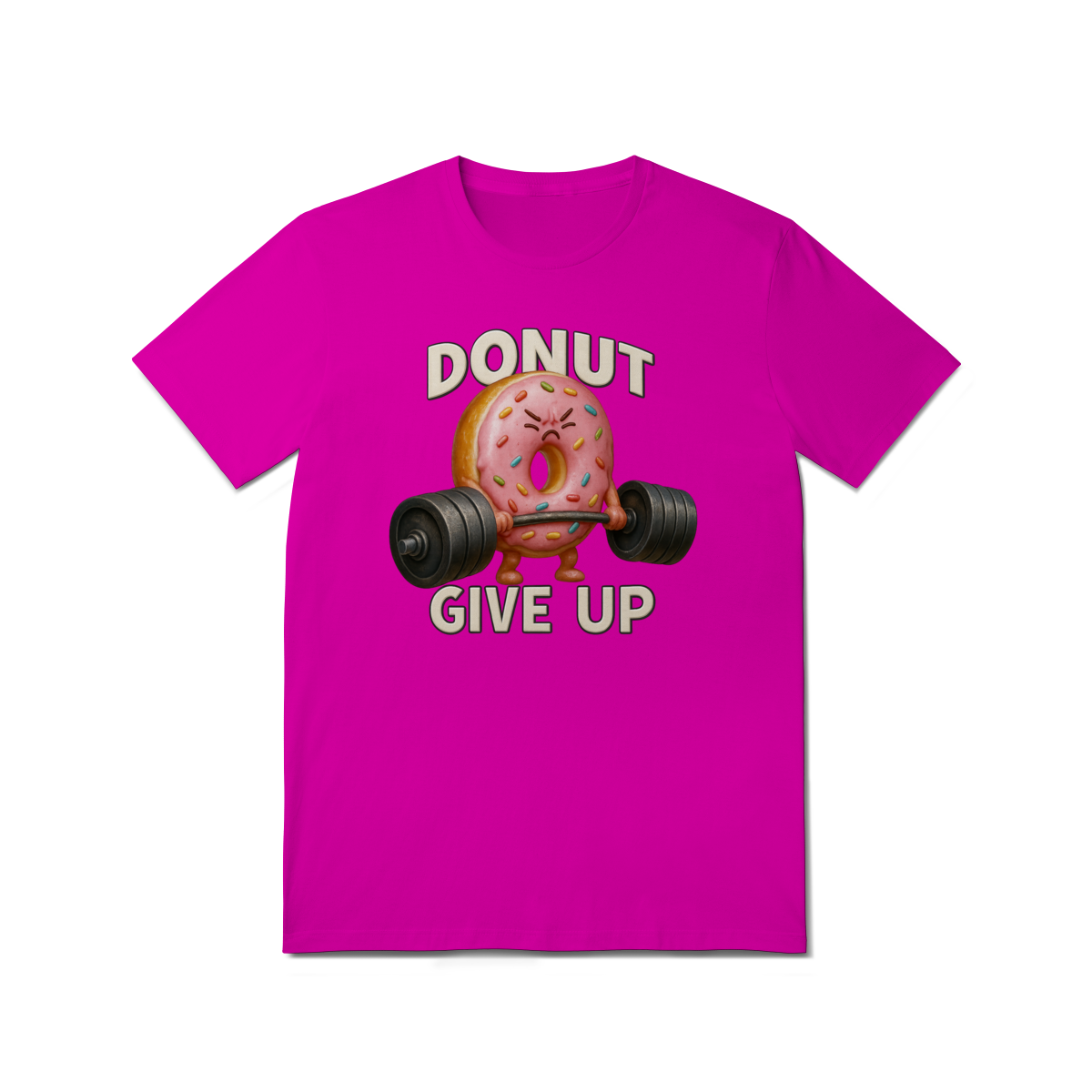 Essa estampa divertida traz um donut rosa musculoso levantando peso com a frase “Donut Give Up”, um trocadilho que combina humor e motivação. O visual é perfeito para quem curte o estilo fitness com um toque fofo e irônico — especialmente entre os ursos da comunidade LGBTQIA+, que valorizam força, autoaceitação e bom humor.