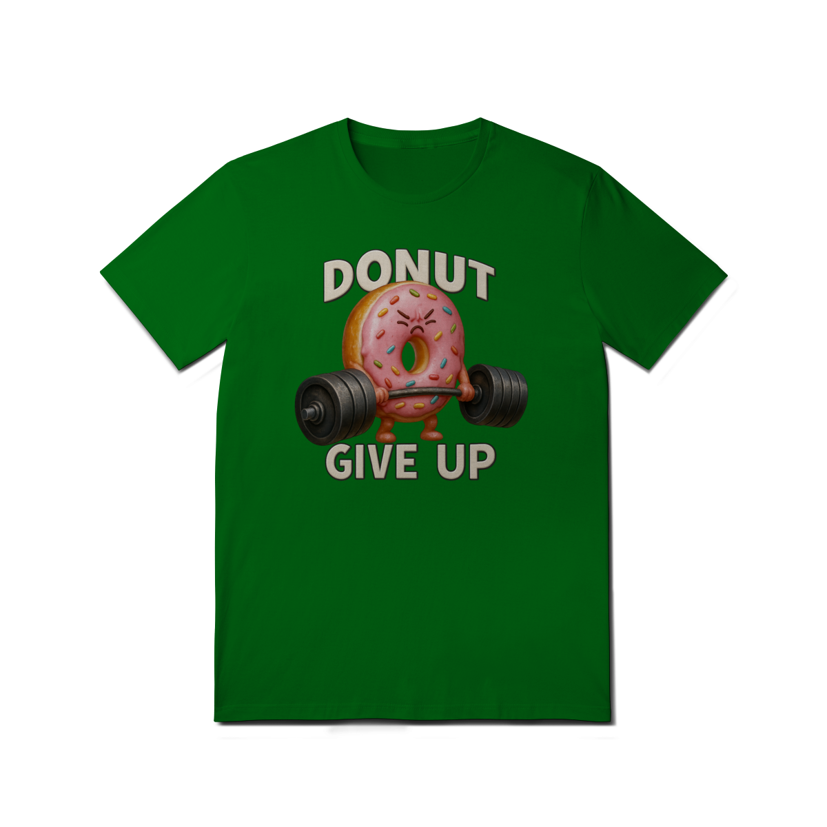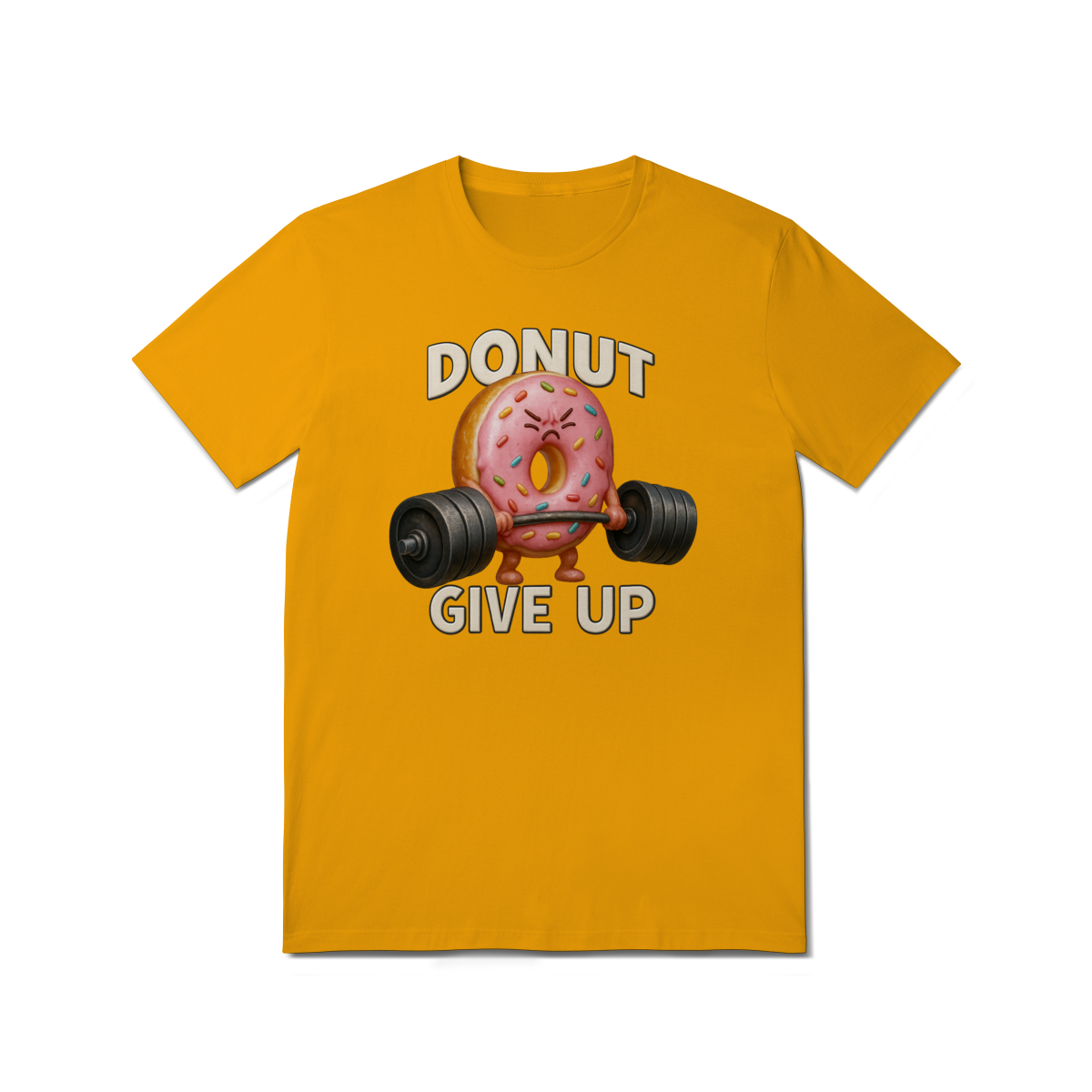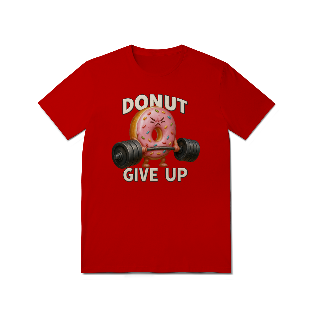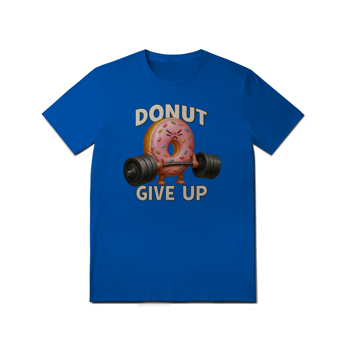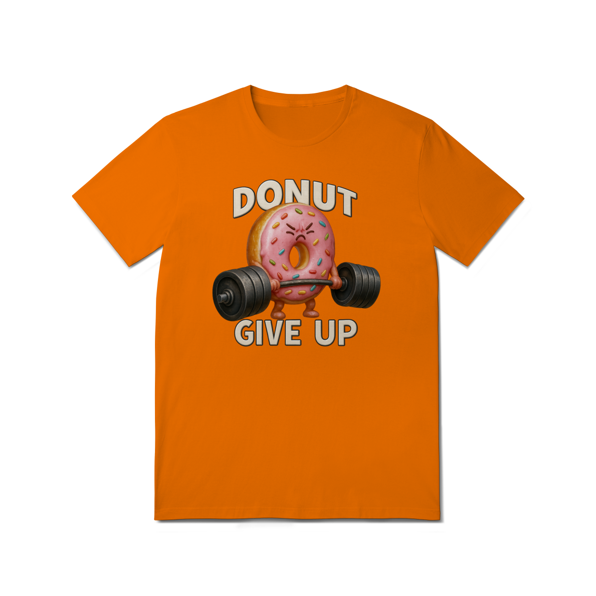 Essa estampa divertida traz um donut rosa musculoso levantando peso com a frase “Donut Give Up”, um trocadilho que combina humor e motivação. O visual é perfeito para quem curte o estilo fitness com um toque fofo e irônico — especialmente entre os ursos da comunidade LGBTQIA+, que valorizam força, autoaceitação e bom humor.