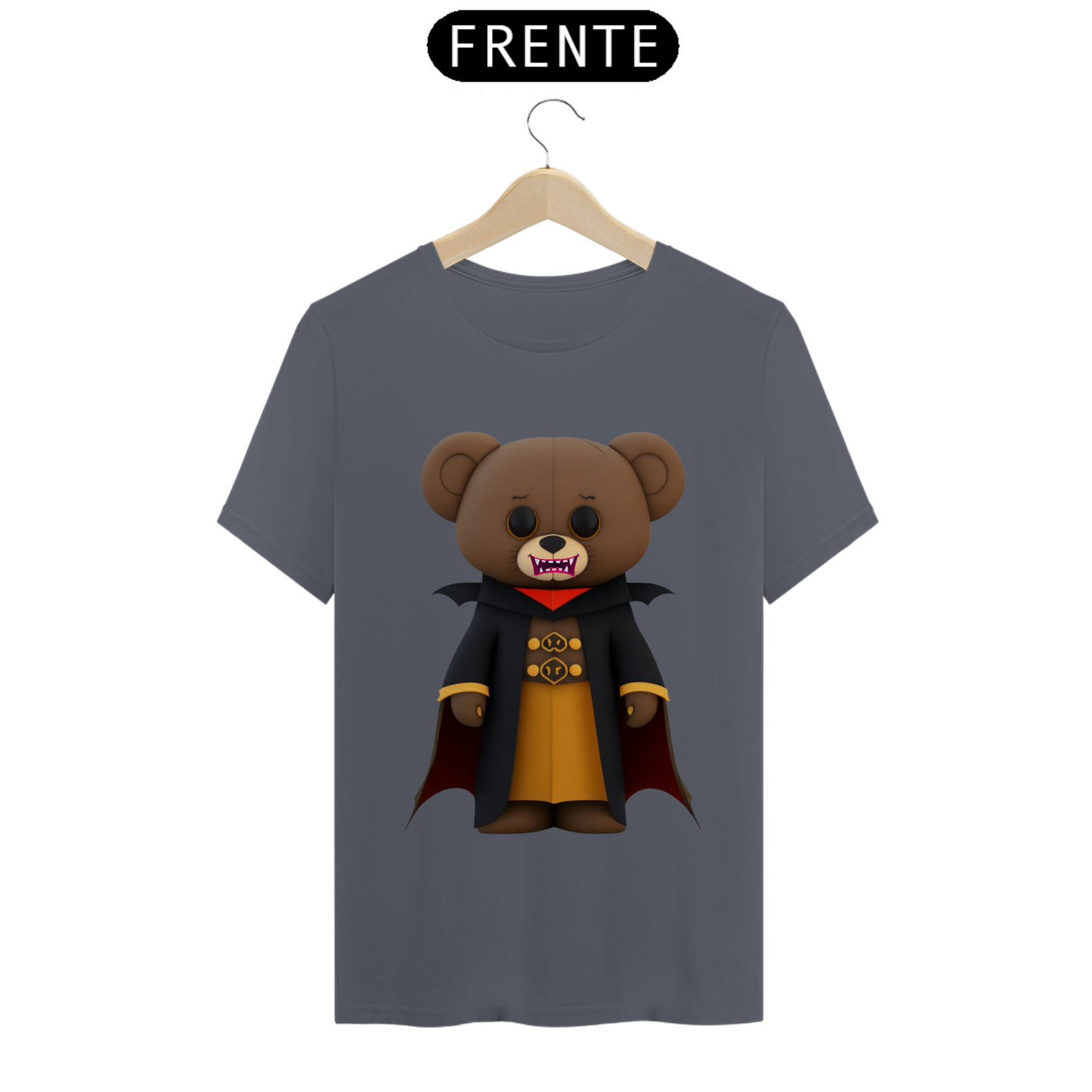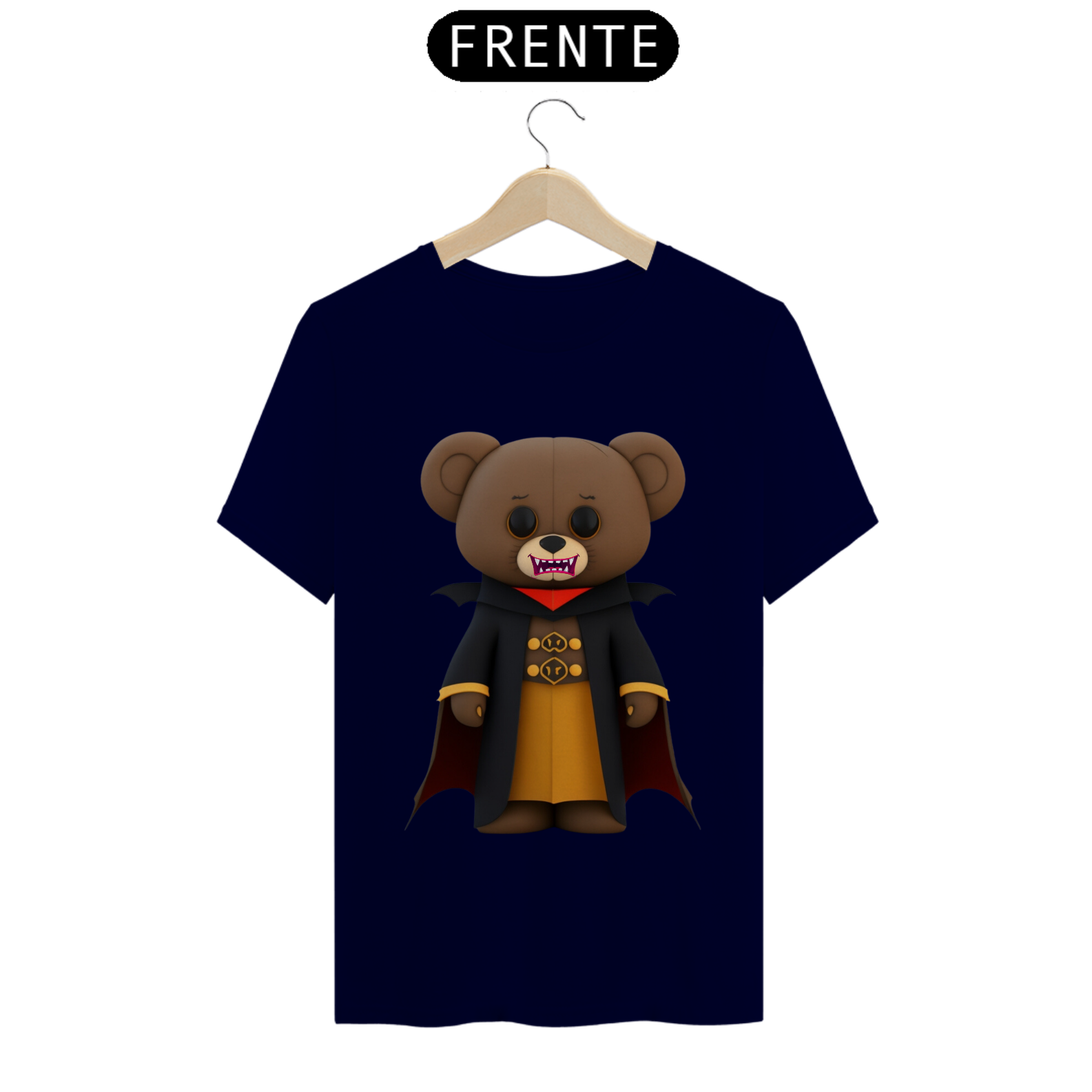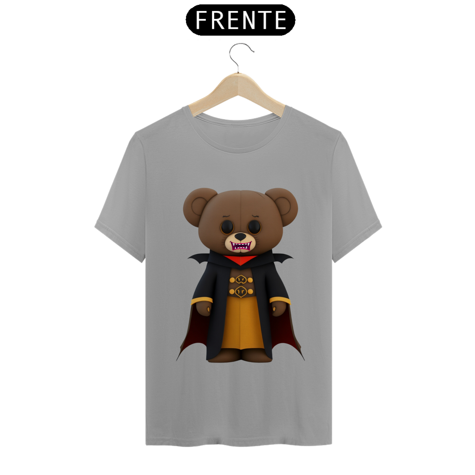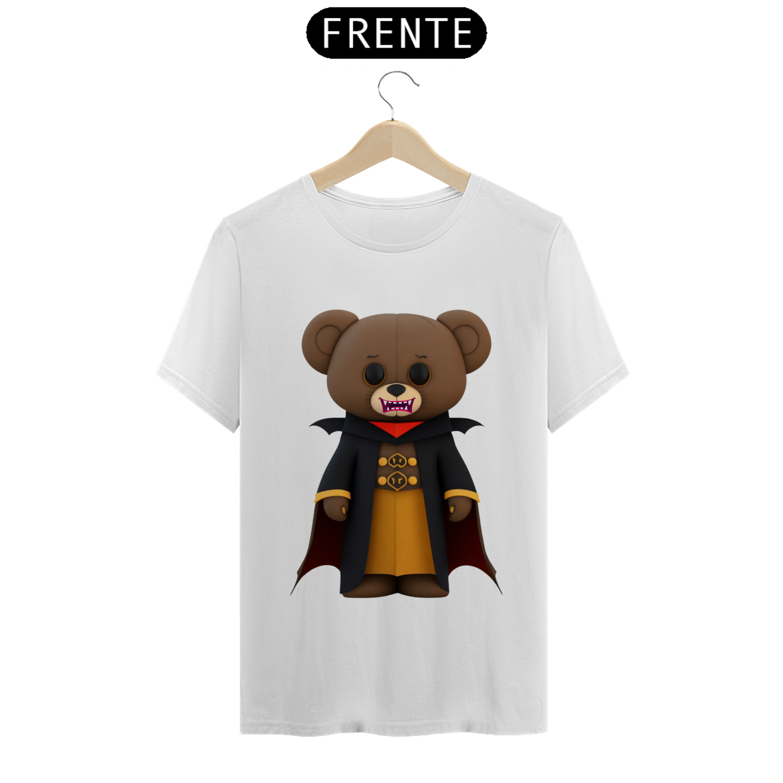O urso conde Drácula possui uma capa preta elegante, com gola alta e detalhes sofisticados. Seus olhos brilham com um toque de malícia. A estampa é rica em detalhes, com sombras e tons marcantes, criando uma atmosfera envolvente.