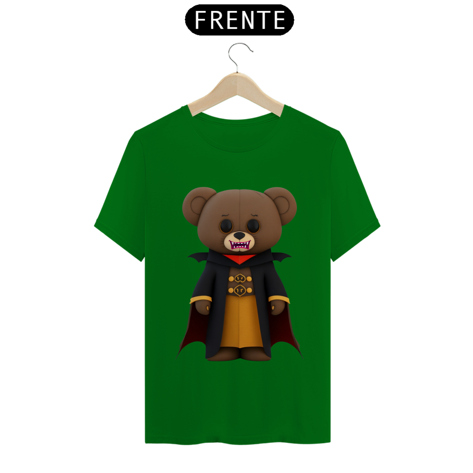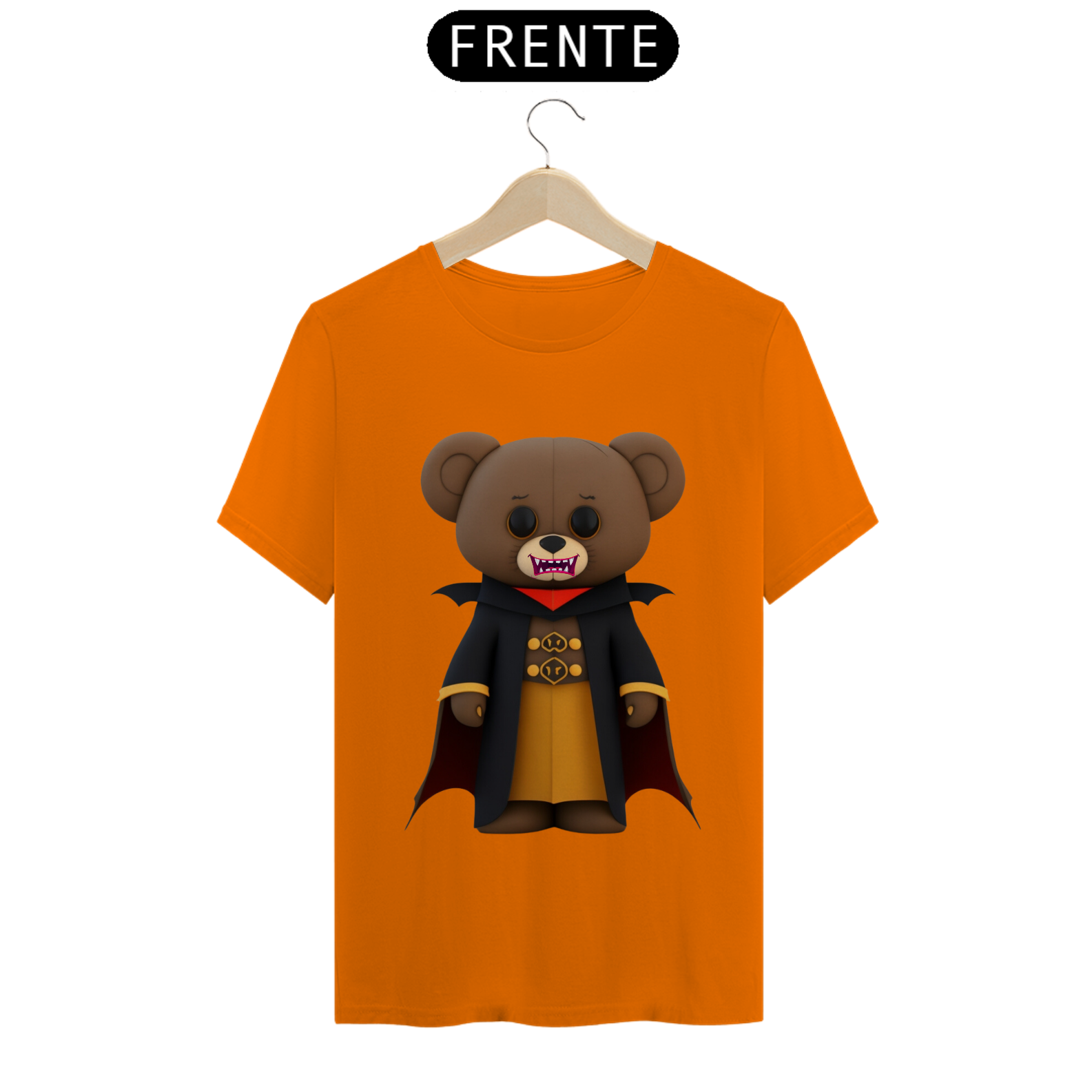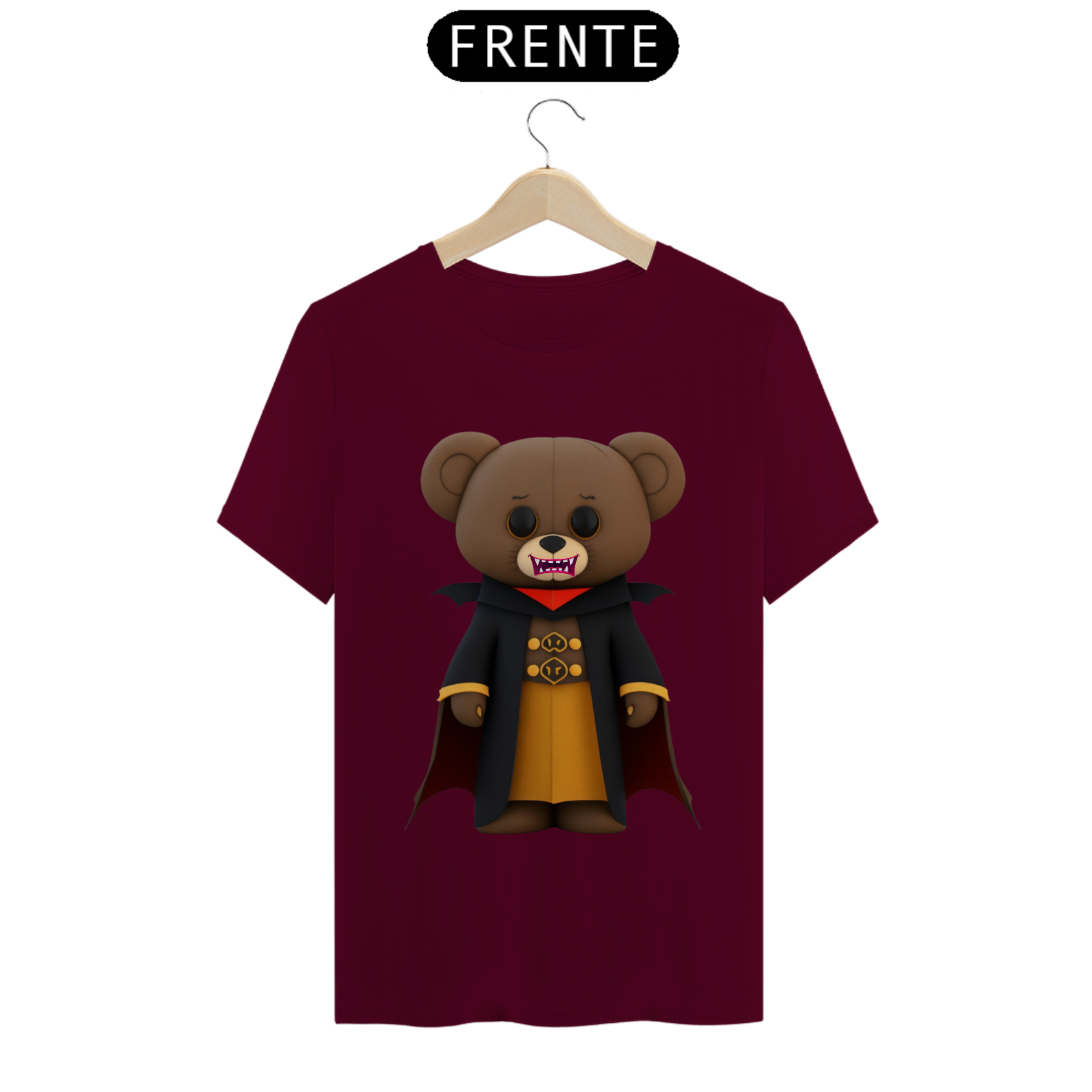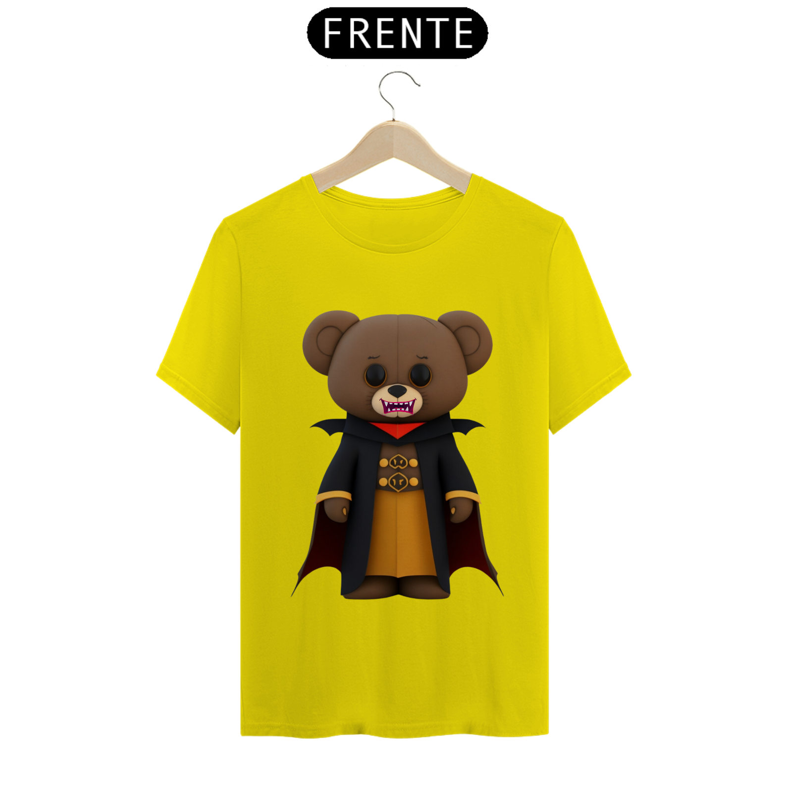 O urso conde Drácula possui uma capa preta elegante, com gola alta e detalhes sofisticados. Seus olhos brilham com um toque de malícia. A estampa é rica em detalhes, com sombras e tons marcantes, criando uma atmosfera envolvente.