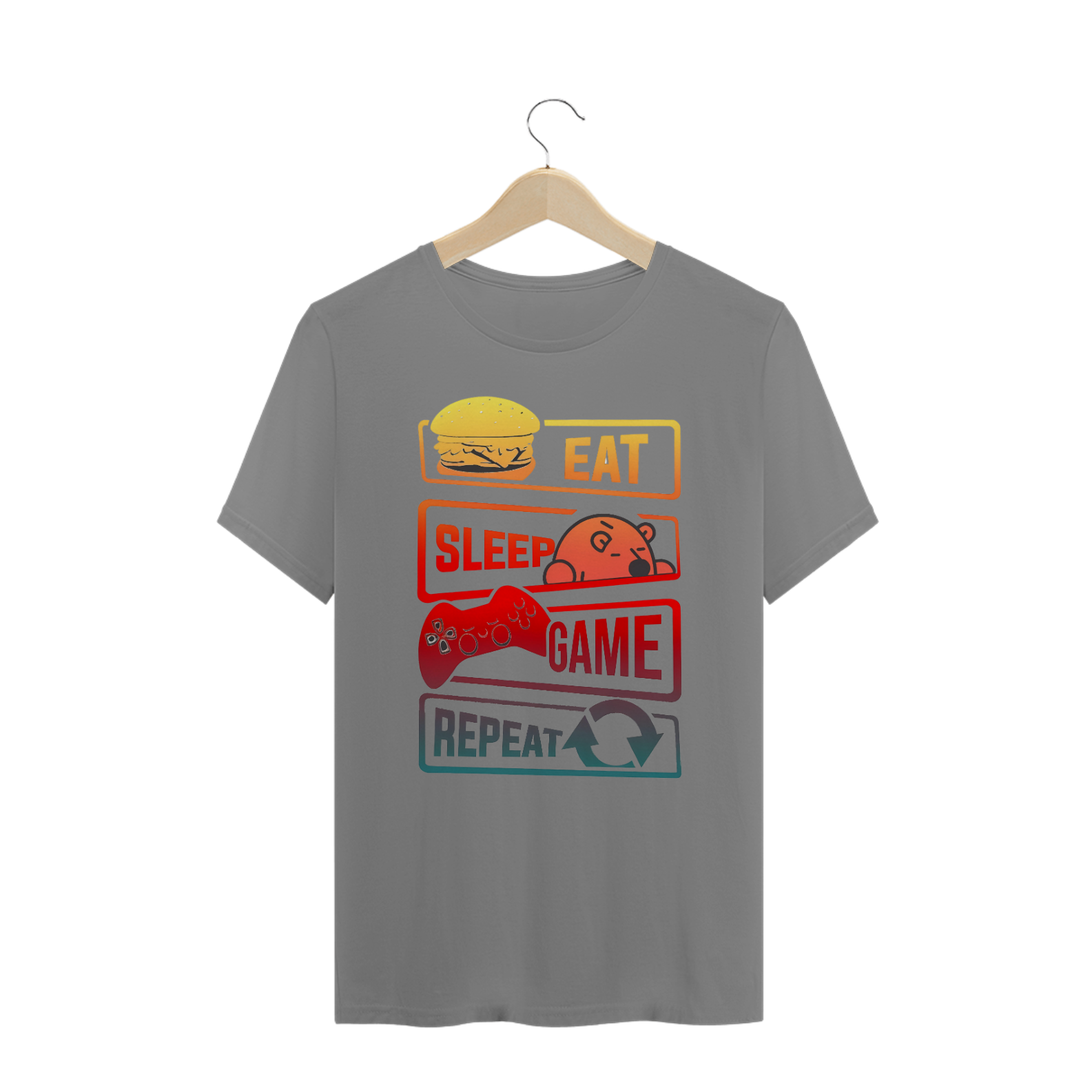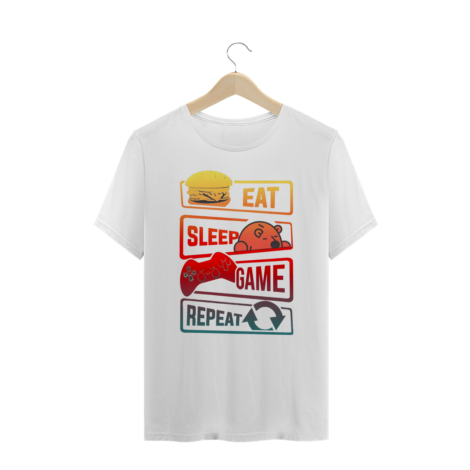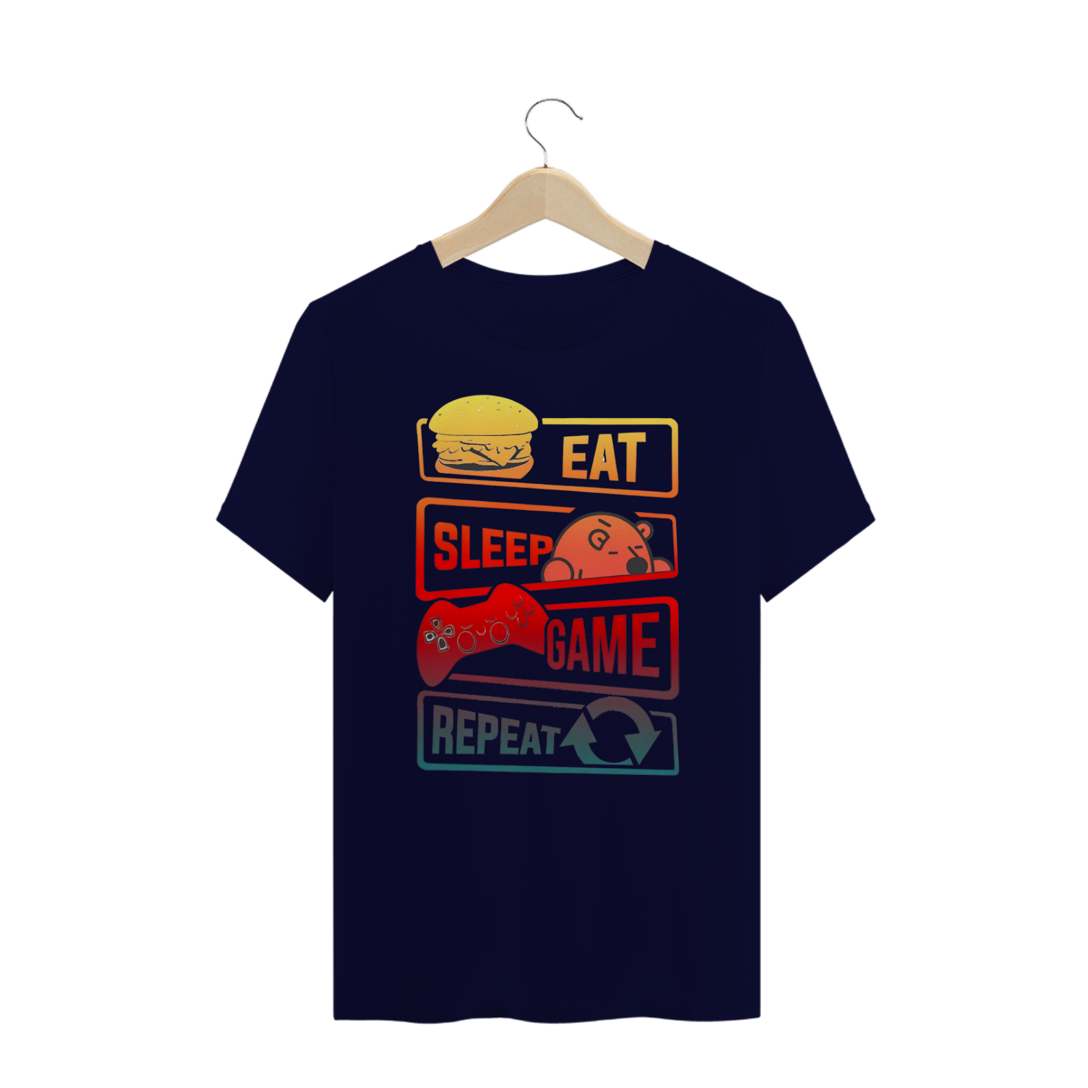 A estampa "Eat Sleep Game Repeat" é perfeita para a comunidade Gay Bear que adora games e um estilo de vida descontraído. Com elementos divertidos como um hambúrguer suculento representando "Eat", um ursinho dormindo representando "Sleep", um controle de videogame para "Game", e o símbolo de reciclagem para "Repeat", esta estampa captura o espírito do ciclo cotidiano de muitos gamers. O design utiliza cores vibrantes e contrastantes que adicionam um toque moderno e dinâmico à peça, tornando-a ideal para encontros casuais, eventos de jogos ou apenas para relaxar em casa. A camiseta "Eat Sleep Game Repeat" celebra a paixão pelo mundo dos games e a identidade da comunidade Bear, oferecendo um estilo único que combina conforto e personalidade. Seja como um presente para um amigo gamer ou para uso próprio, esta estampa é uma escolha divertida e expressiva que ressalta o orgulho e a diversão no dia a dia.