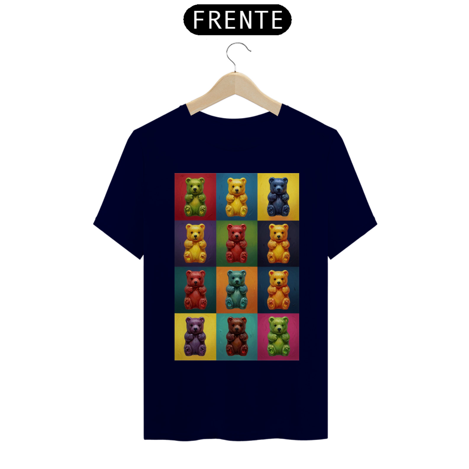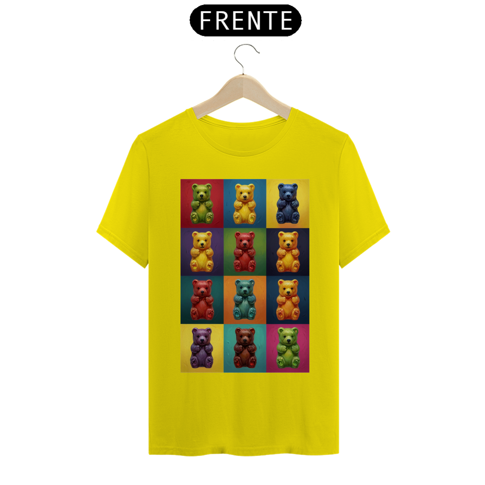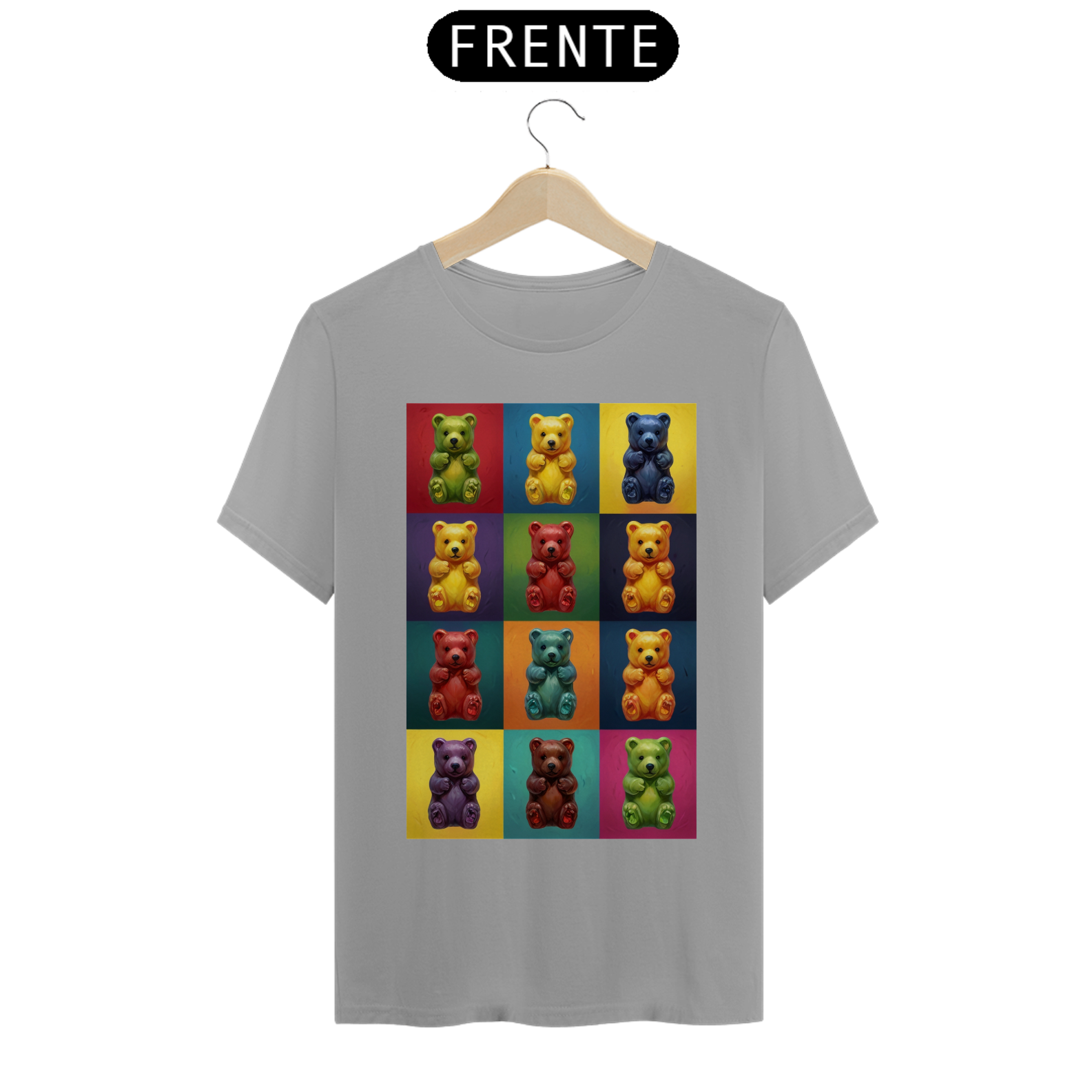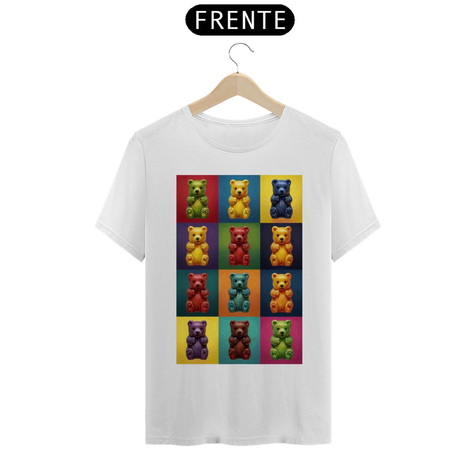 Desperte sua criatividade com esta camiseta única que combina a famosa estética de Andy Warhol com a comunidade vibrante Gay Bear. Doze adoráveis ursinhos de goma, cada um em seu próprio quadrado de cores vivas, criam uma obra de arte pop moderna que celebra a diversidade e a inclusão. Esta estampa é um tributo à individualidade e à expressão pessoal, perfeita para aqueles que desejam exibir orgulhosamente seu estilo e pertencimento à comunidade LGBTQ+.