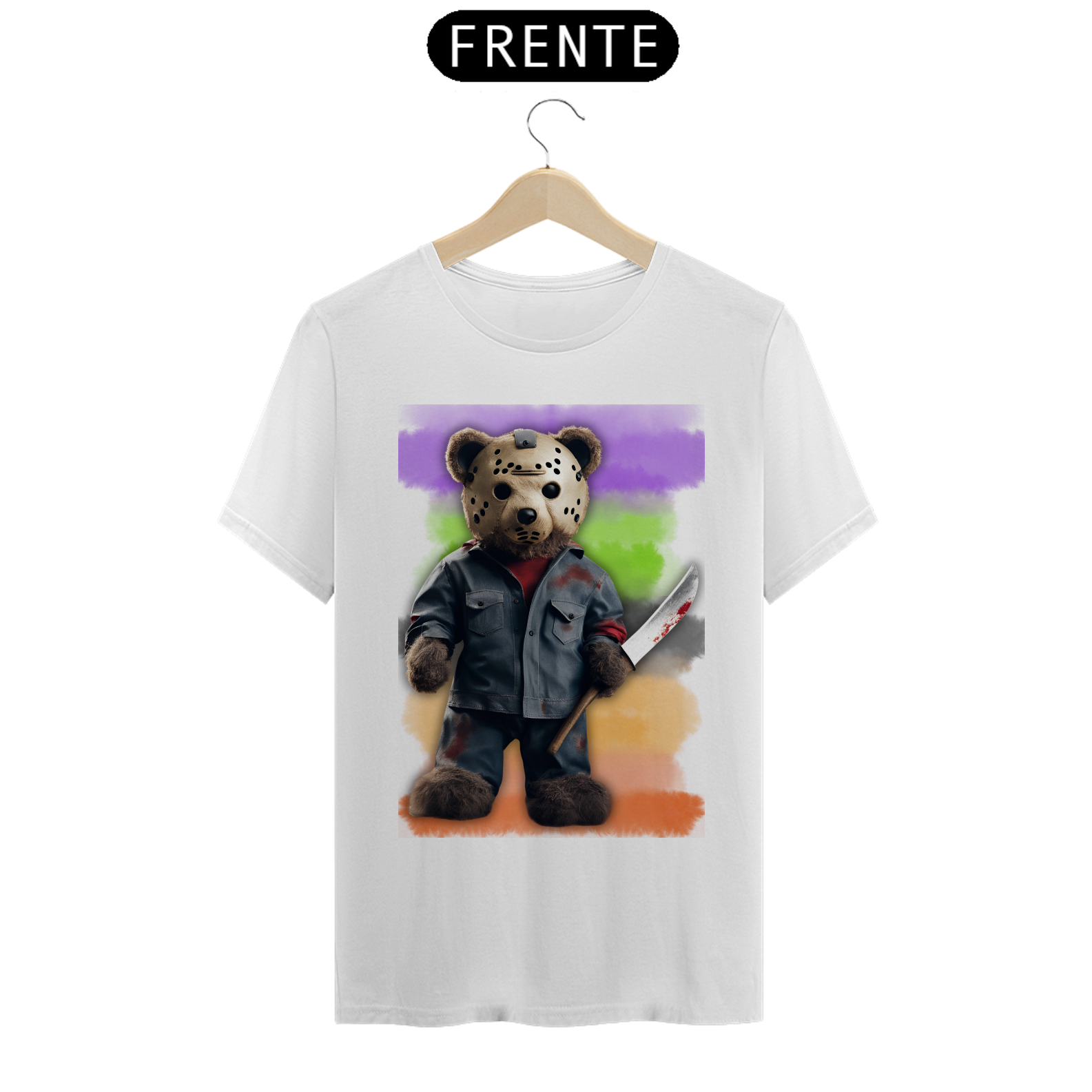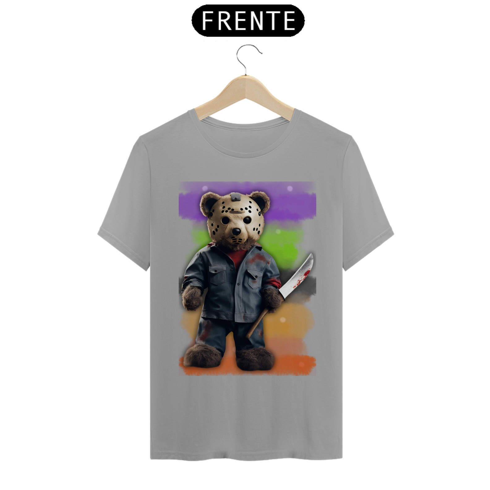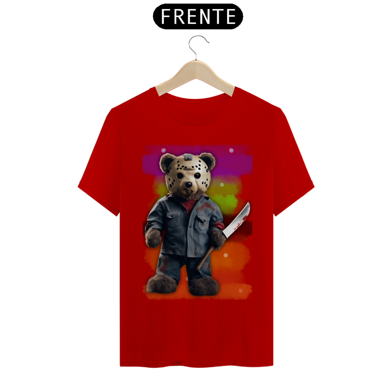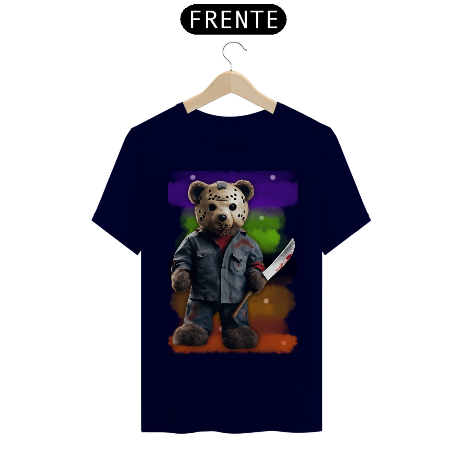 A estampa "Halloween Teddy Jason" traz uma releitura divertida e aterrorizante do clássico personagem de terror Jason Voorhees, combinando o icônico visual com a cultura Gay Bear. O ursão está vestido com uma roupa ensanguentada e segurando uma faca, trazendo uma mistura de fofura e horror que vai chamar a atenção em qualquer evento de Halloween. Ideal para quem deseja exibir seu orgulho Bear com um toque de humor sombrio, essa estampa é perfeita para a temporada assustadora. A combinação de um personagem icônico do horror com a estética Bear vai garantir que essa estampa seja um sucesso nas festas e eventos de Halloween!