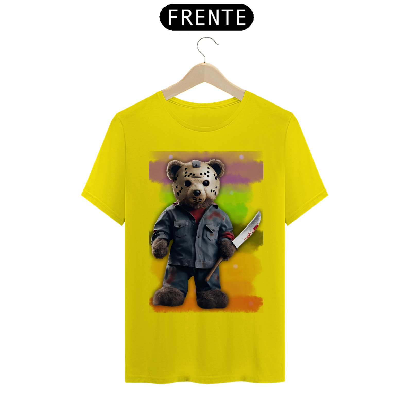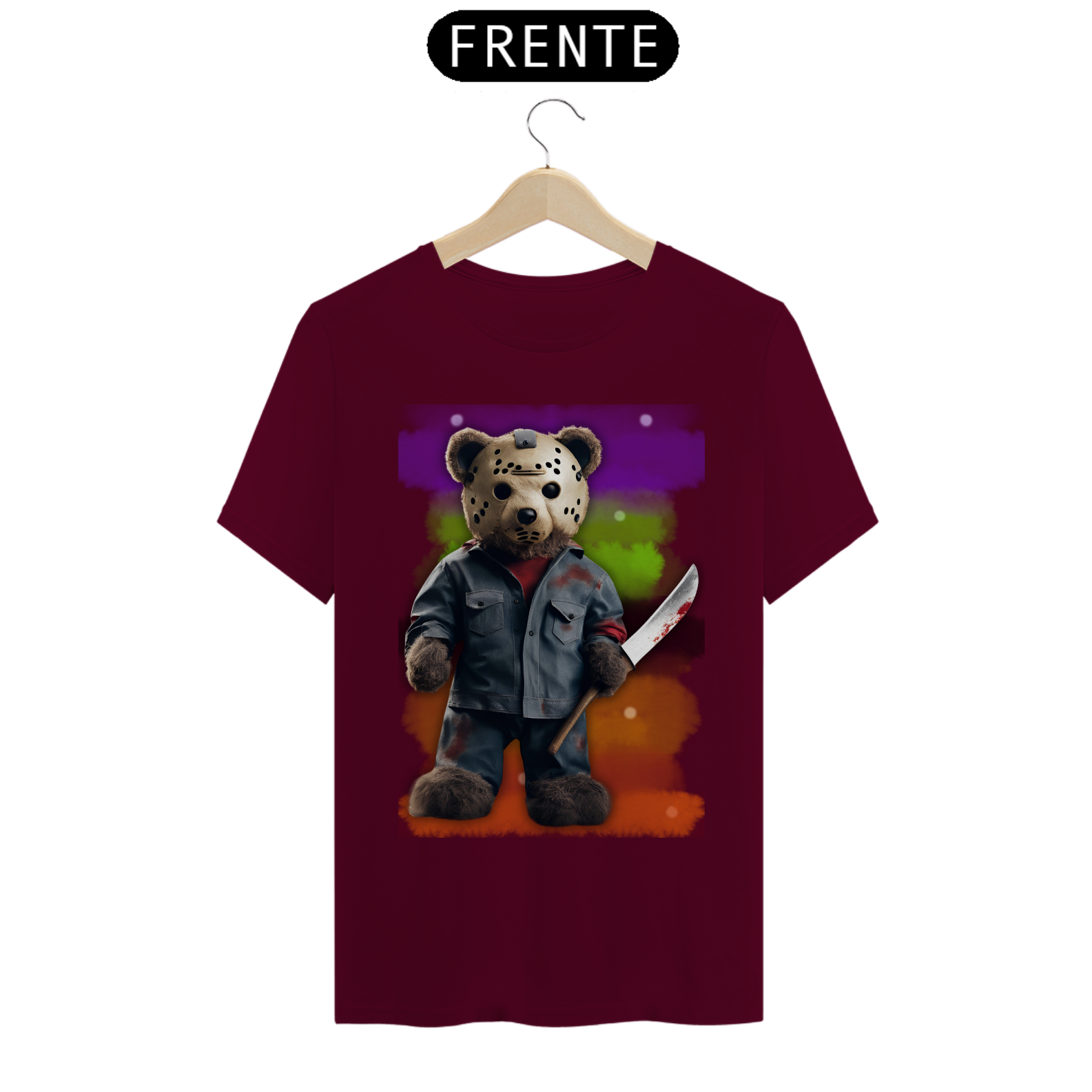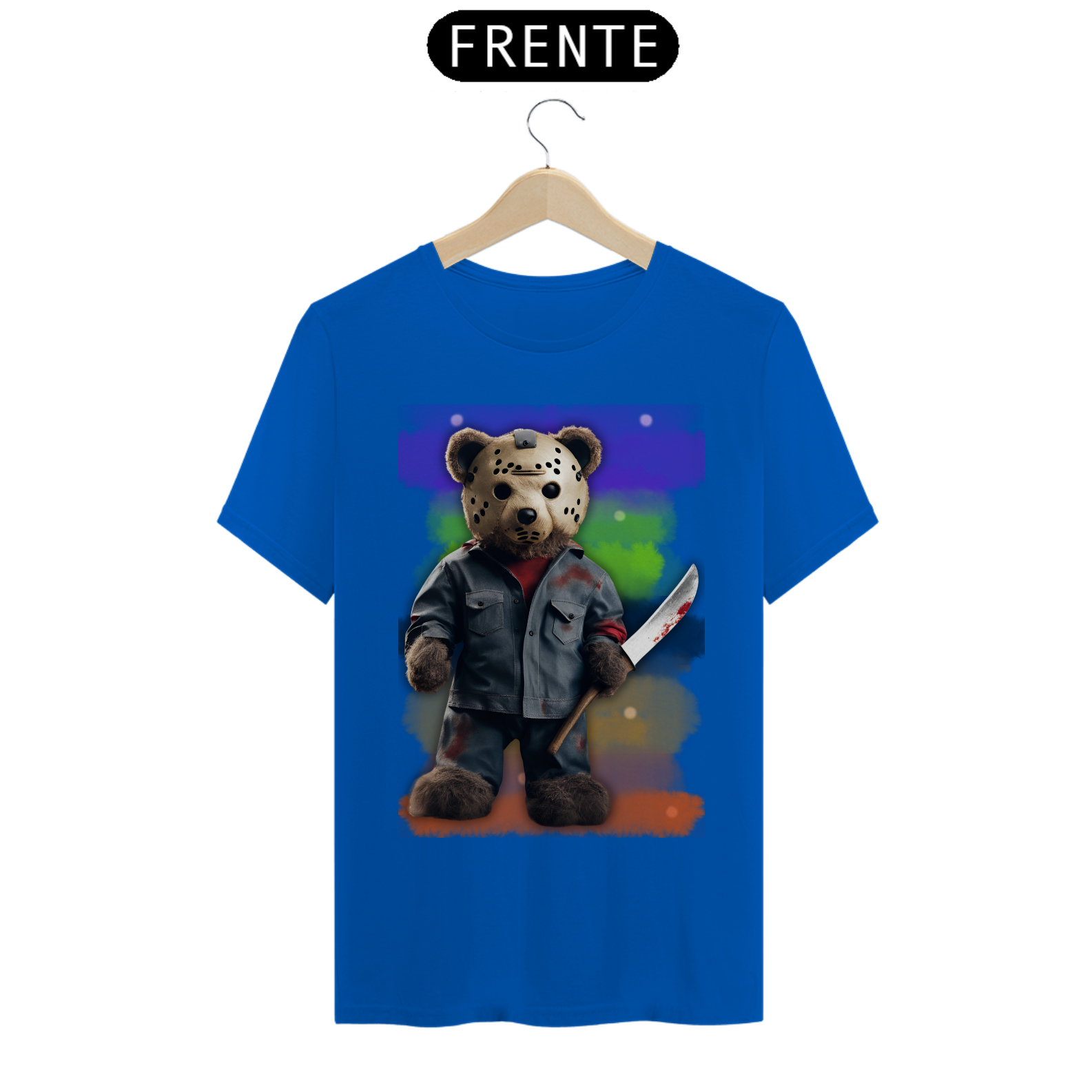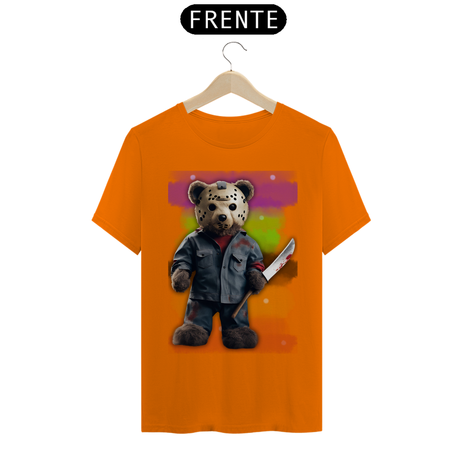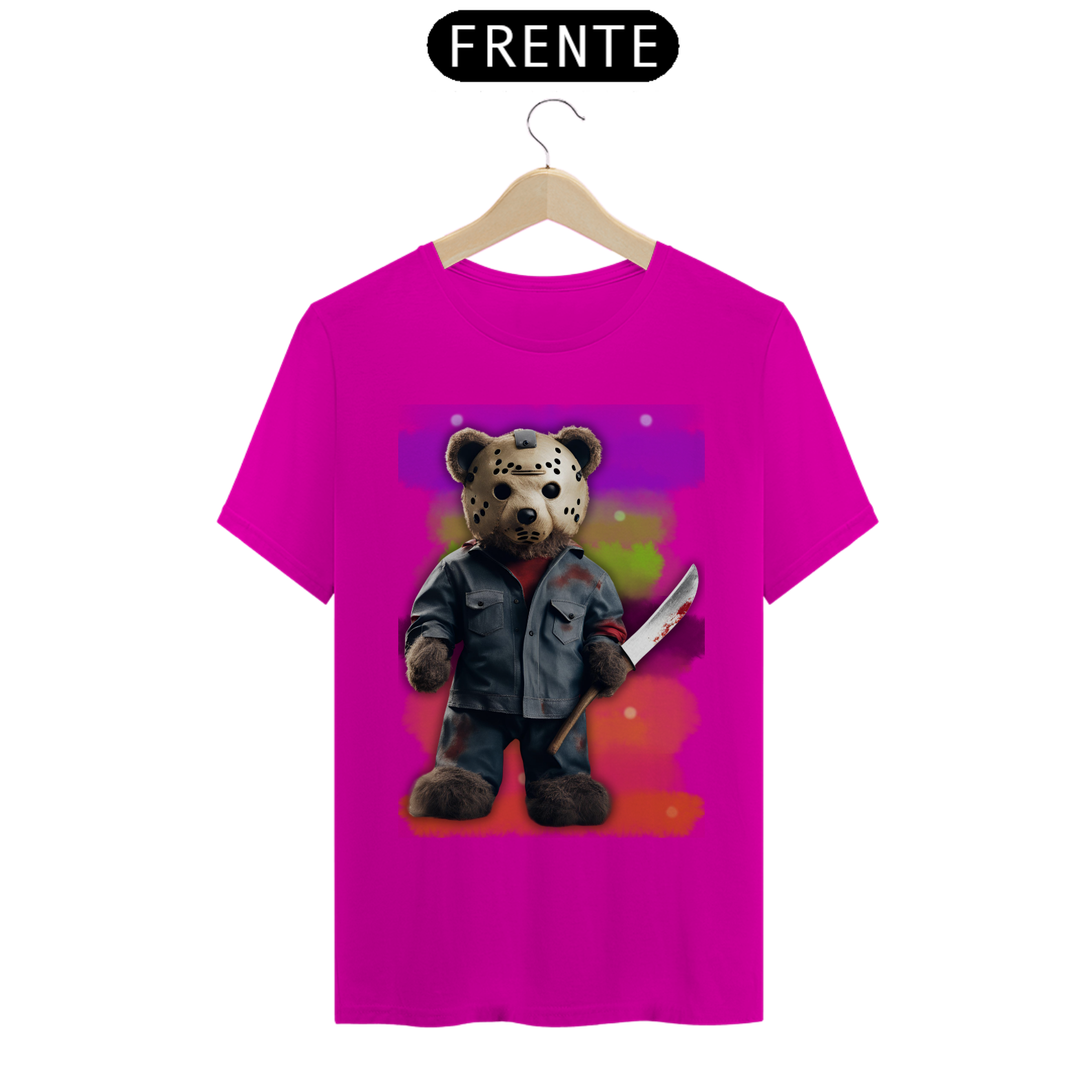 A estampa "Halloween Teddy Jason" traz uma releitura divertida e aterrorizante do clássico personagem de terror Jason Voorhees, combinando o icônico visual com a cultura Gay Bear. O ursão está vestido com uma roupa ensanguentada e segurando uma faca, trazendo uma mistura de fofura e horror que vai chamar a atenção em qualquer evento de Halloween. Ideal para quem deseja exibir seu orgulho Bear com um toque de humor sombrio, essa estampa é perfeita para a temporada assustadora. A combinação de um personagem icônico do horror com a estética Bear vai garantir que essa estampa seja um sucesso nas festas e eventos de Halloween!