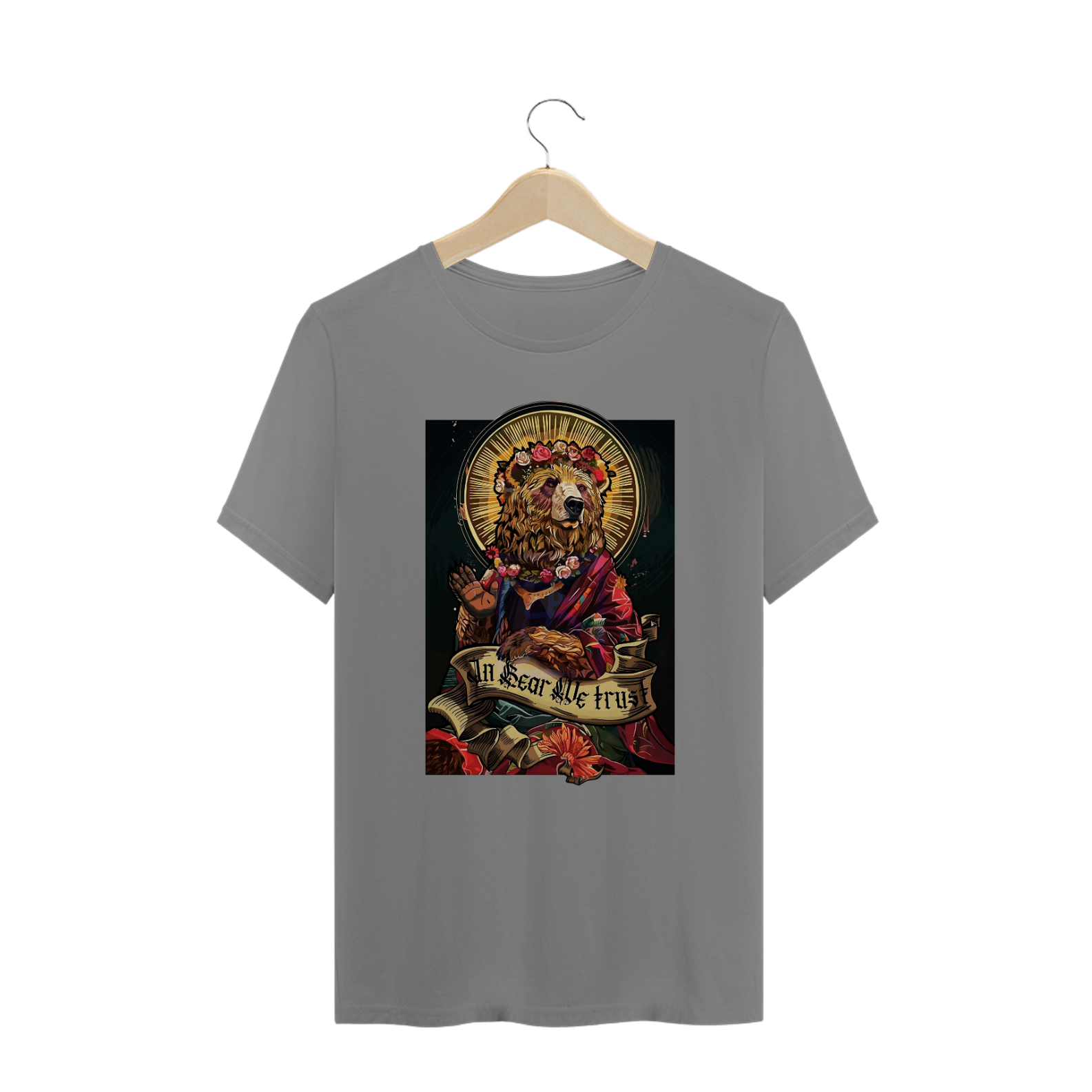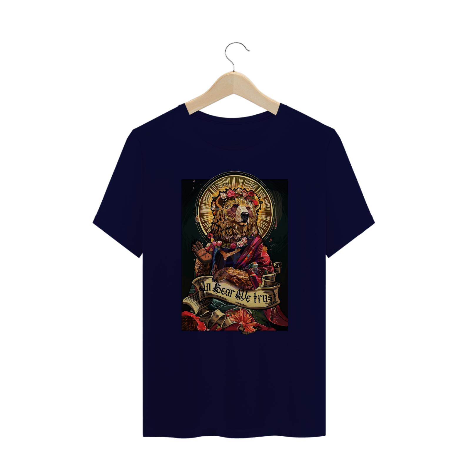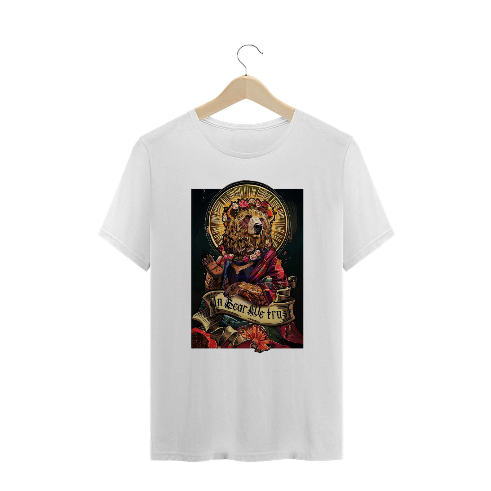 A estampa "In Bear We Trust" é uma representação majestosa que mistura elementos religiosos com a força e o orgulho da comunidade Gay Bear. O design apresenta um urso adornado com uma coroa de flores e envolto em um manto, remetendo a figuras de santidade e devoção. A frase "In Bear We Trust" estampada em uma faixa destaca a reverência pela cultura Bear, celebrando a união, o respeito e o poder dessa comunidade. Essa camiseta é perfeita para quem deseja exaltar sua identidade e orgulho Bear de forma simbólica e artística.