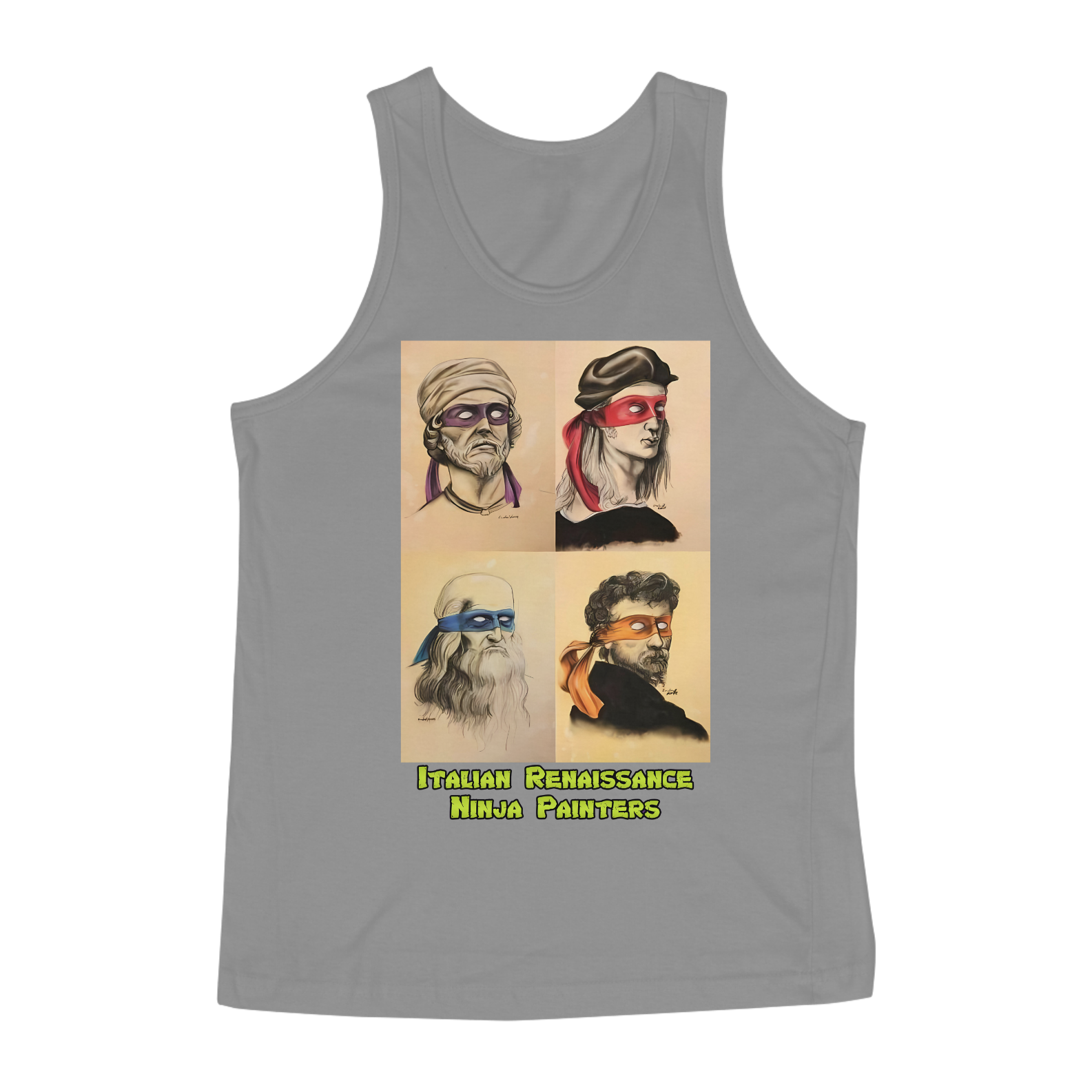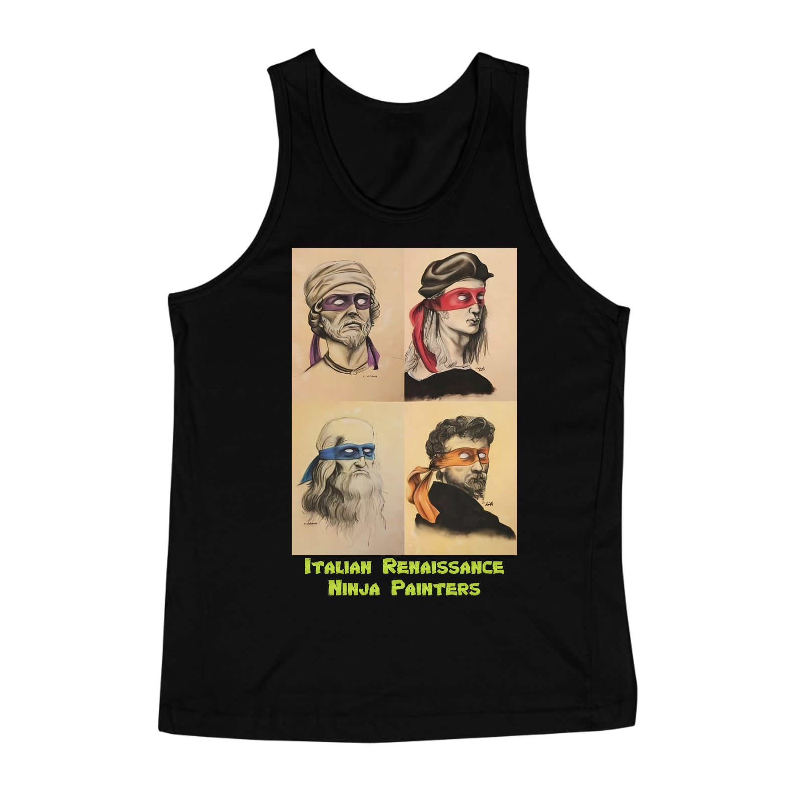 A estampa "Italian Renaissance Ninja Painters" é uma criação única e divertida, perfeita para a comunidade Gay Bear. A imagem combina os famosos pintores renascentistas italianos, como Leonardo da Vinci, Michelangelo, Donatello e Rafael, com o visual icônico das Tartarugas Ninja. Cada artista é retratado com uma máscara colorida, em referência ao popular grupo de ninjas mutantes, criando uma fusão intrigante de história da arte e cultura pop. A camiseta "Italian Renaissance Ninja Painters" é ideal para eventos da comunidade, encontros sociais ou para qualquer ocasião em que você queira expressar seu orgulho e senso de humor. Com um design que celebra tanto a arte clássica quanto a cultura geek, esta estampa é uma forma original e divertida de se destacar e celebrar a diversidade.