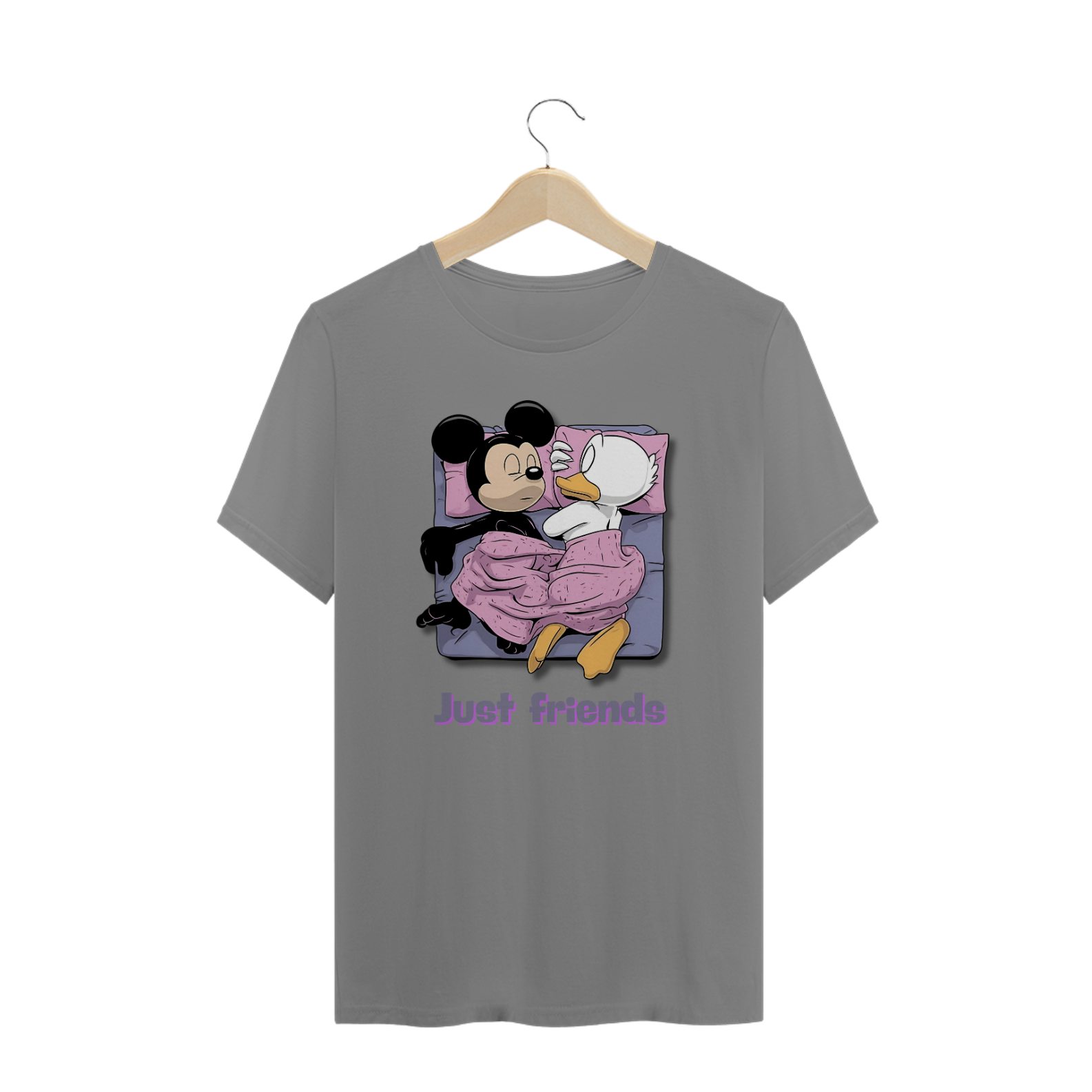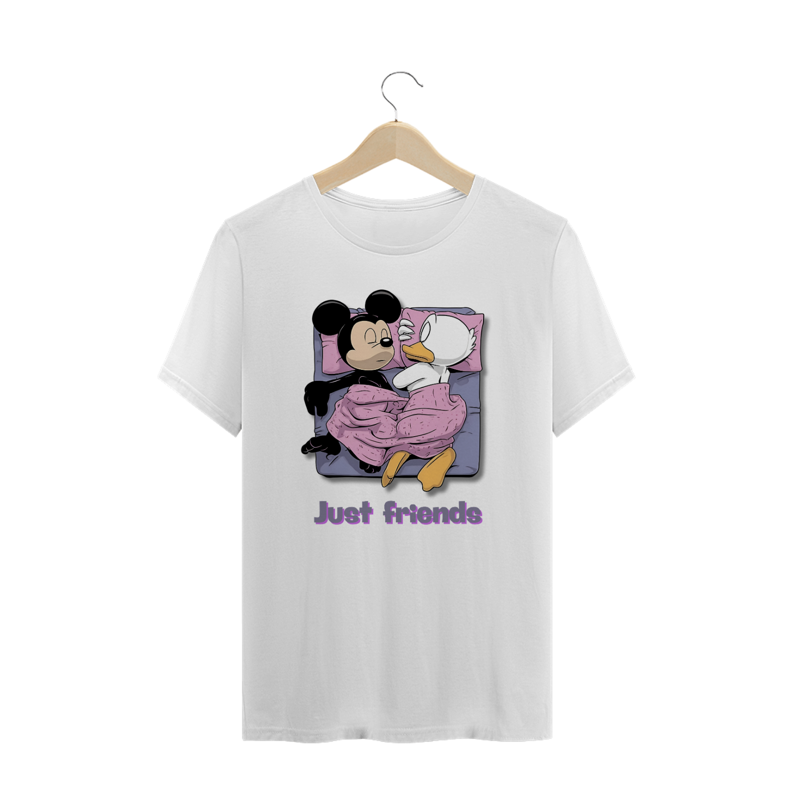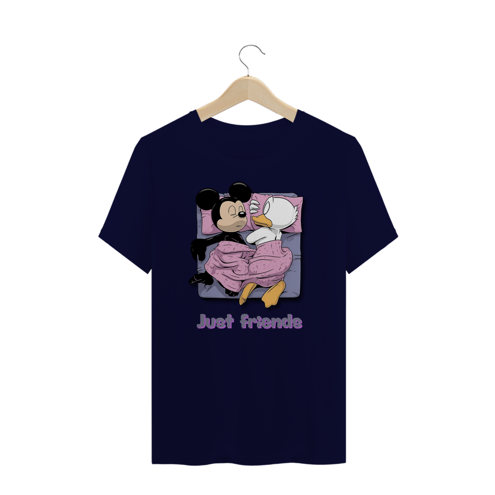 A estampa "Just Friends" traz uma abordagem divertida e provocante, perfeita para a comunidade Gay Bear. A imagem apresenta duas figuras icônicas de desenhos animados, Mickey Mouse e Pato Donald, deitados juntos em uma cama, sob um cobertor rosa, com a legenda "Just Friends" embaixo. Essa arte ousada e humorística desafia os estereótipos e celebra a amizade e a diversidade dentro da comunidade LGBTQ+, especialmente entre os Bears. É uma peça ideal para quem quer mostrar seu senso de humor e orgulho de maneira leve e descontraída. Esta estampa é perfeita para eventos sociais, encontros de comunidade, ou simplesmente para adicionar um toque de humor ao seu dia a dia. Com sua combinação de elementos clássicos da cultura pop e uma mensagem inclusiva, a camiseta "Just Friends" é uma adição irresistível ao guarda-roupa de qualquer Bear orgulhoso e bem-humorado.