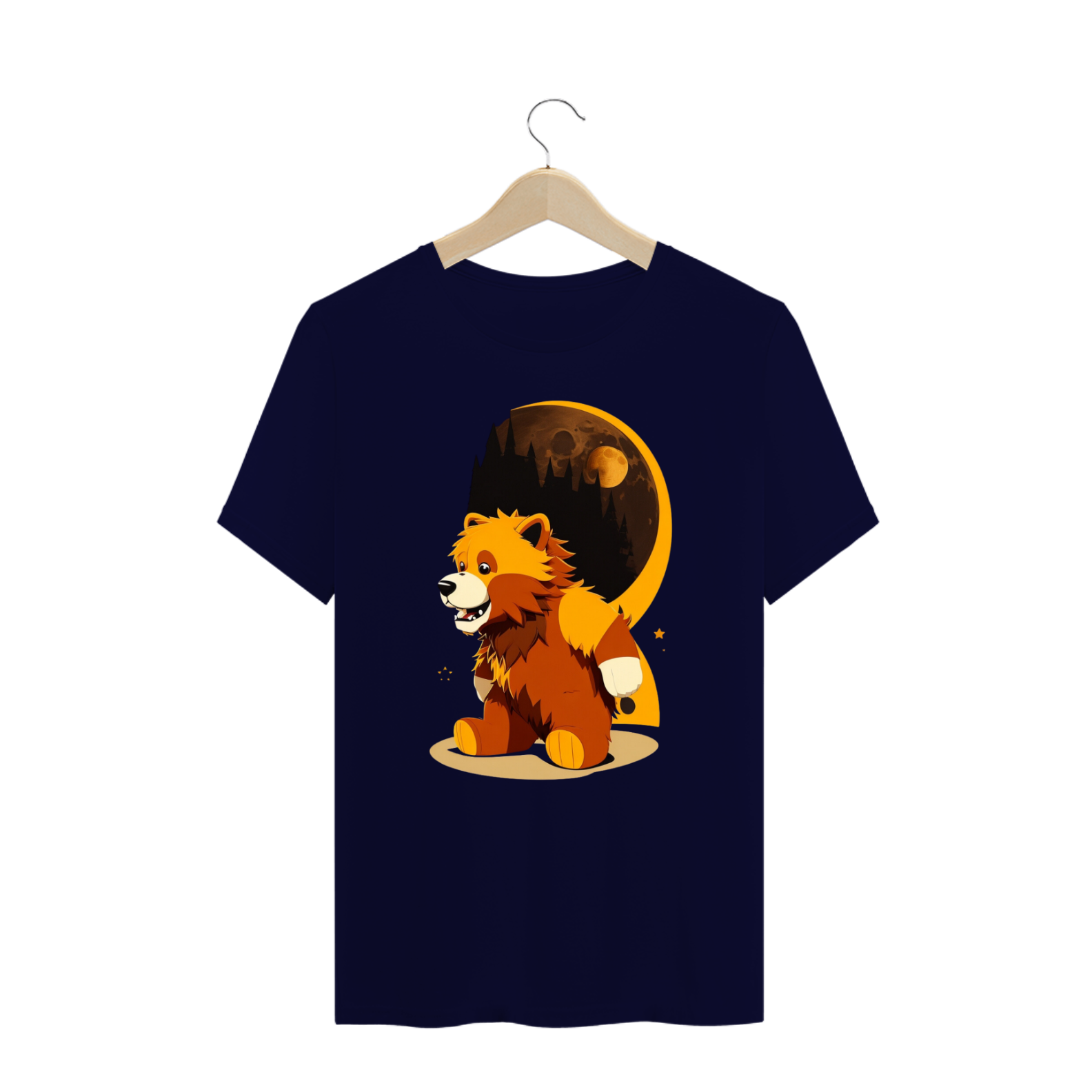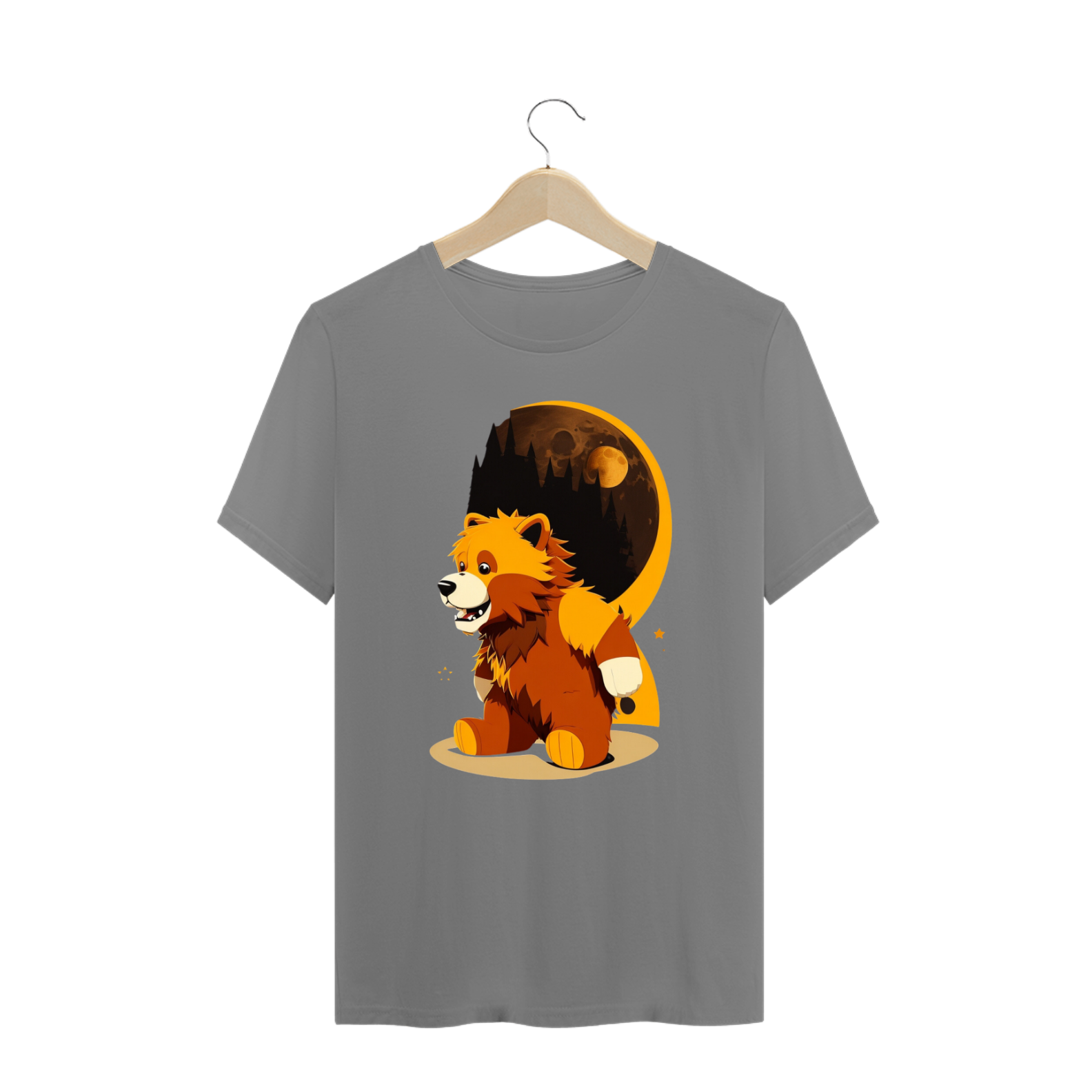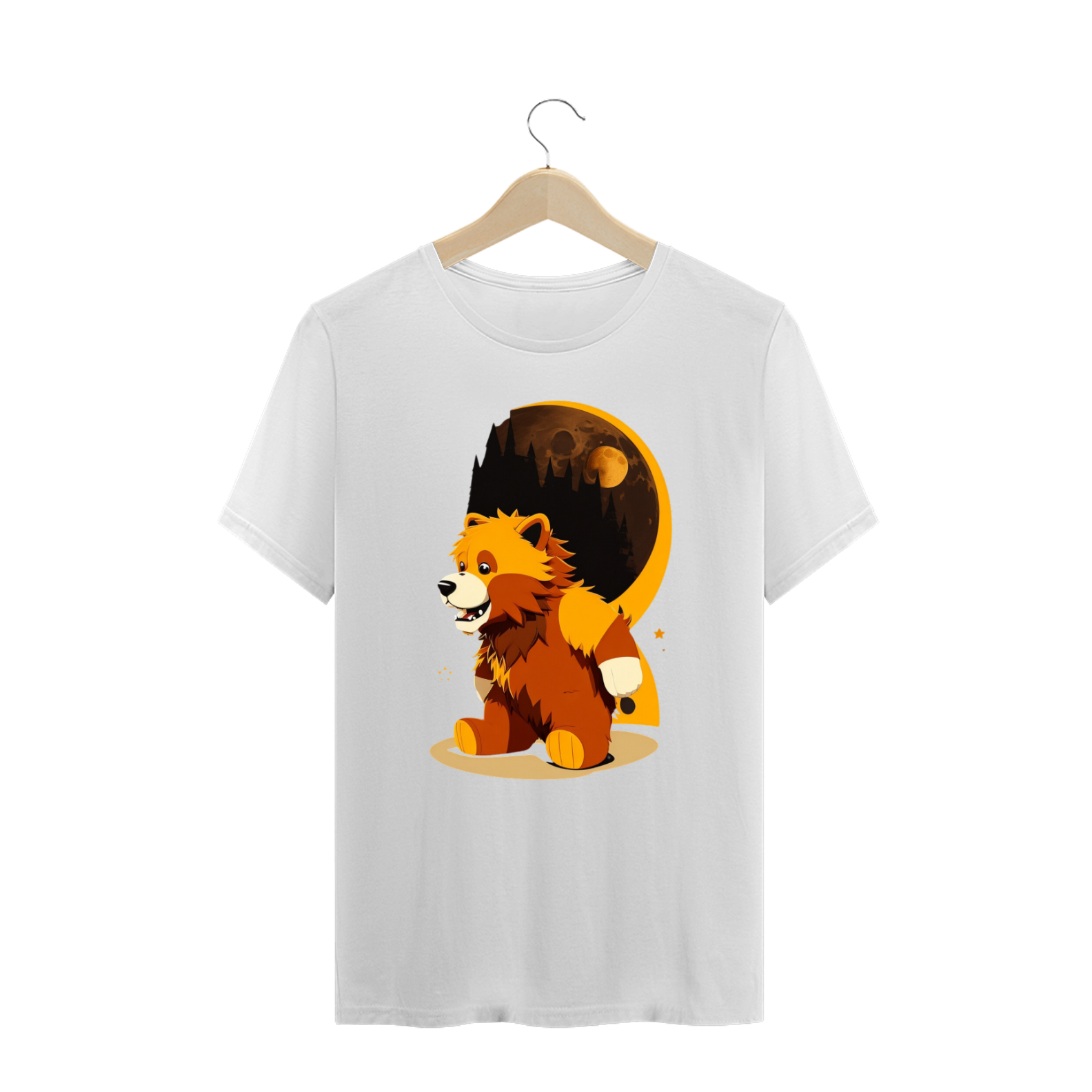 O ursinho Lobisomem possui pelagem exuberante e olhos penetrantes, transmitindo uma aura de mistério e força. Suas garras afiadas e dentes expostos demonstram seu lado selvagem, enquanto sua expressão facial revela sua essência gentil e amorosa. A estampa é repleta de detalhes, com sombras e texturas que criam uma atmosfera envolvente.