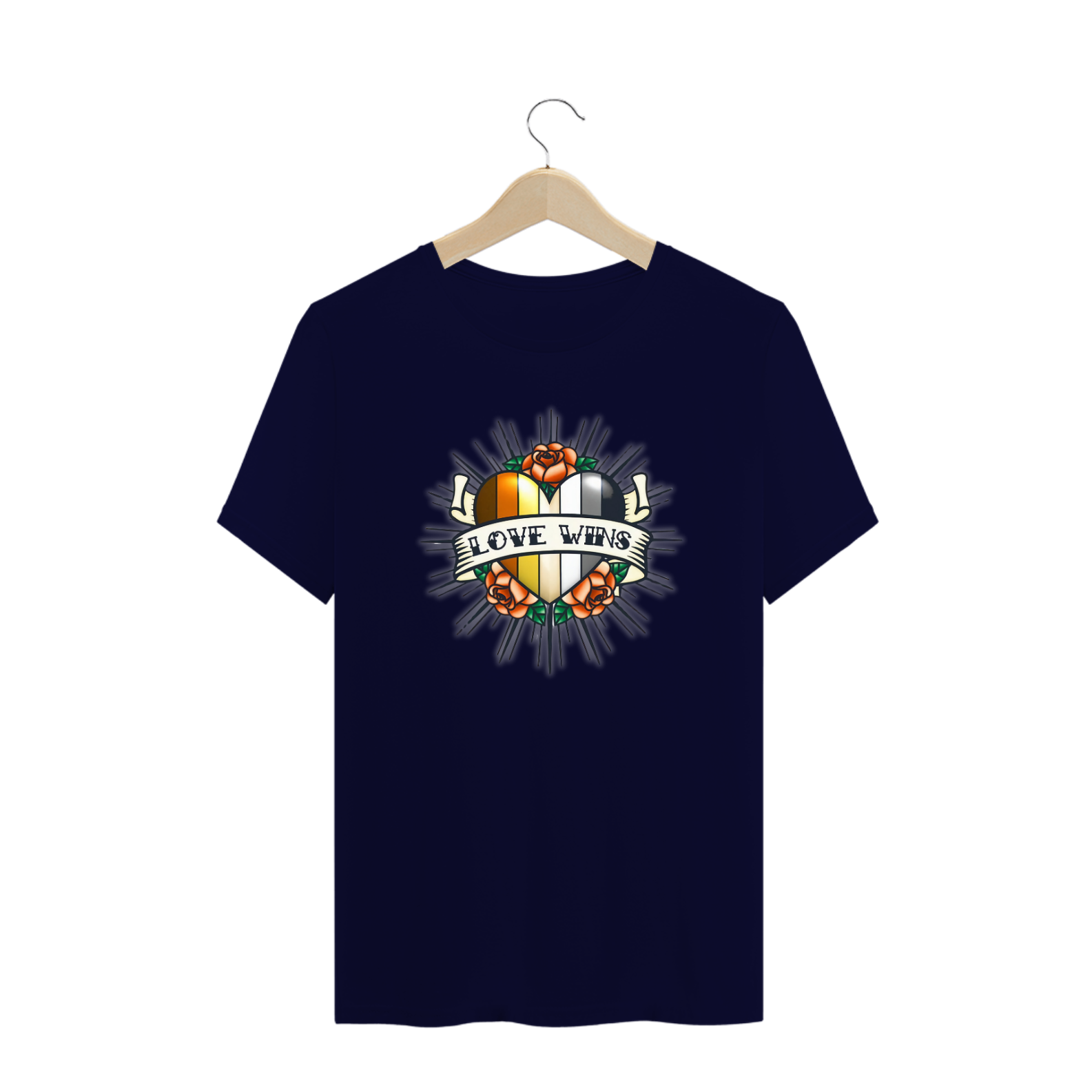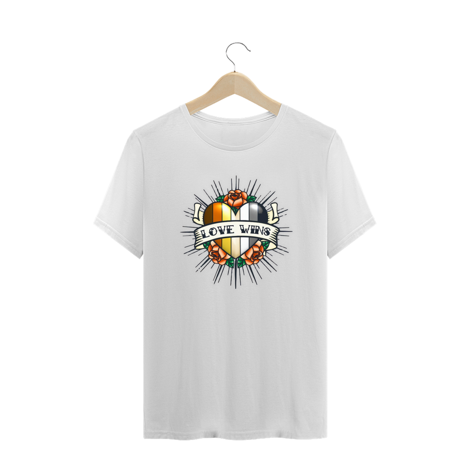 Esta estampa tocante e expressiva apresenta um coração preenchido com as vibrantes cores da bandeira Gay Bear, cercado por rosas, simbolizando o amor e a vitalidade dentro da comunidade. Uma faixa sobreposta com a mensagem poderosa 'Love Wins' destaca a força e o triunfo do amor em todas as suas formas. Essa peça é mais do que uma simples camiseta; é um símbolo visual de união, igualdade e orgulho, perfeito para quem busca expressar seu apoio à comunidade Gay Bear e celebrar a vitória do amor.
