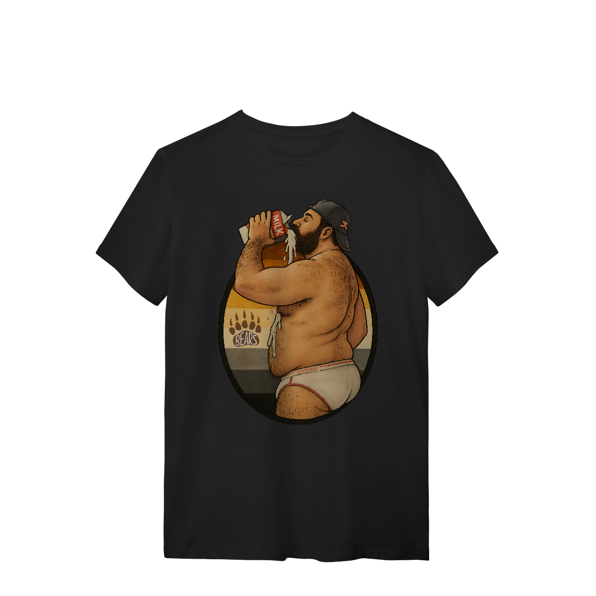 Essa estampa ousada e divertida é puro suco da estética gay bear! Um urso barbudo, de cueca branca justinha e boné virado para trás, bebe leite de forma provocante, com respingos escorrendo em destaque sensual. Ao fundo, as cores da bandeira Bear Pride reforçam o orgulho da identidade urso, celebrando corpos reais, desejos e a liberdade de ser quem se é. Perfeita para quem ama provocar com bom humor e sensualidade, essa camiseta é ideal para festivais LGBTQIA+, festas de ursos, paradas do orgulho ou simplesmente para expressar sua autenticidade com um toque atrevido. Se você é fã da cultura bear, daddy vibes, e curte estampar sua atitude, essa é sua peça!