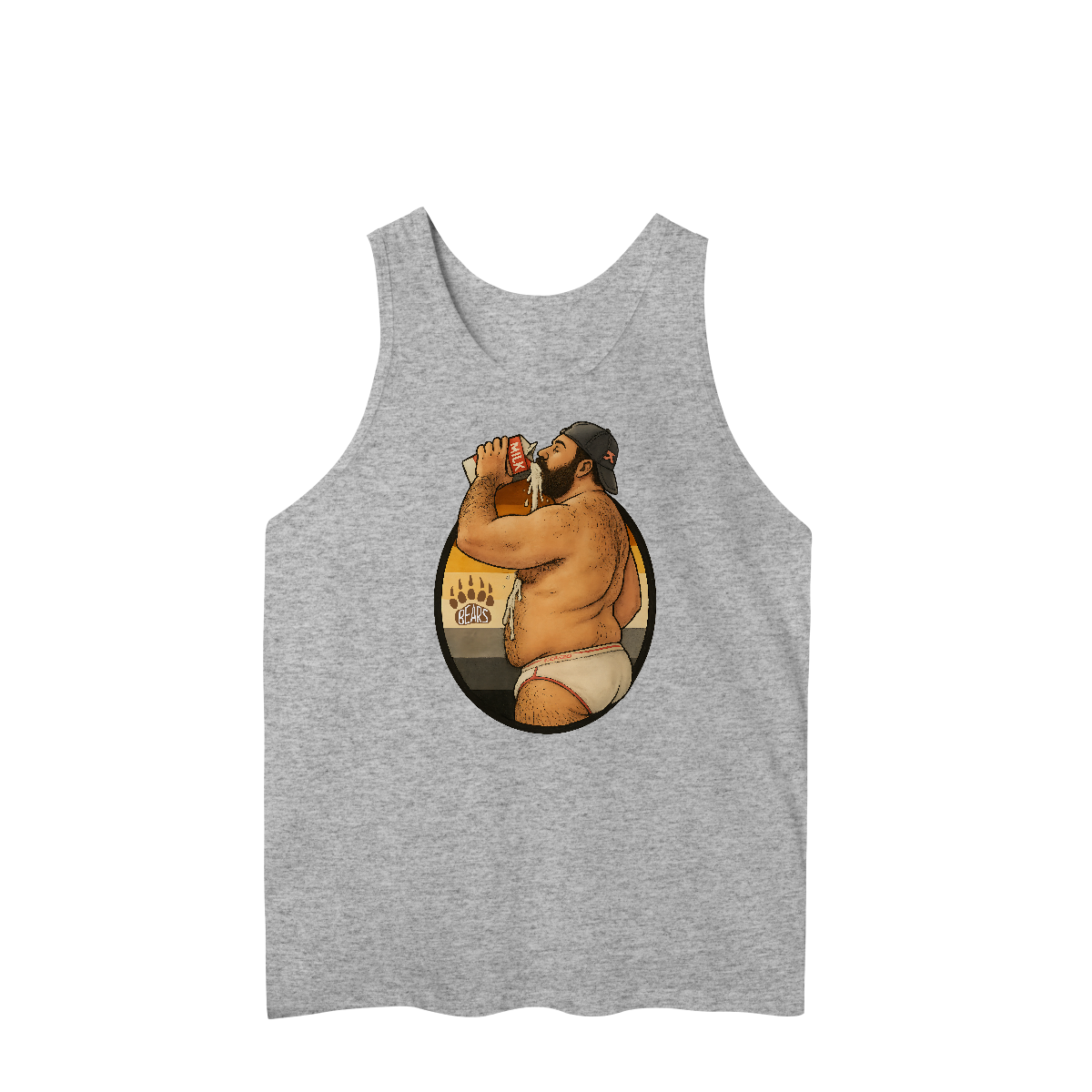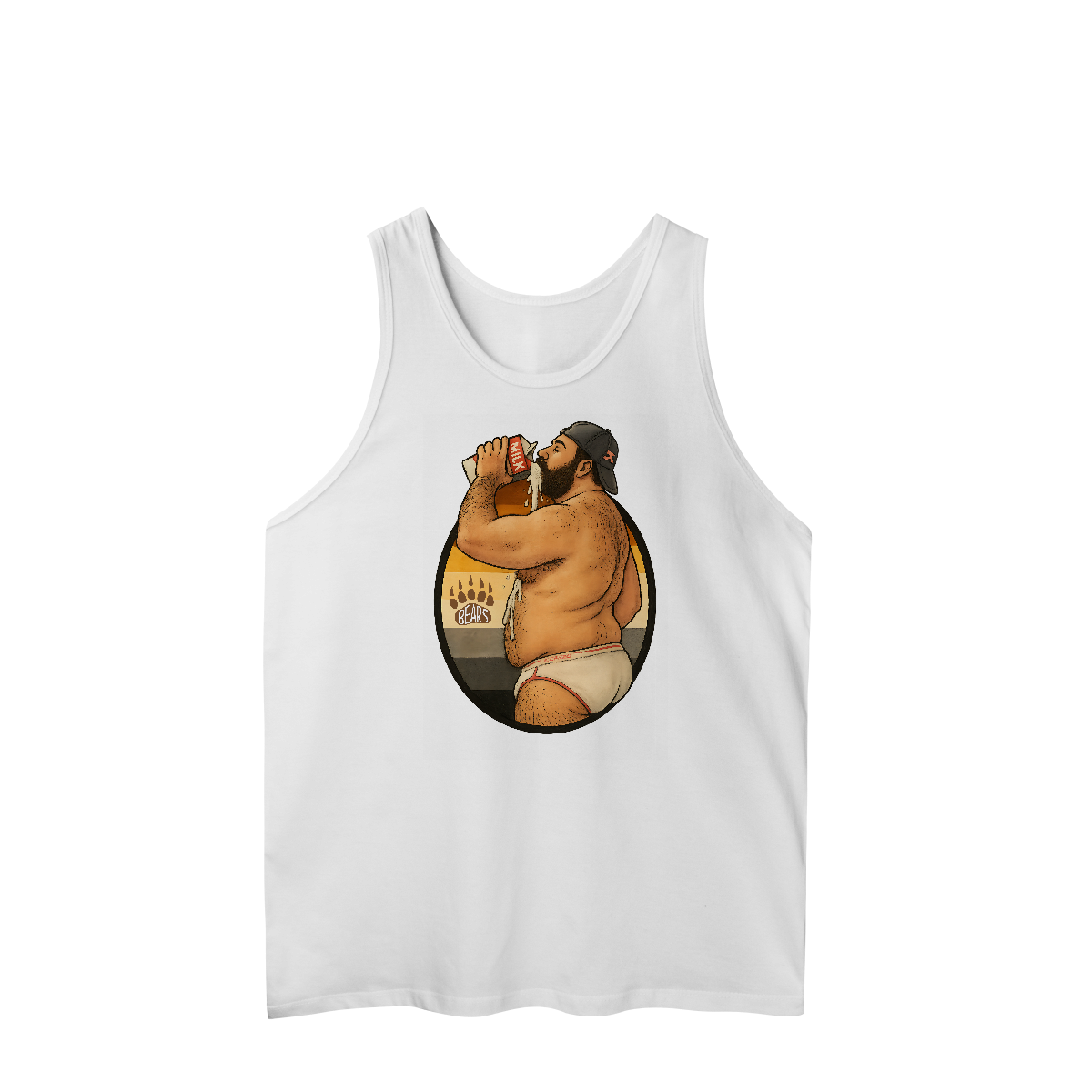 Essa estampa ousada e divertida é puro suco da estética gay bear! Um urso barbudo, de cueca branca justinha e boné virado para trás, bebe leite de forma provocante, com respingos escorrendo em destaque sensual. Ao fundo, as cores da bandeira Bear Pride reforçam o orgulho da identidade urso, celebrando corpos reais, desejos e a liberdade de ser quem se é. Perfeita para quem ama provocar com bom humor e sensualidade, essa camiseta é ideal para festivais LGBTQIA+, festas de ursos, paradas do orgulho ou simplesmente para expressar sua autenticidade com um toque atrevido. Se você é fã da cultura bear, daddy vibes, e curte estampar sua atitude, essa é sua peça!
