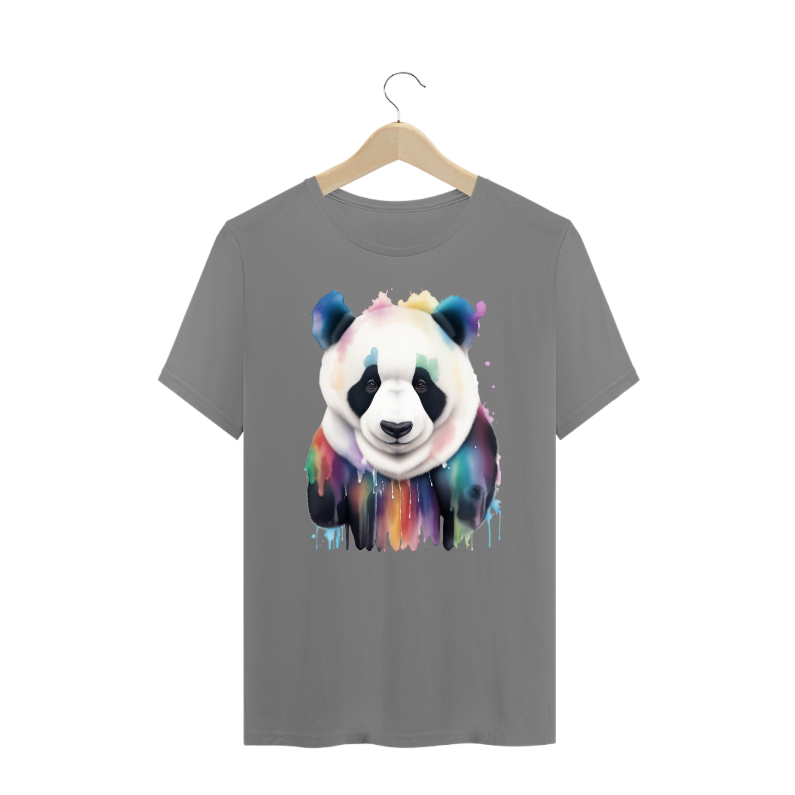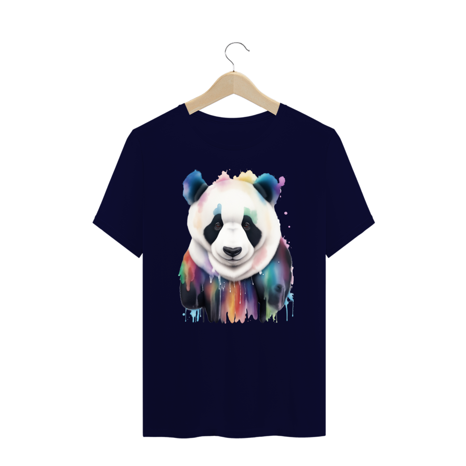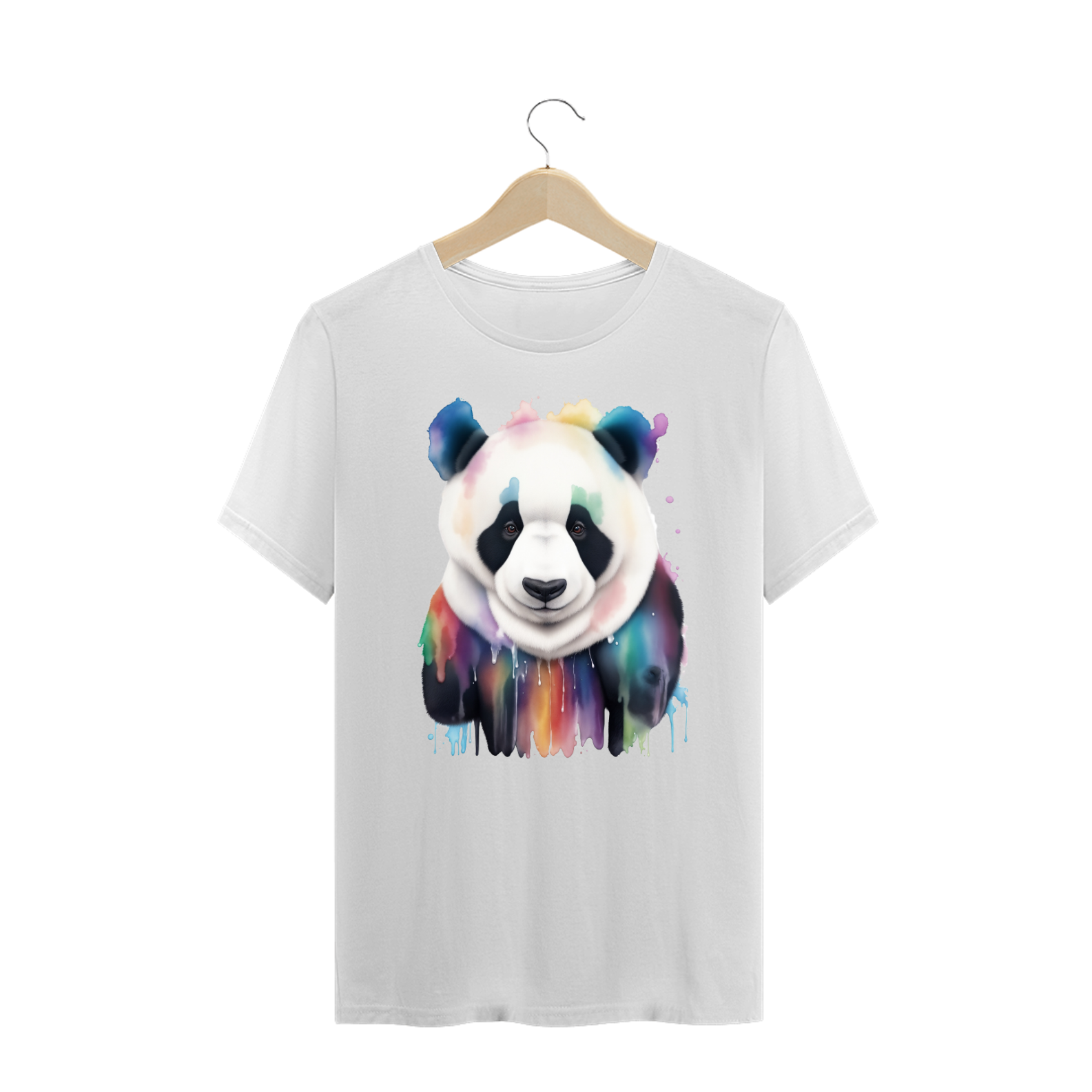A aquarela, com suas nuances suaves e transições fluidas, adiciona um elemento artístico e emocional à estampa. O contraste entre a pelagem preta e branca do urso e as cores vivas do arco-íris cria um equilíbrio visual que é tanto impactante quanto harmonioso.