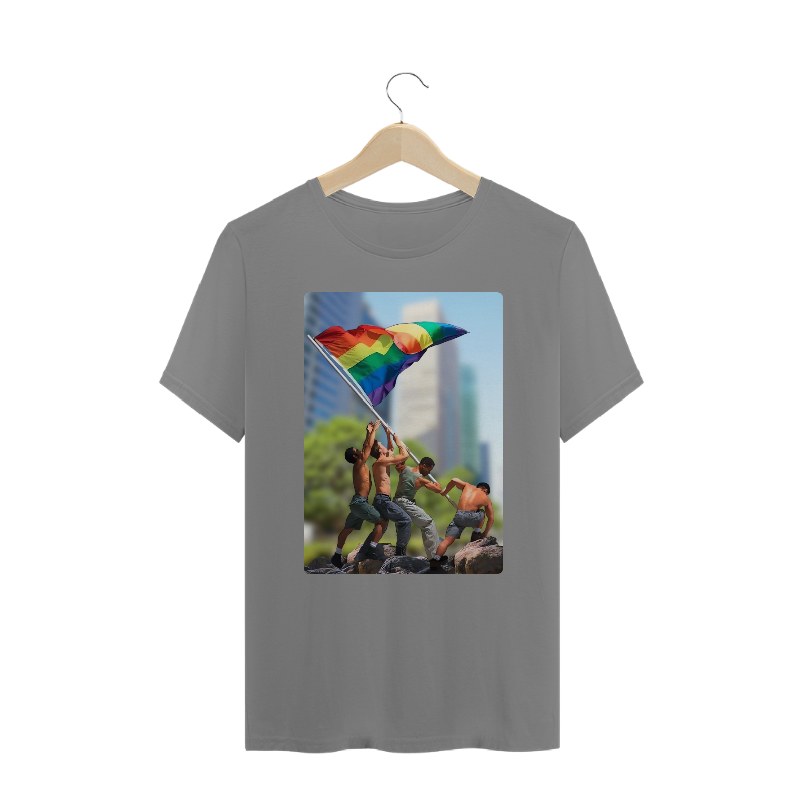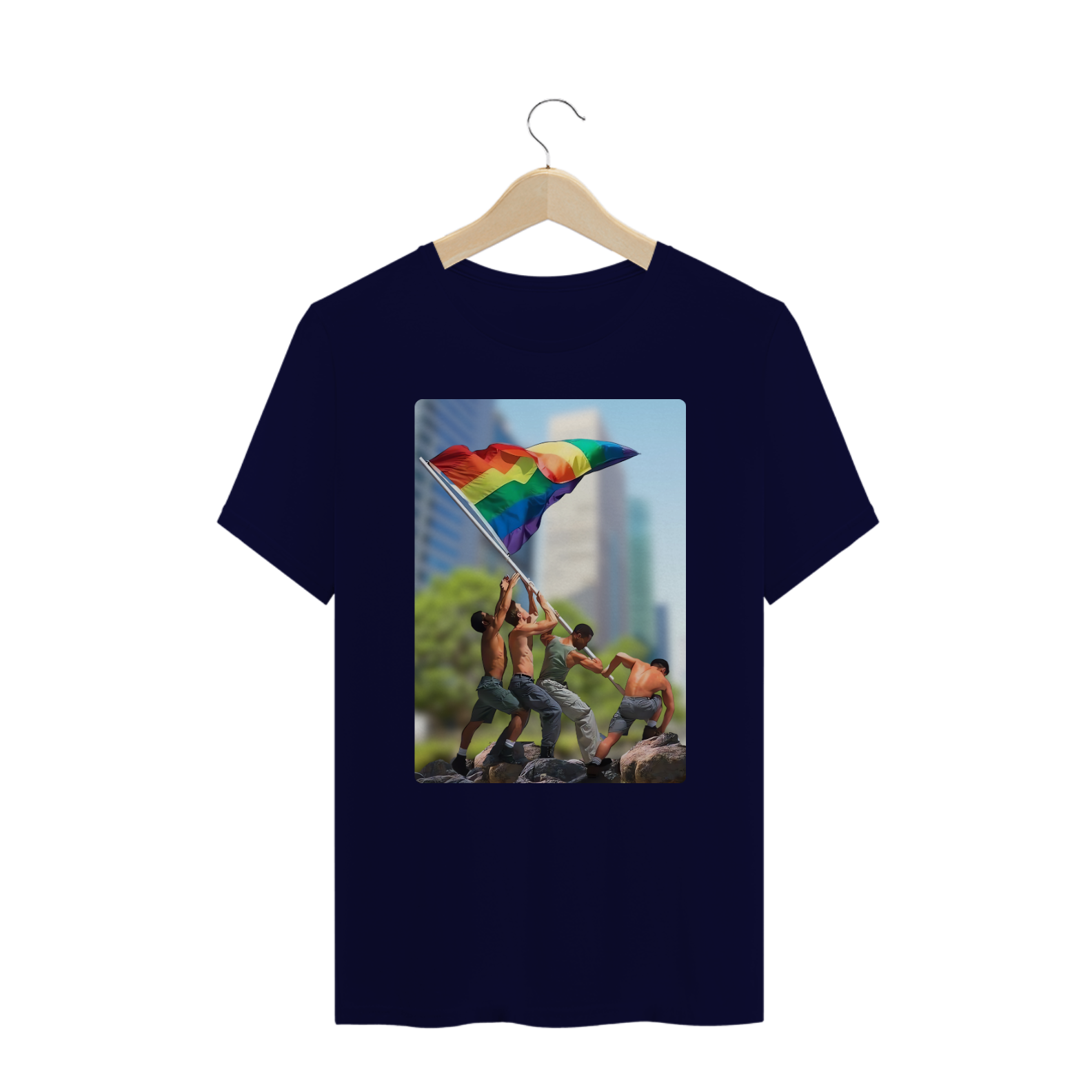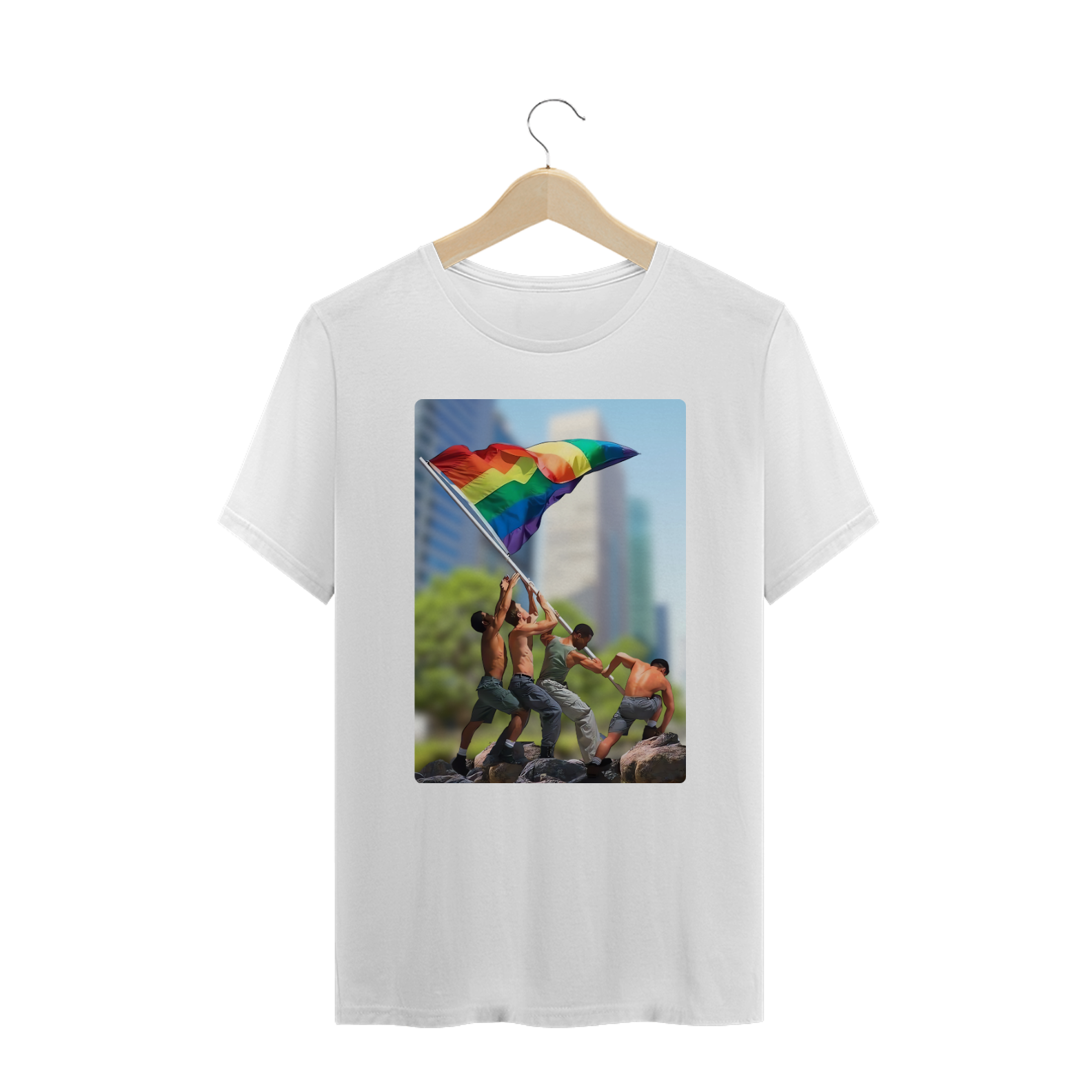 A estampa "Raising Pride Together" é uma poderosa homenagem à união e à luta da comunidade LGBTQIA+. Inspirada na icônica imagem da bandeira sendo erguida, a arte apresenta um grupo de homens em um esforço conjunto para hastear a bandeira do arco-íris, simbolizando força, resistência e orgulho coletivo. Essa peça vibrante reflete o espírito de união e camaradagem que caracteriza a comunidade Gay Bear e seus aliados. Com um design dinâmico e marcante, esta camiseta é perfeita para eventos como Paradas do Orgulho, encontros LGBTQIA+ ou para expressar seu compromisso com a diversidade no cotidiano. "Raising Pride Together" é mais do que uma peça de roupa – é um manifesto visual de amor, igualdade e resistência.