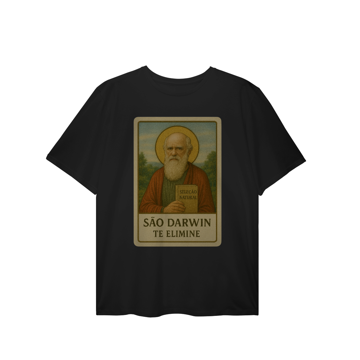 Esta estampa de camiseta apresenta uma ilustração cheia de personalidade de Charles Darwin como um santo, segurando nas mãos o livro “Seleção Natural”. A imagem mistura humor, ciência e arte sacra de forma inovadora, mostrando o pai da evolução como um ícone quase divino. Uma combinação perfeita para pessoas que apreciam a ciência, a teoria da evolução e o estilo vintage nas suas peças de roupa. Com a expressão “São Darwin te elimine”, esta camiseta revela um lado irônico e ousado, sendo uma ótima opção para usar no dia a dia, nas rodas de discussão ou para dar um toque de originalidade ao seu estilo. Uma estampa perfeita para nerds, biólogos, amantes da história da ciência e todos que buscam uma camiseta cheia de atitude, criatividade e humor.