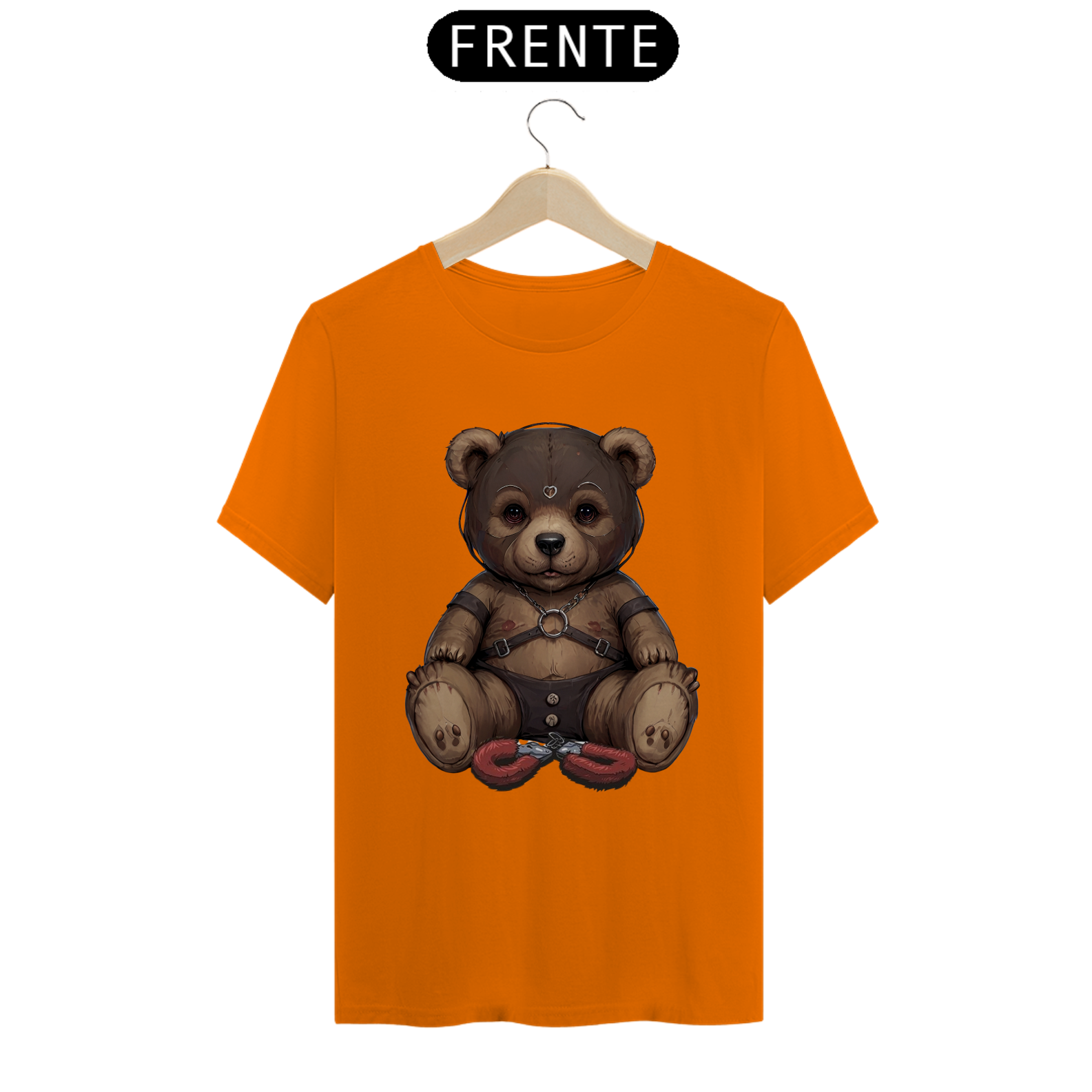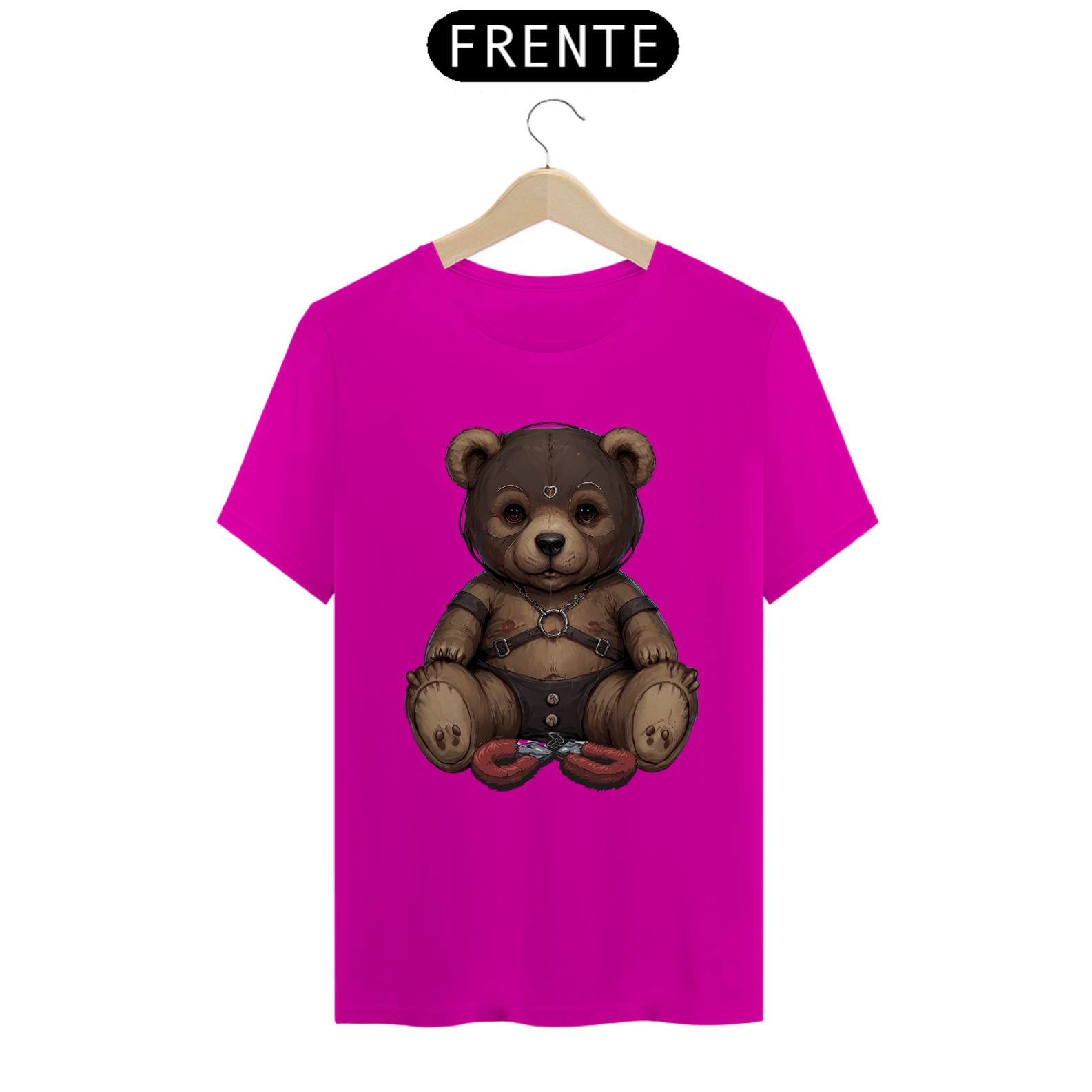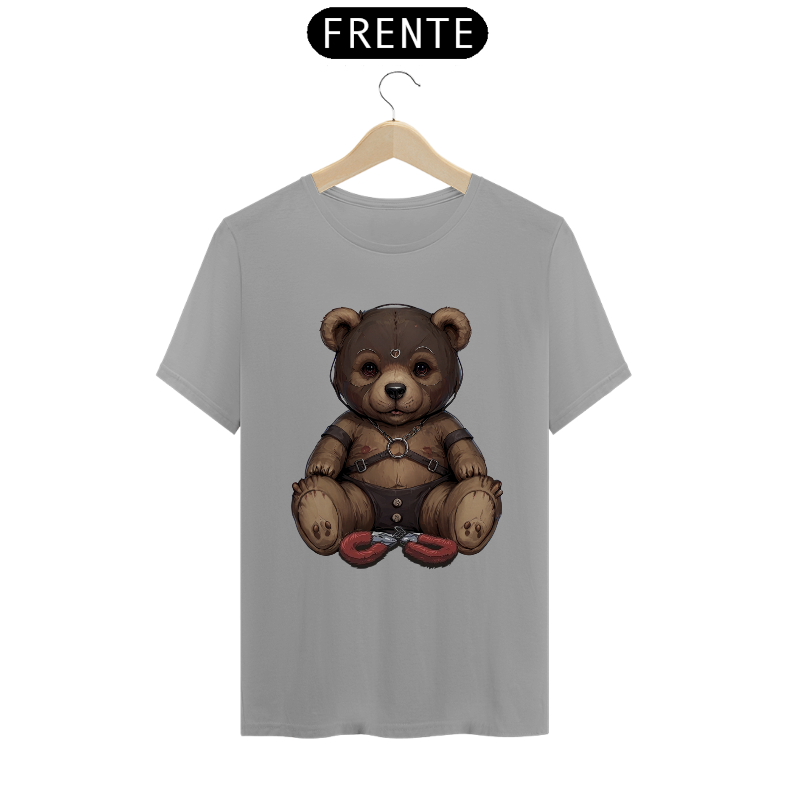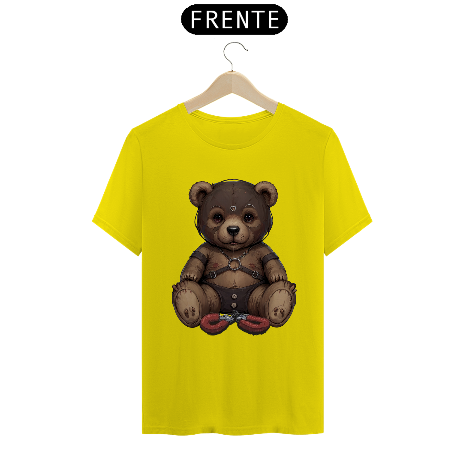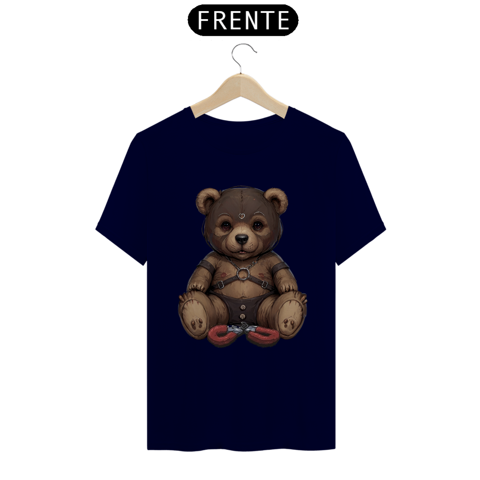 Esta camiseta provocante é uma expressão audaciosa da sensualidade e da diversidade dentro da comunidade Gay Bear, apresentando um ursinho aficionado por S&M. Vestindo uma máscara de couro, harness e uma sunga de couro, ele é representado de forma ousada e confiante. As algemas de pelúcia entre suas pernas adicionam um toque de brincadeira à imagem, enquanto celebra a liberdade de expressão e o empoderamento sexual dentro da comunidade LGBTQ+.