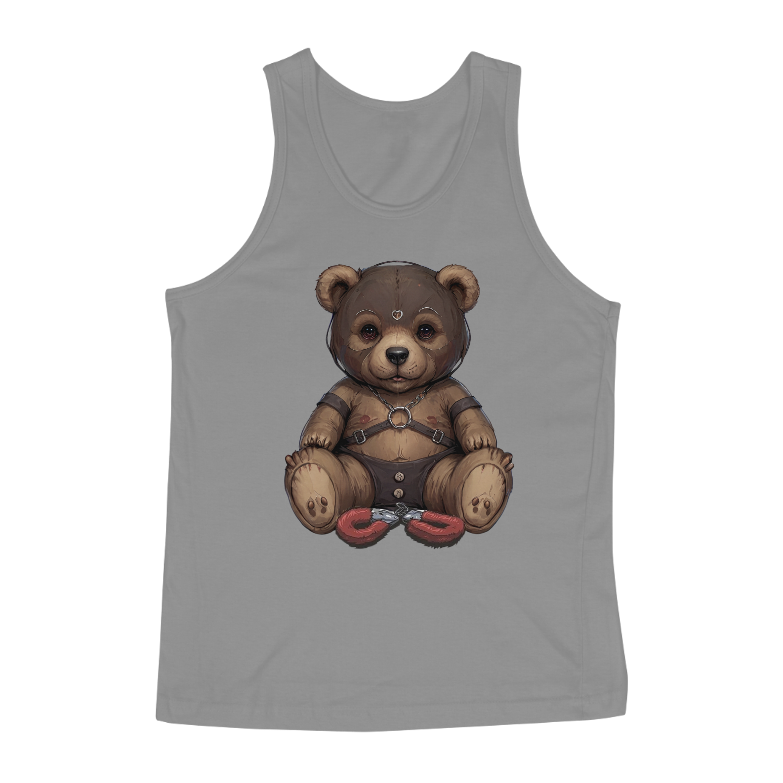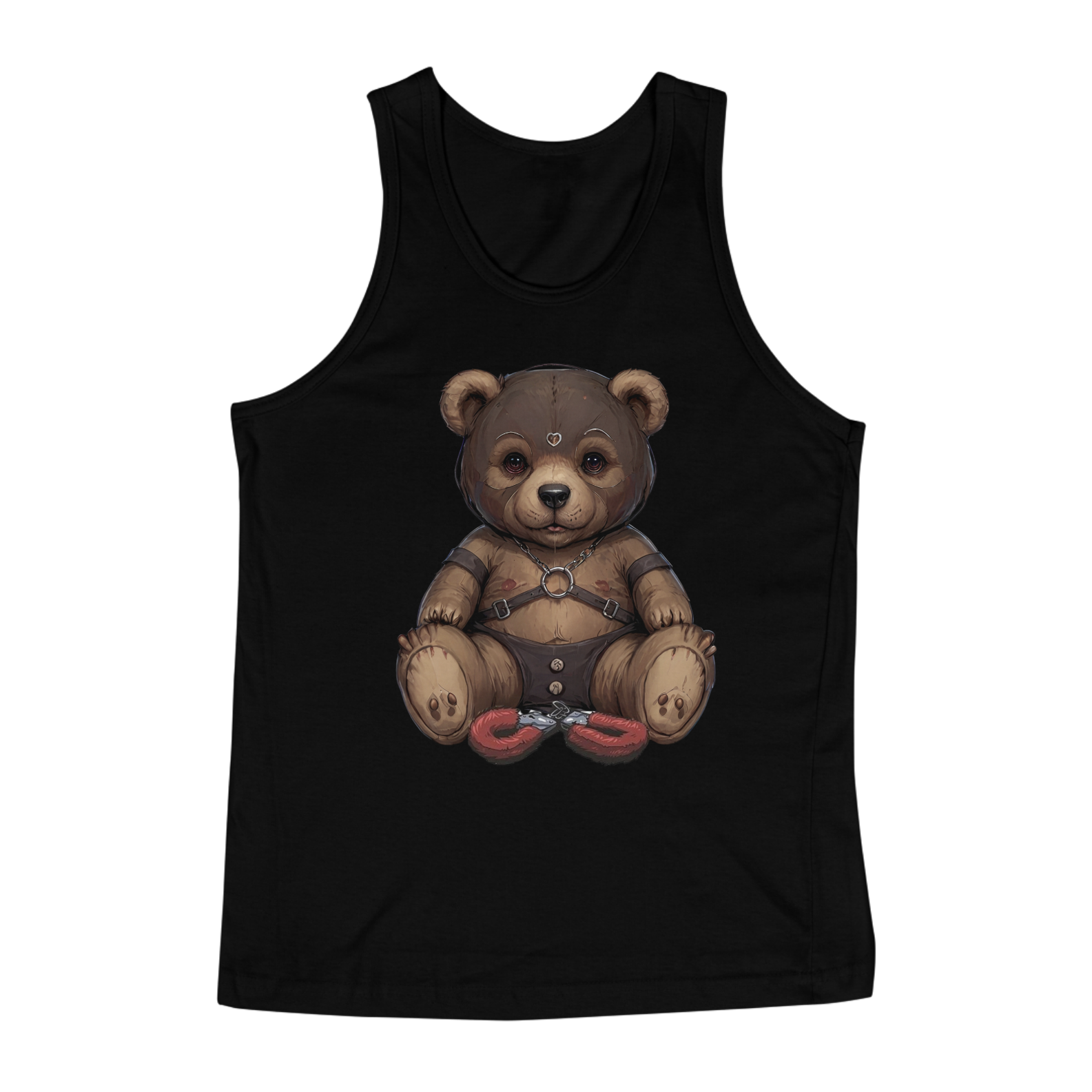 Esta camiseta provocante é uma expressão audaciosa da sensualidade e da diversidade dentro da comunidade Gay Bear, apresentando um ursinho aficionado por S&M. Vestindo uma máscara de couro, harness e uma sunga de couro, ele é representado de forma ousada e confiante. As algemas de pelúcia entre suas pernas adicionam um toque de brincadeira à imagem, enquanto celebra a liberdade de expressão e o empoderamento sexual dentro da comunidade LGBTQ+.