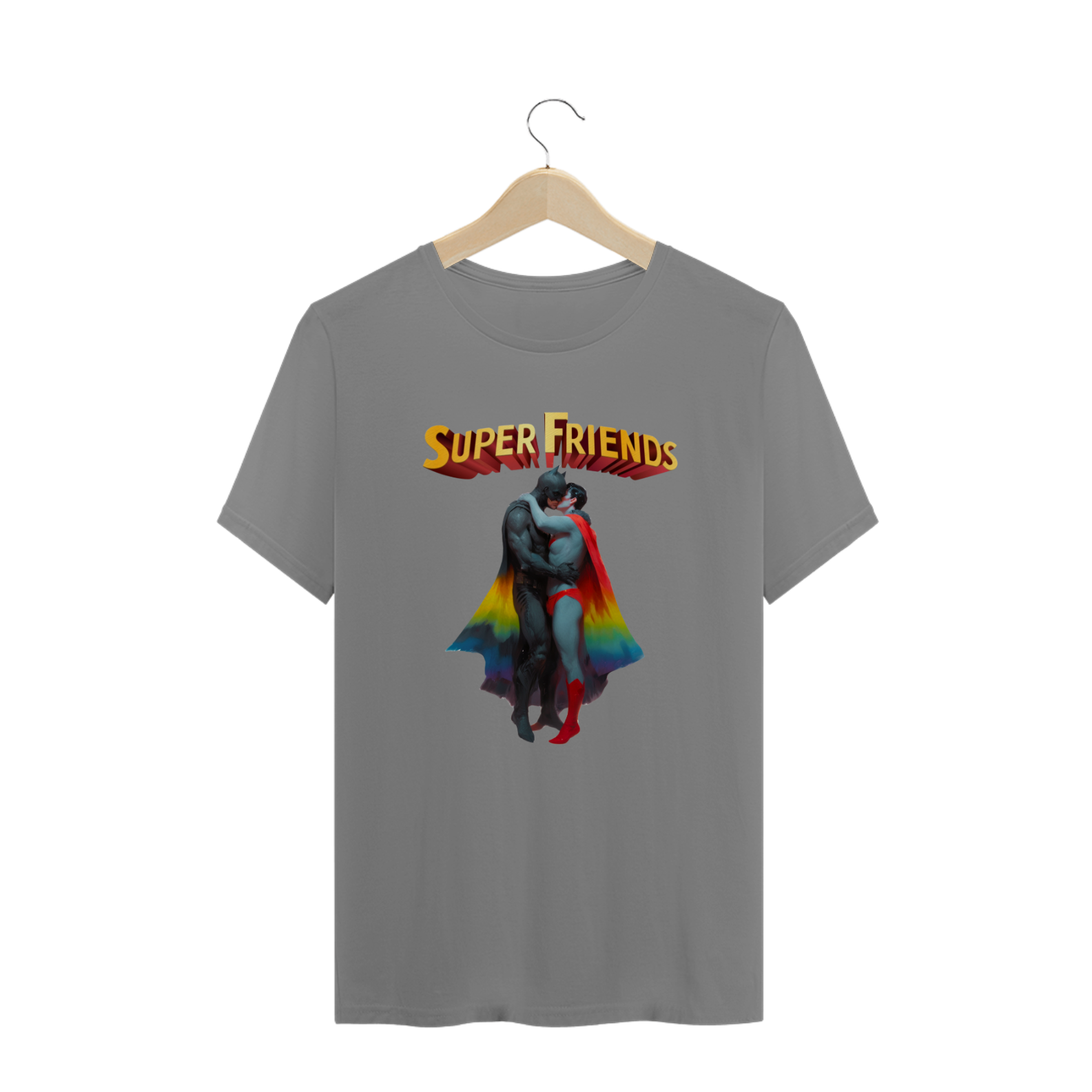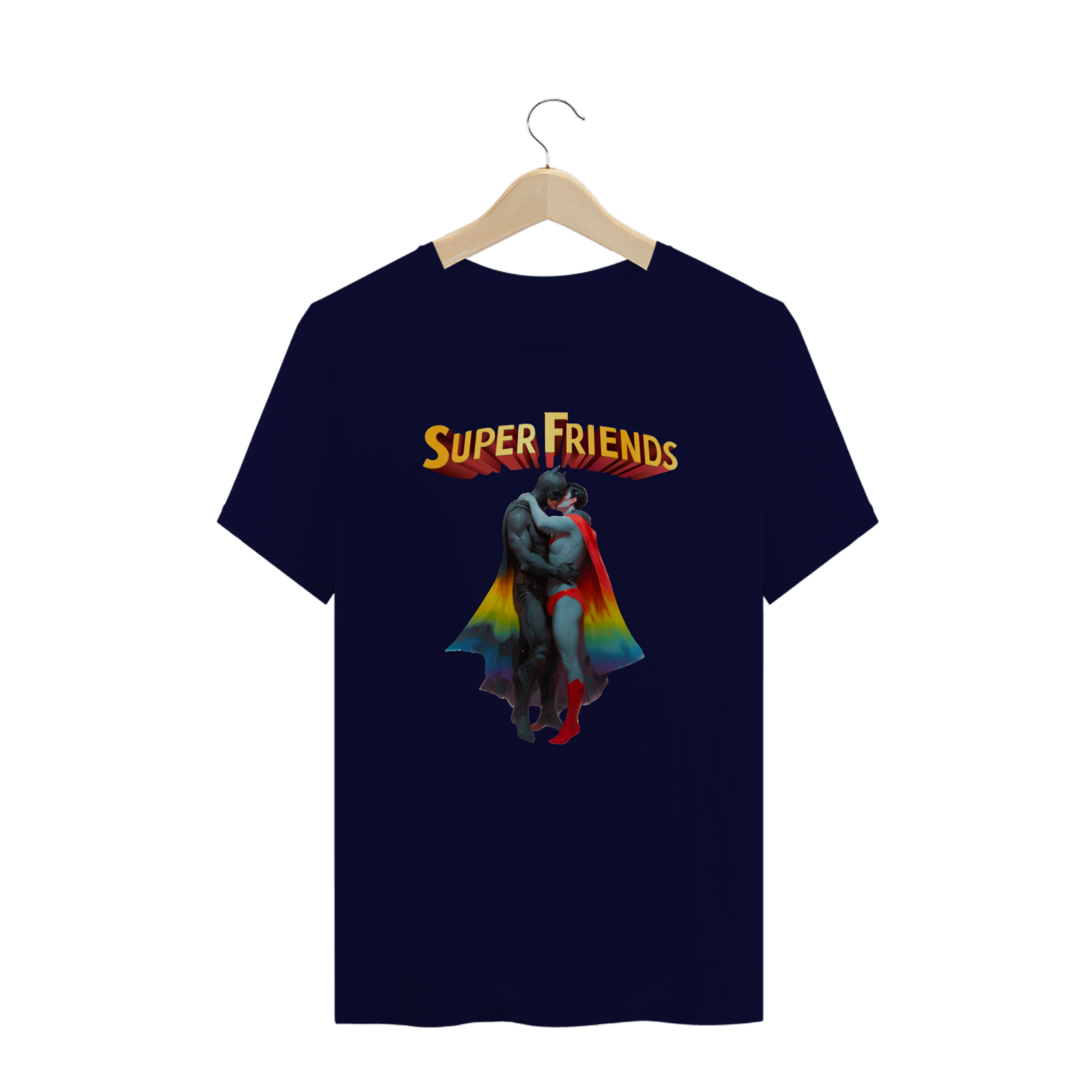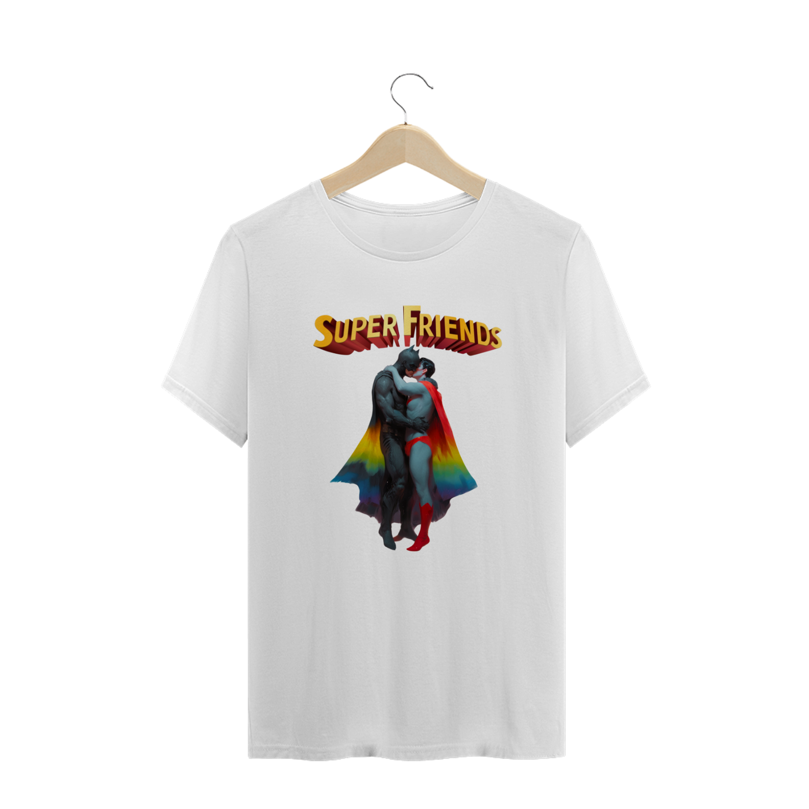 Liberte seu lado heróico com esta estampa ousada e empoderadora, que mostra Batman e Superman abraçados e se beijando apaixonadamente. Esta representação única e provocadora é uma celebração do amor e da diversidade dentro da comunidade Gay Bear, unindo ícones de super-heróis com uma mensagem de igualdade e aceitação. Esta camiseta é uma declaração corajosa de orgulho LGBTQ+ e uma afirmação do direito de amar livremente, independentemente de quem você seja.
